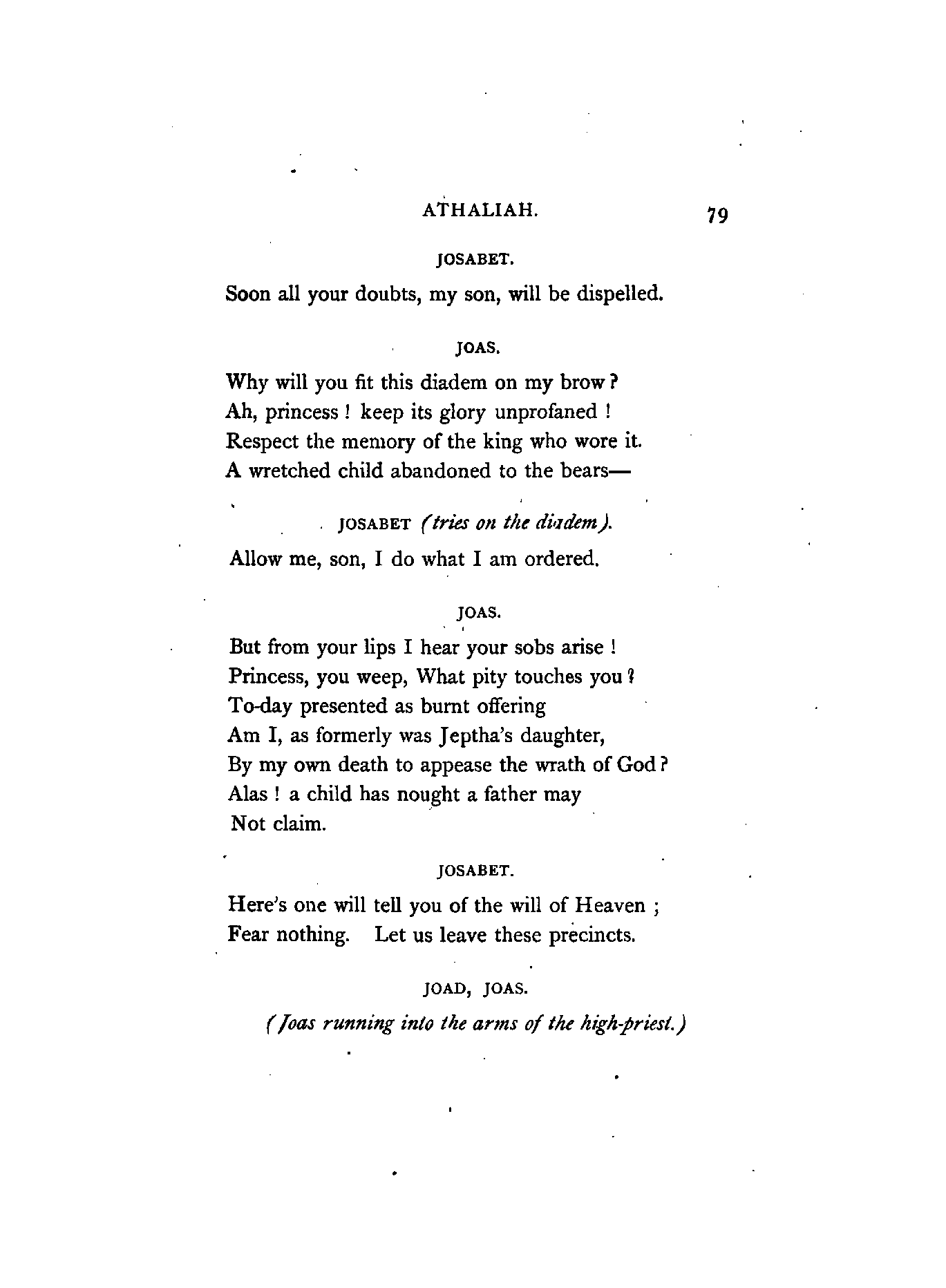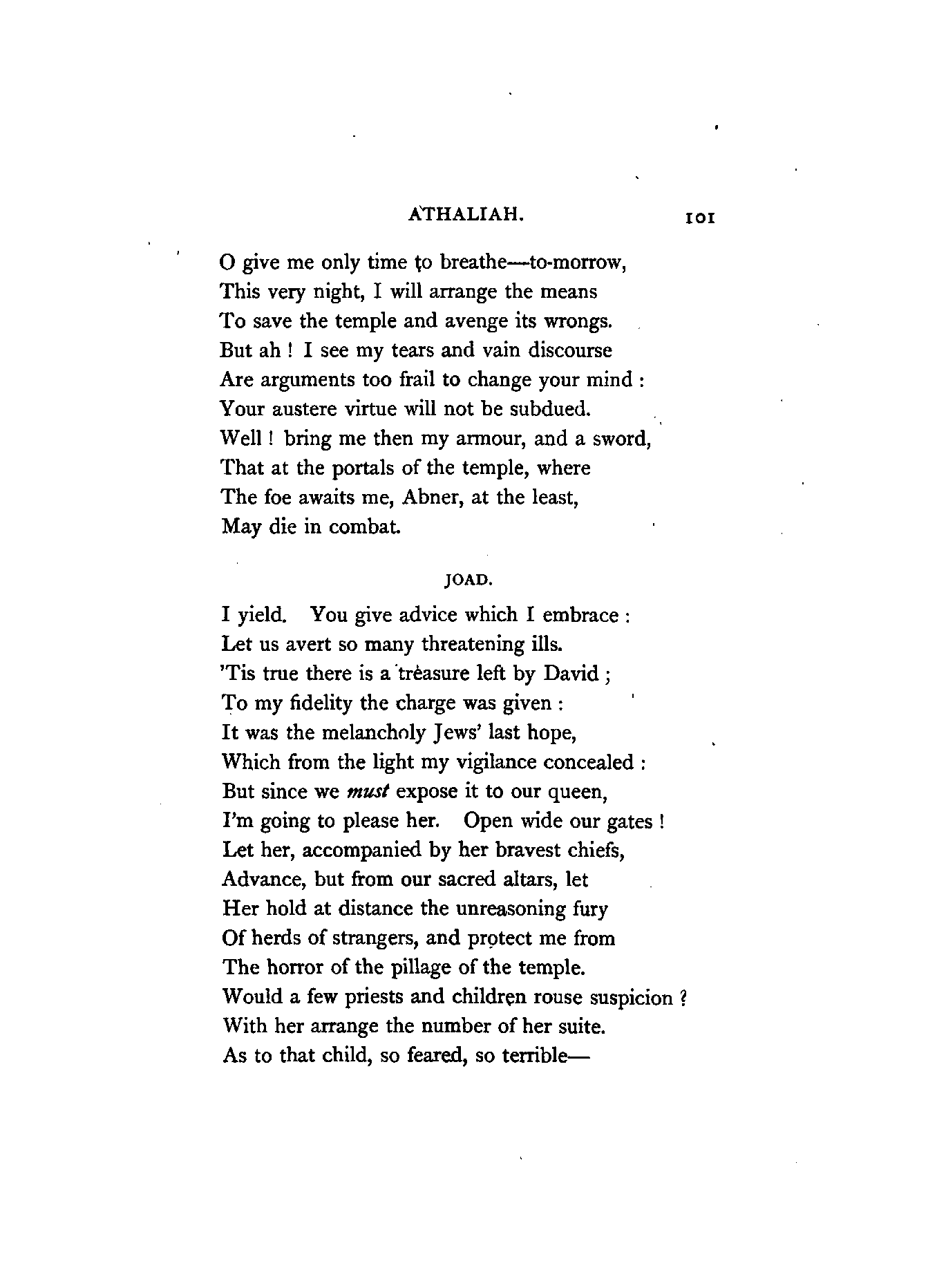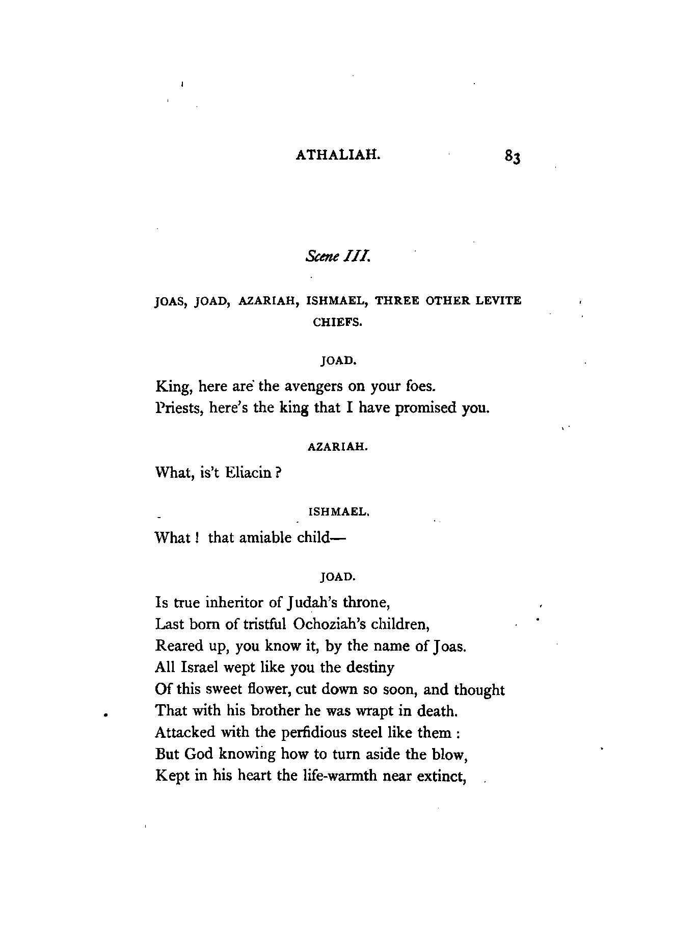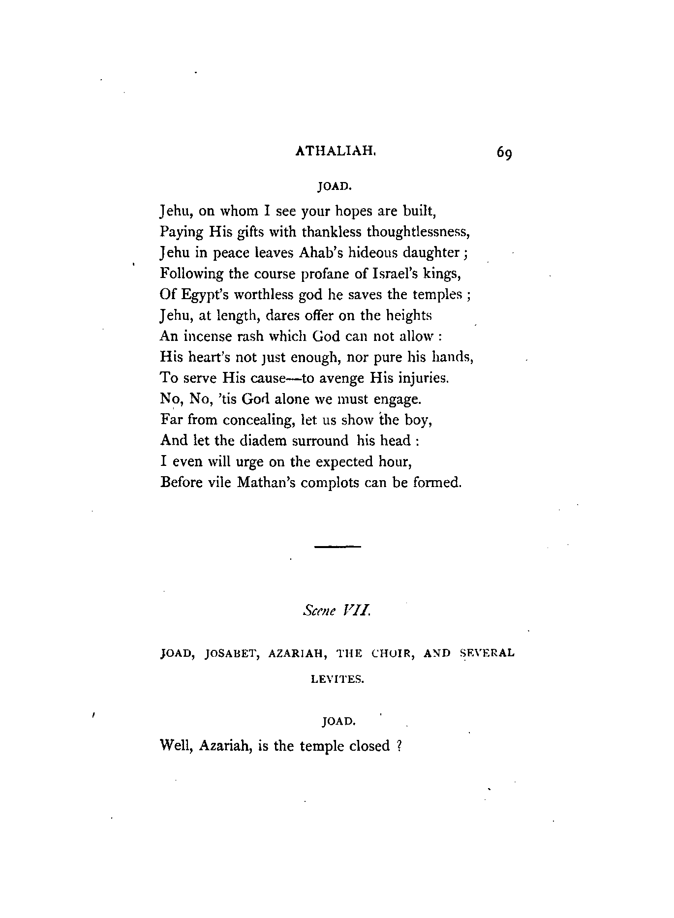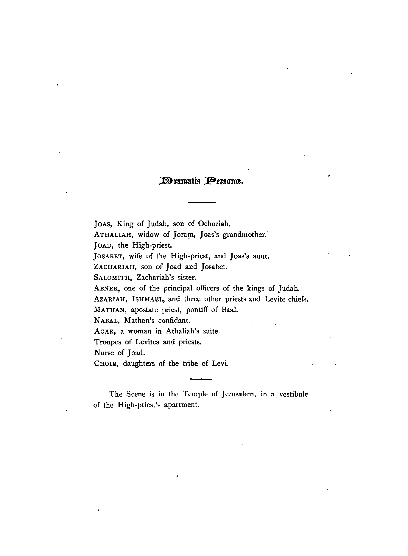 Racine, the author of Athalie (Athaliah), flourished in the latter half of the 17th century. At his appearance, Corneille, the great French Dramatist, was in the full splendour of his fame, whose rival he was afterwards recognised to be. Athalie is a Tragedy in rhyme, consisting of six Iambic feet, similar to the Alexandrine verse found occasionally in our English poets at the termination of a sentence or paragraph. Dryden, and a few others of less note, in the reign of Charles IL, introduced the rhyming drama to the English public; but the clank of its fetters was unpleasant to the British ear, which had become attuned to the freedom and majesty of blank verse. Blank verse, therefore, being our recognised vehicle of dramatic productions, has been employed in this translation. I did, however, intend in the first place to render the chorus into rhyme; but after maturer consideration it appeared to me that irregular blank verse would be more capable of tragic expression; and that it would also be more in harmony with the [4]Hebrew rhythm as represented by the scriptures, from which the plot was appropriated.