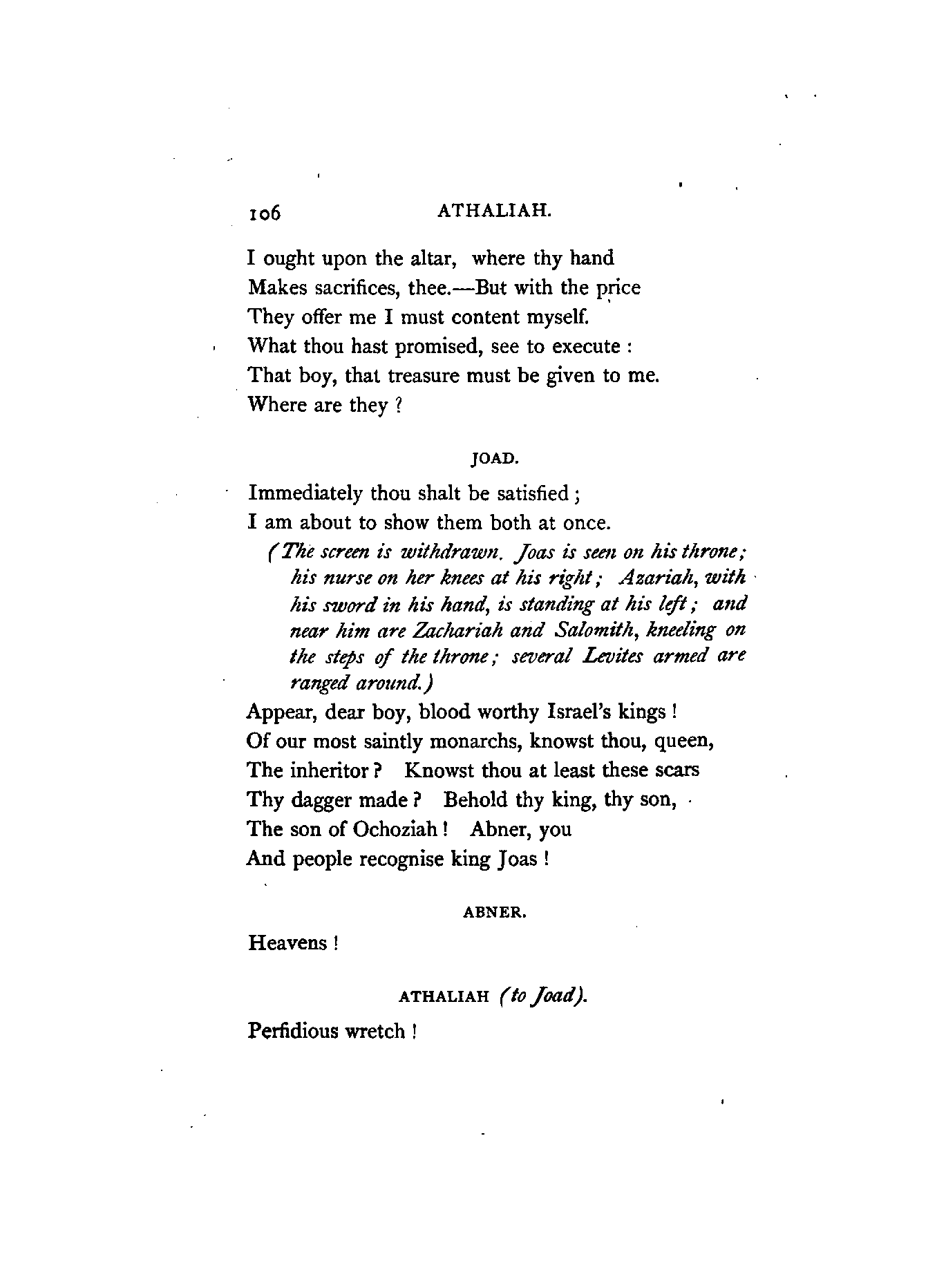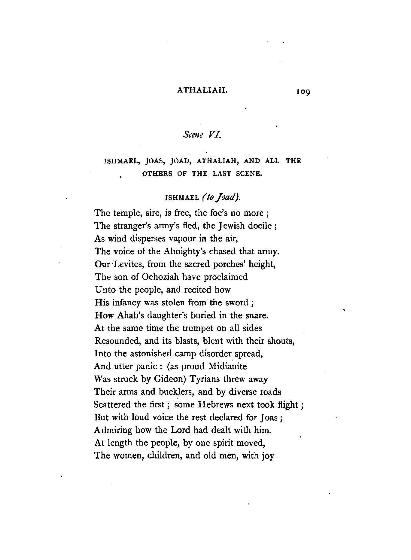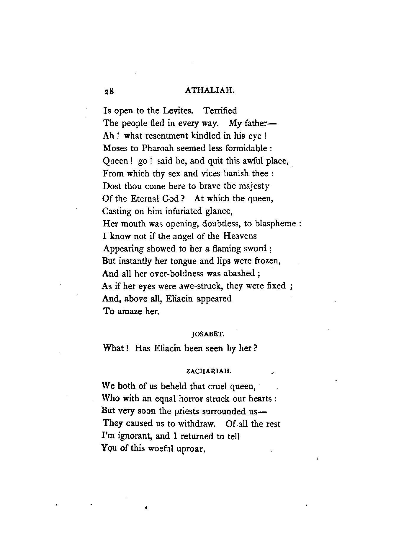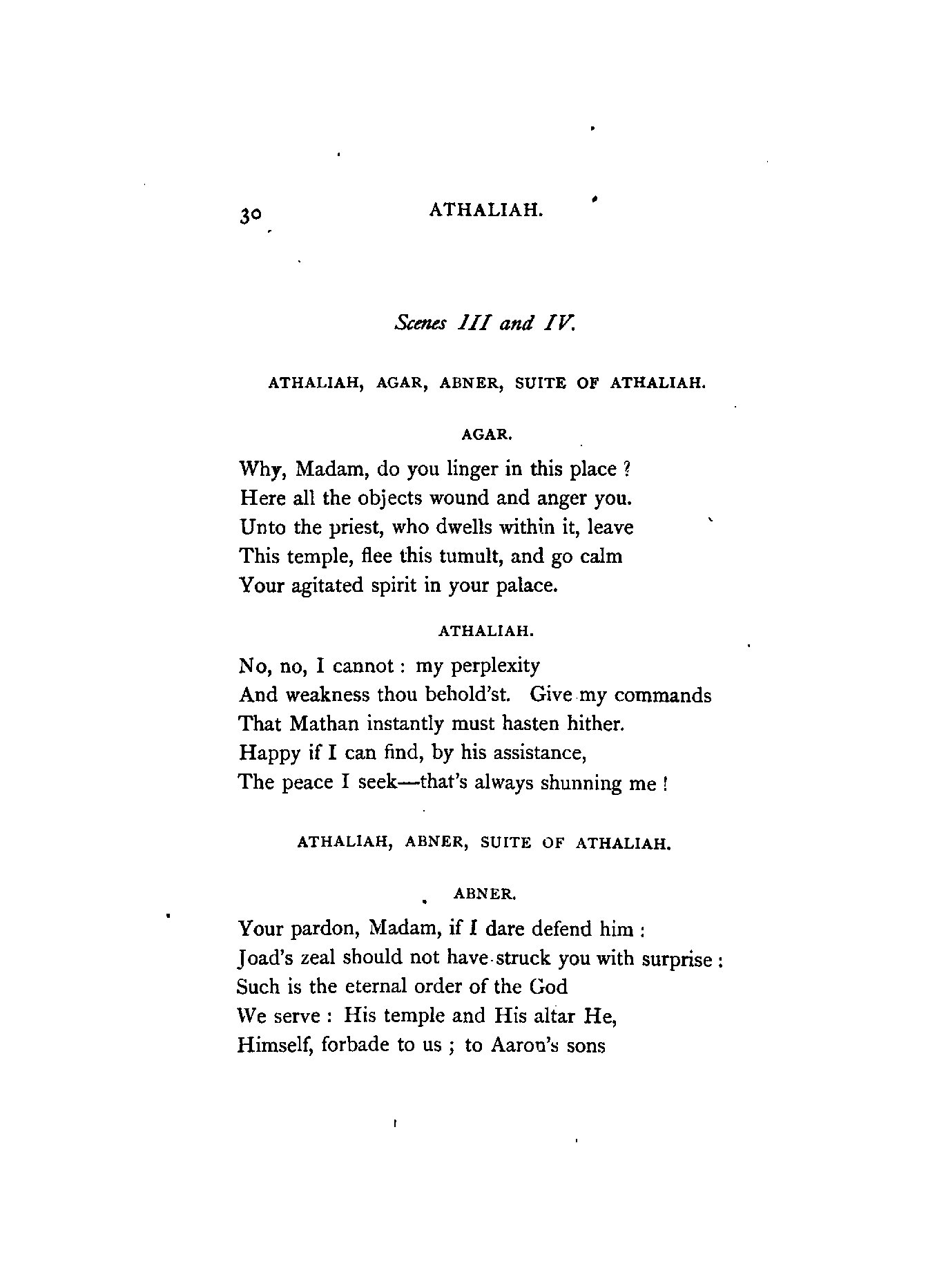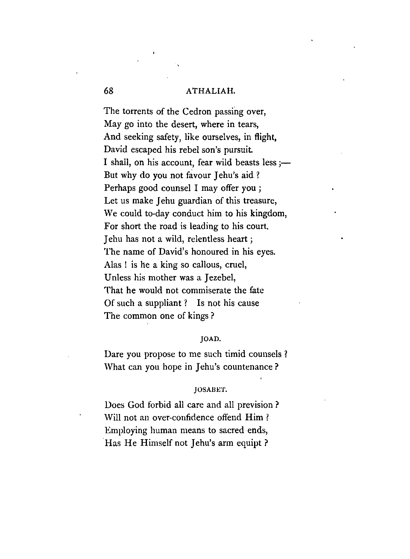 Racine, the author of Athalie (Athaliah), flourished in the latter half of the 17th century. At his appearance, Corneille, the great French Dramatist, was in the full splendour of his fame, whose rival he was afterwards recognised to be. Athalie is a Tragedy in rhyme, consisting of six Iambic feet, similar to the Alexandrine verse found occasionally in our English poets at the termination of a sentence or paragraph. Dryden, and a few others of less note, in the reign of Charles IL, introduced the rhyming drama to the English public; but the clank of its fetters was unpleasant to the British ear, which had become attuned to the freedom and majesty of blank verse. Blank verse, therefore, being our recognised vehicle of dramatic productions, has been employed in this translation. I did, however, intend in the first place to render the chorus into rhyme; but after maturer consideration it appeared to me that irregular blank verse would be more capable of tragic expression; and that it would also be more in harmony with the [4]Hebrew rhythm as represented by the scriptures, from which the plot was appropriated.