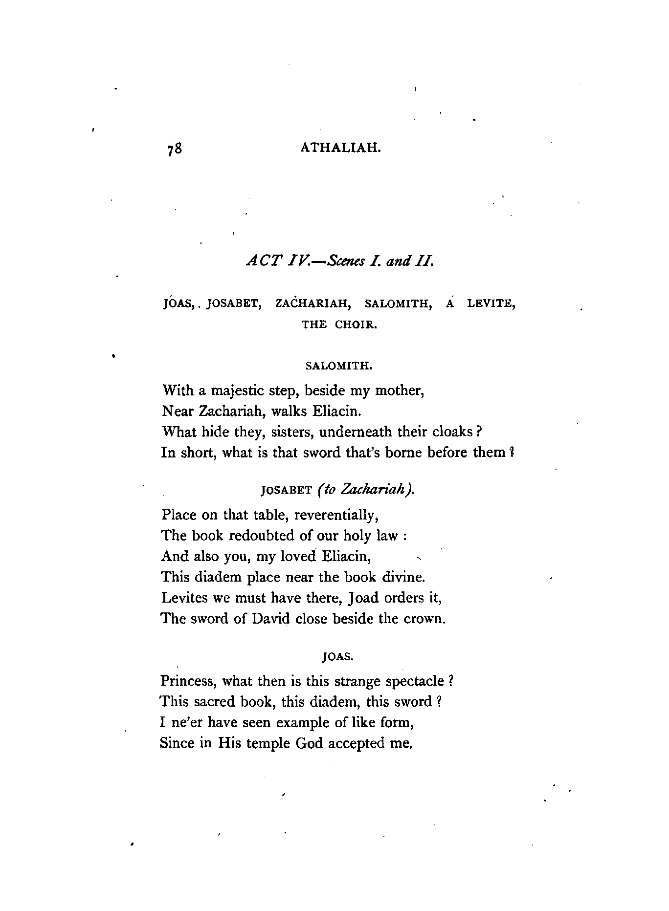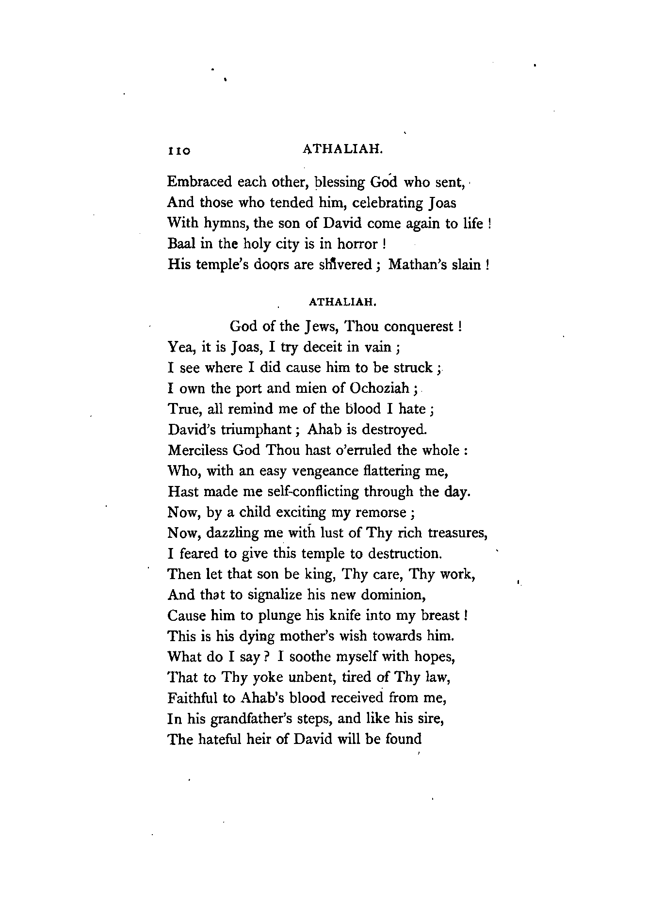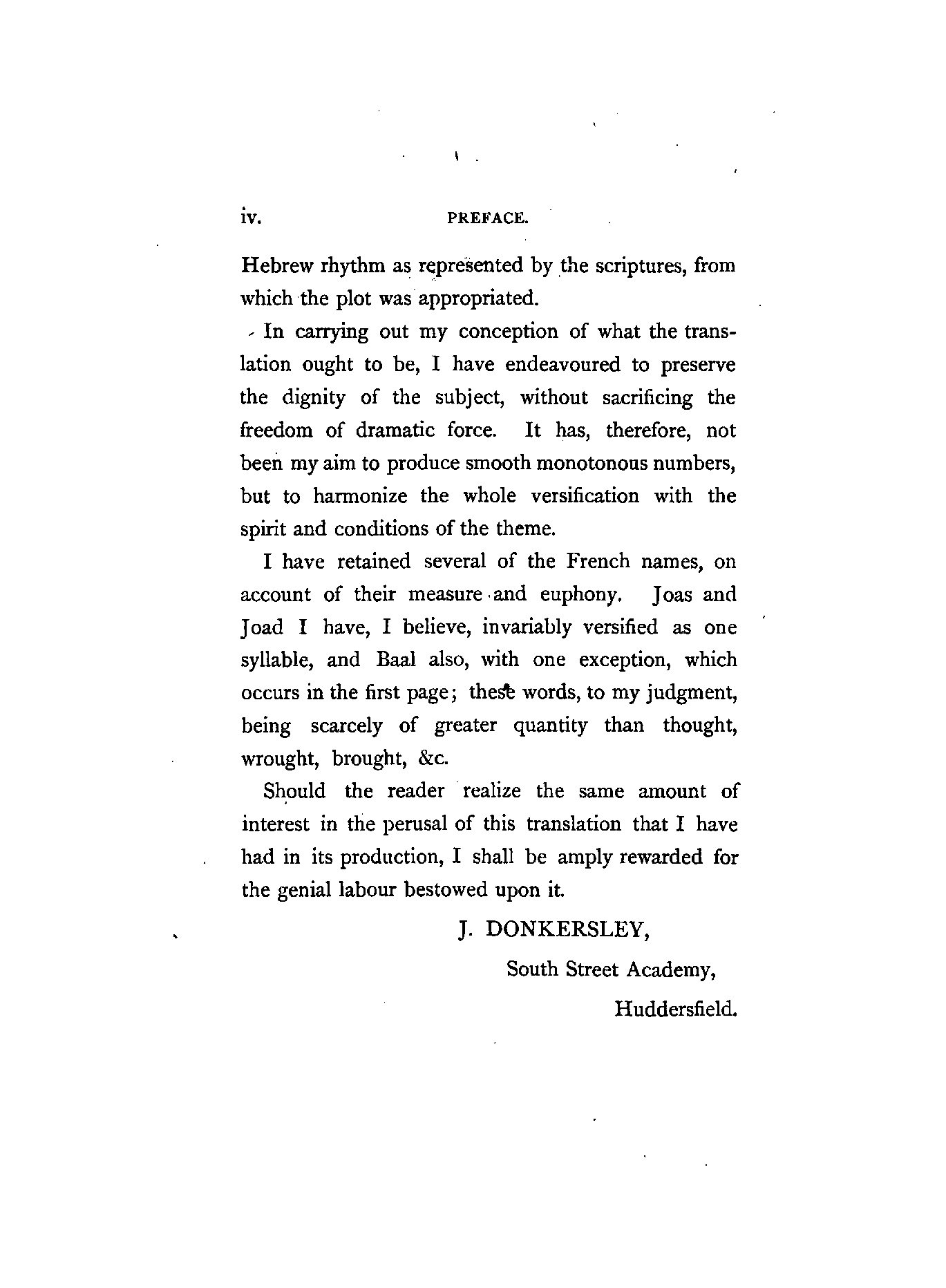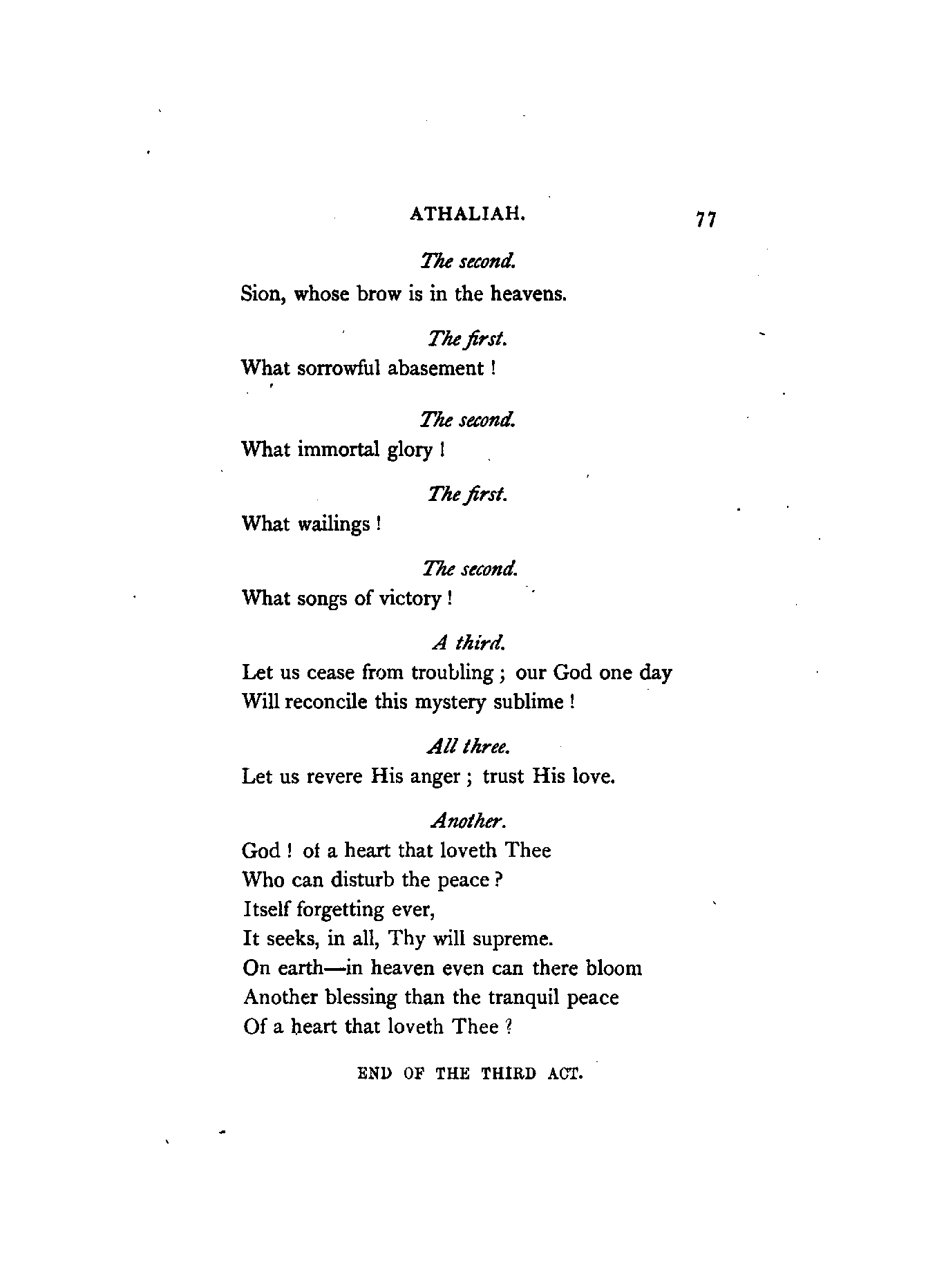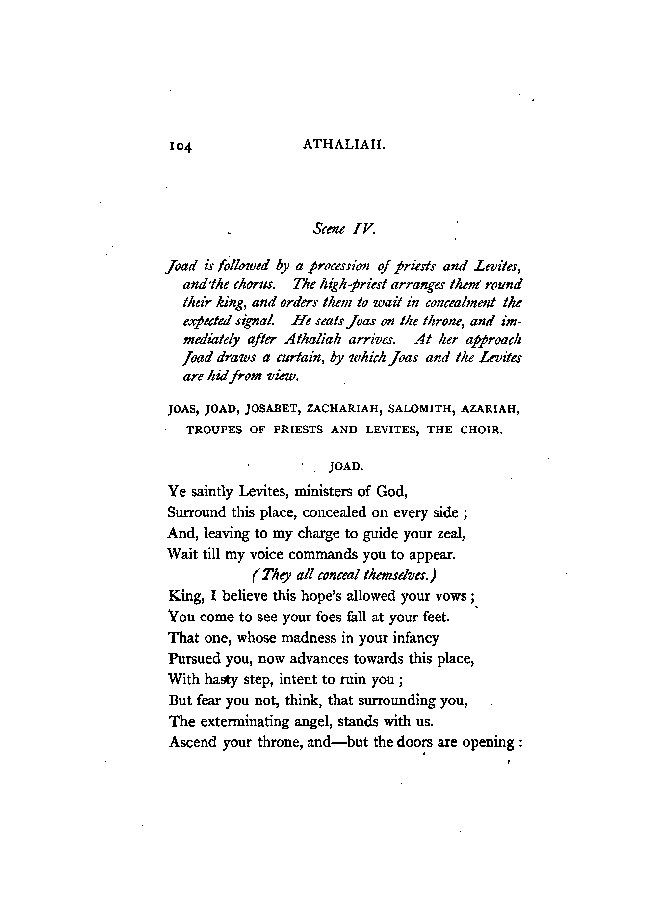 Racine, the author of Athalie (Athaliah), flourished in the latter half of the 17th century. At his appearance, Corneille, the great French Dramatist, was in the full splendour of his fame, whose rival he was afterwards recognised to be. Athalie is a Tragedy in rhyme, consisting of six Iambic feet, similar to the Alexandrine verse found occasionally in our English poets at the termination of a sentence or paragraph. Dryden, and a few others of less note, in the reign of Charles IL, introduced the rhyming drama to the English public; but the clank of its fetters was unpleasant to the British ear, which had become attuned to the freedom and majesty of blank verse. Blank verse, therefore, being our recognised vehicle of dramatic productions, has been employed in this translation. I did, however, intend in the first place to render the chorus into rhyme; but after maturer consideration it appeared to me that irregular blank verse would be more capable of tragic expression; and that it would also be more in harmony with the [4]Hebrew rhythm as represented by the scriptures, from which the plot was appropriated.