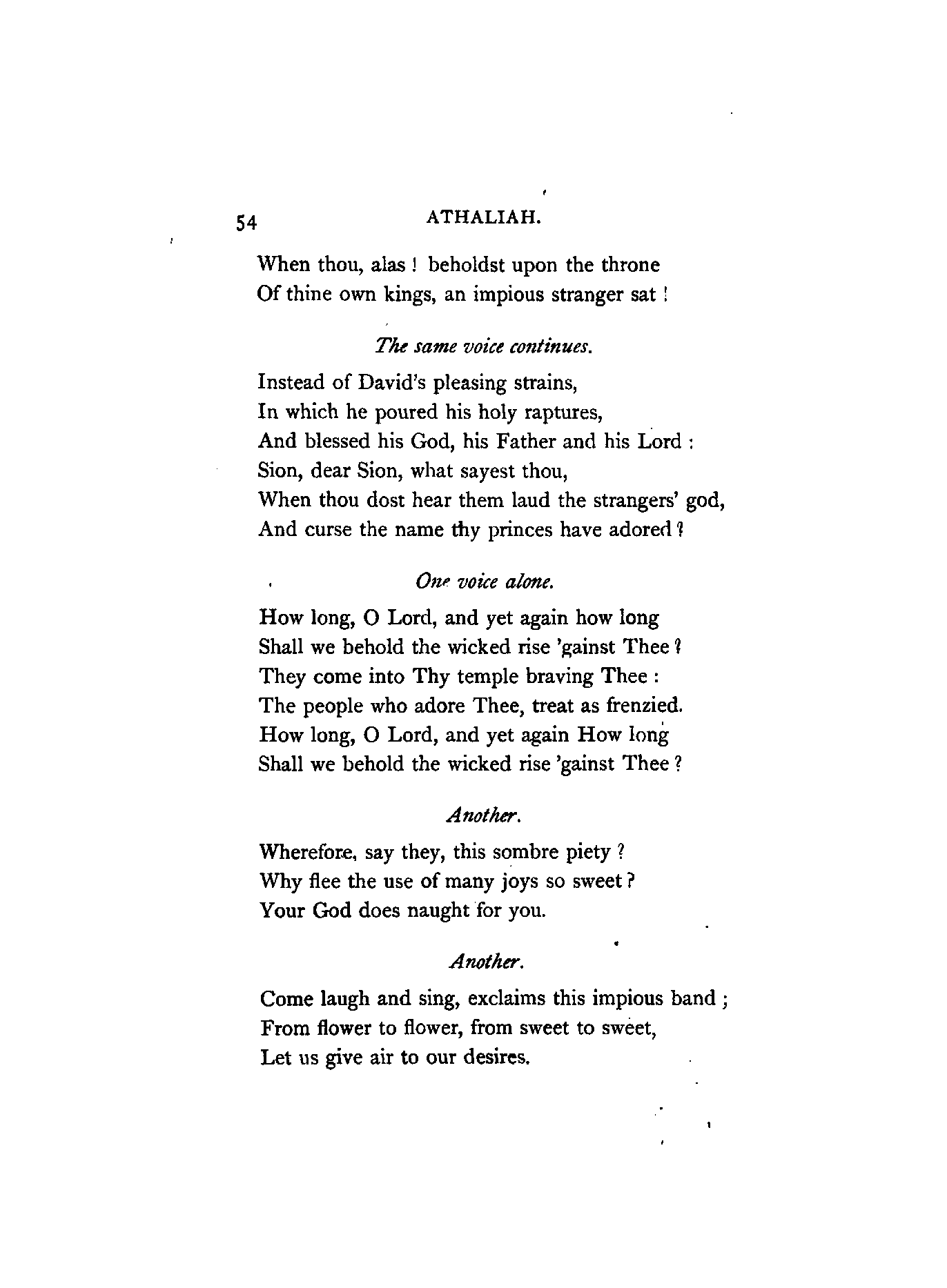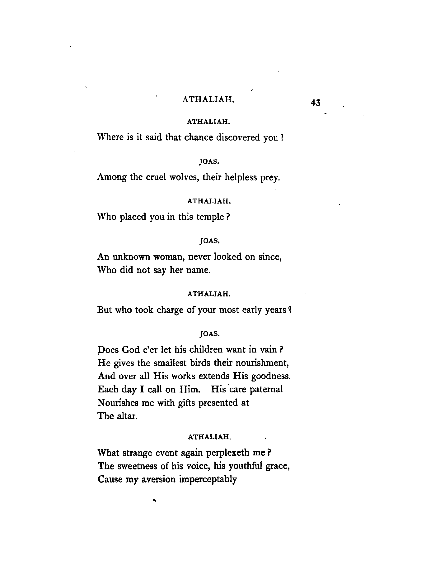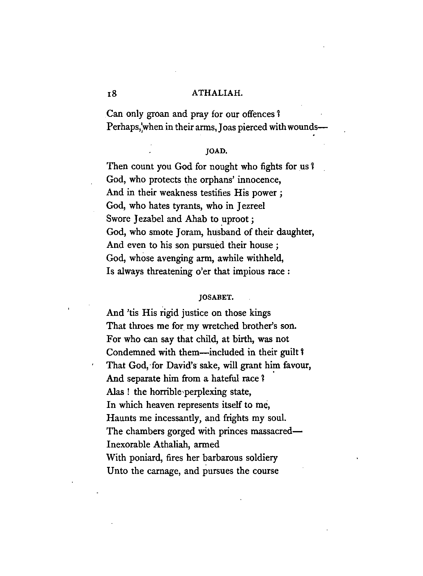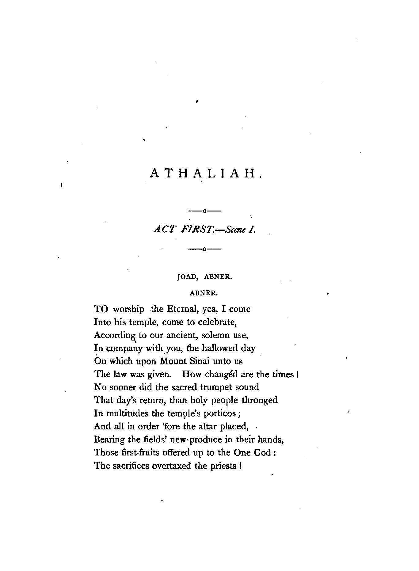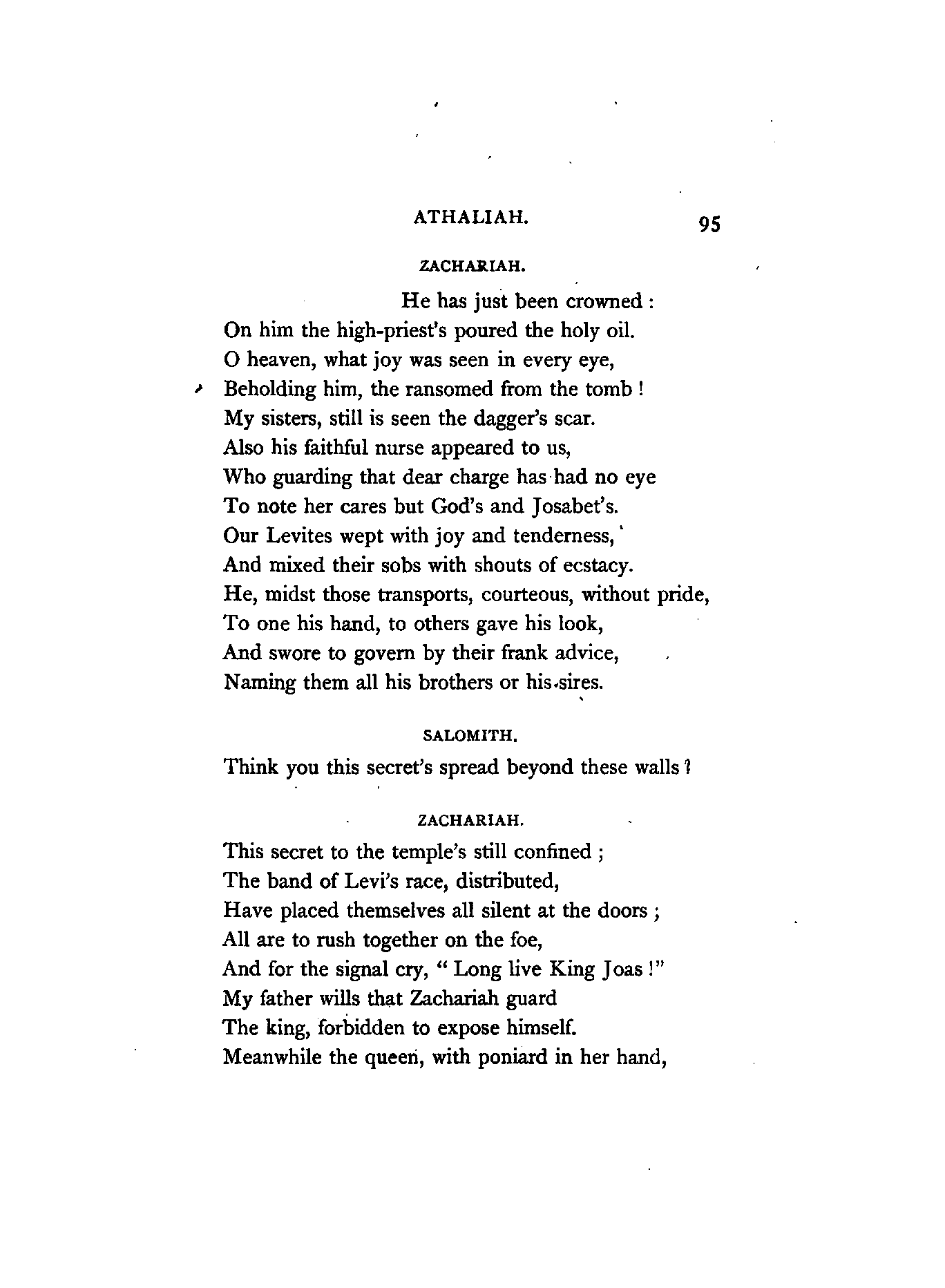 Racine, the author of Athalie (Athaliah), flourished in the latter half of the 17th century. At his appearance, Corneille, the great French Dramatist, was in the full splendour of his fame, whose rival he was afterwards recognised to be. Athalie is a Tragedy in rhyme, consisting of six Iambic feet, similar to the Alexandrine verse found occasionally in our English poets at the termination of a sentence or paragraph. Dryden, and a few others of less note, in the reign of Charles IL, introduced the rhyming drama to the English public; but the clank of its fetters was unpleasant to the British ear, which had become attuned to the freedom and majesty of blank verse. Blank verse, therefore, being our recognised vehicle of dramatic productions, has been employed in this translation. I did, however, intend in the first place to render the chorus into rhyme; but after maturer consideration it appeared to me that irregular blank verse would be more capable of tragic expression; and that it would also be more in harmony with the [4]Hebrew rhythm as represented by the scriptures, from which the plot was appropriated.