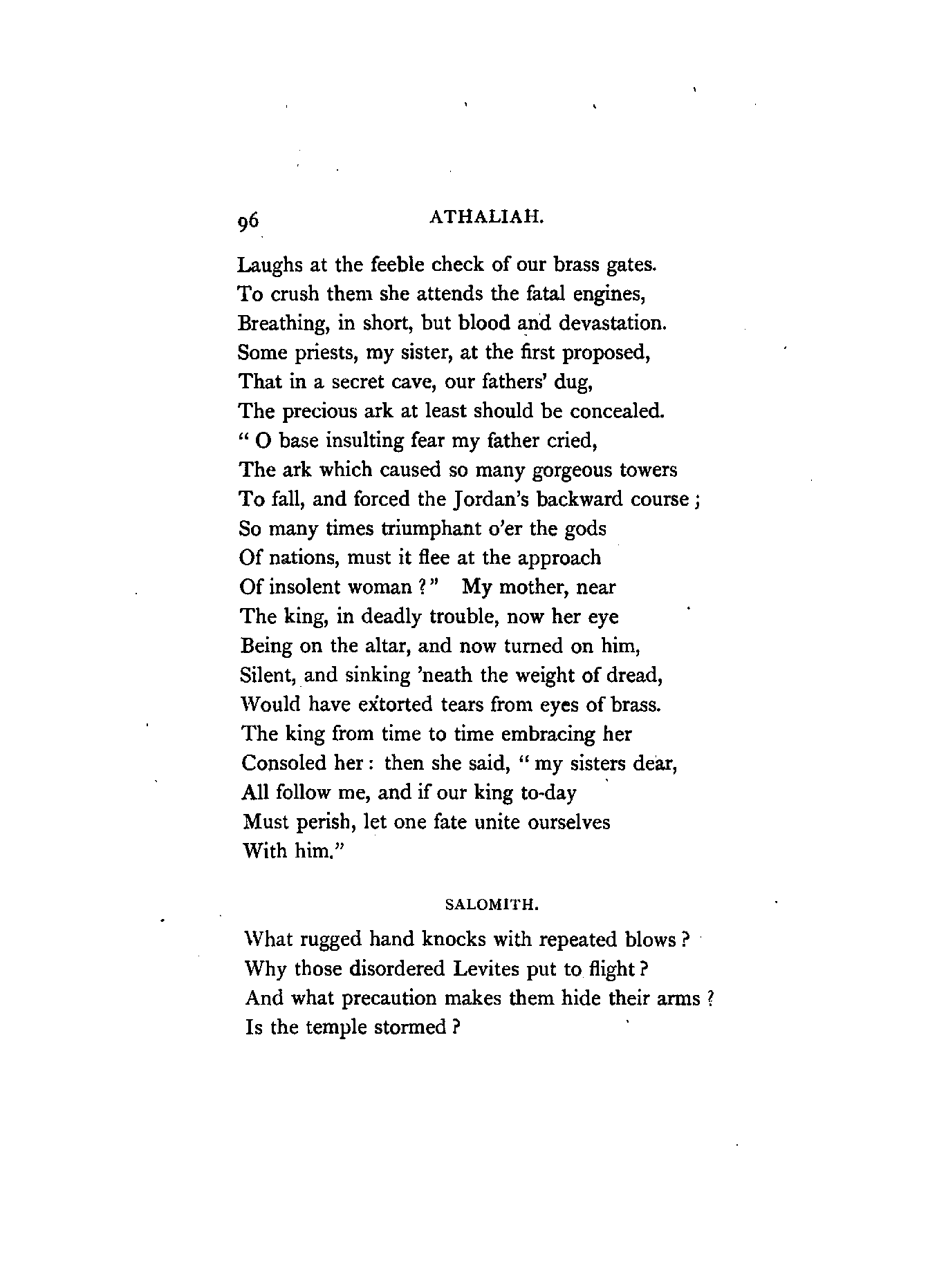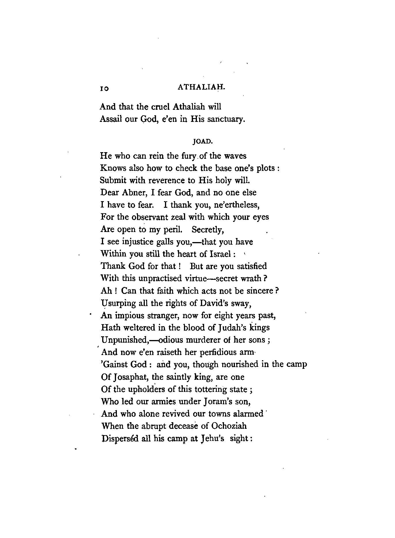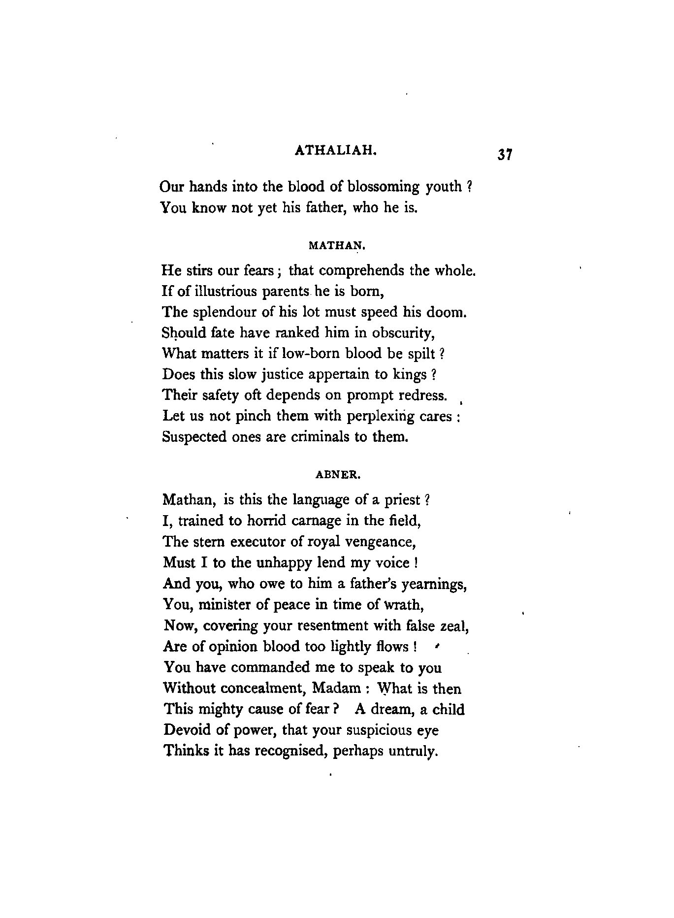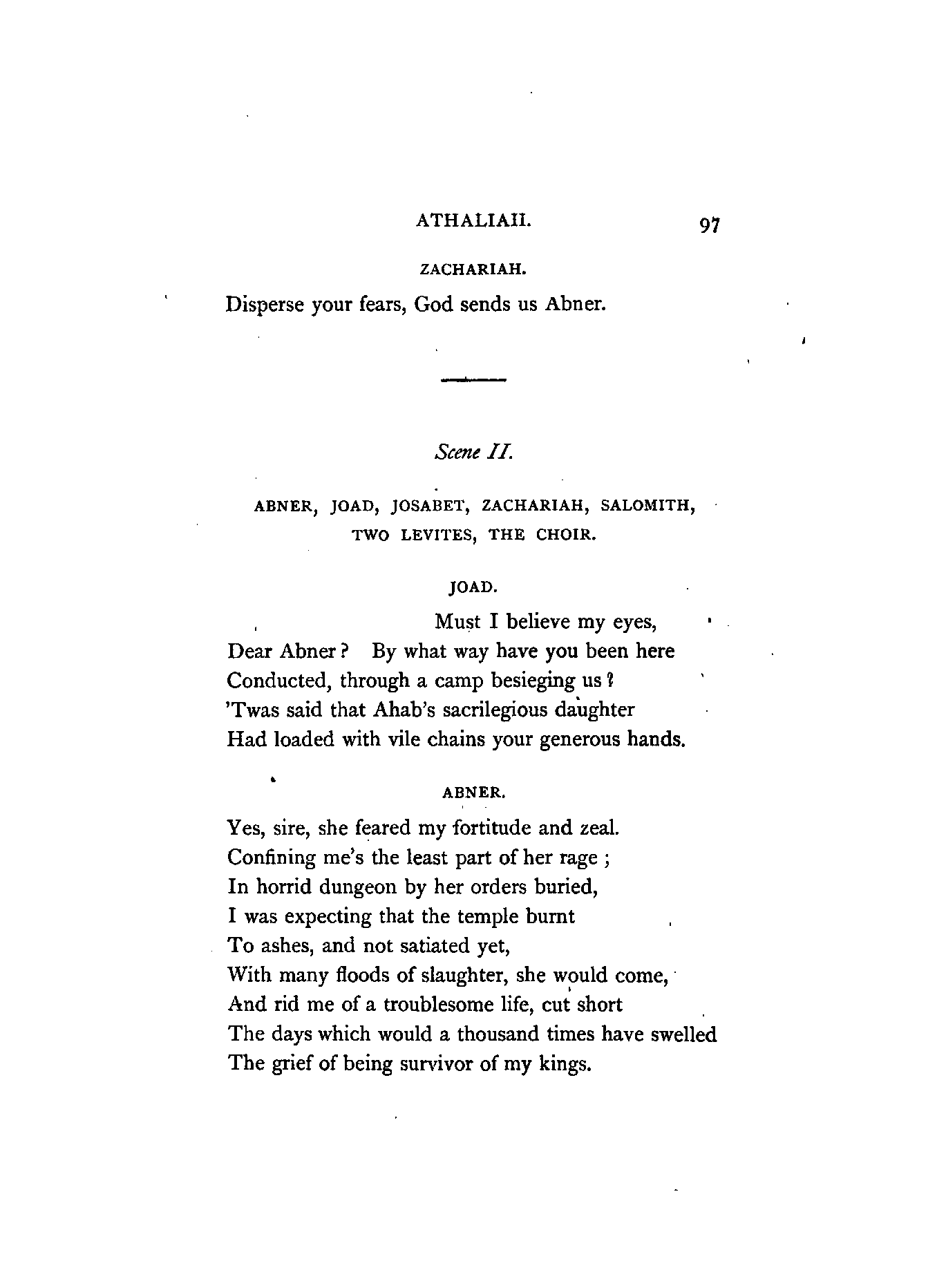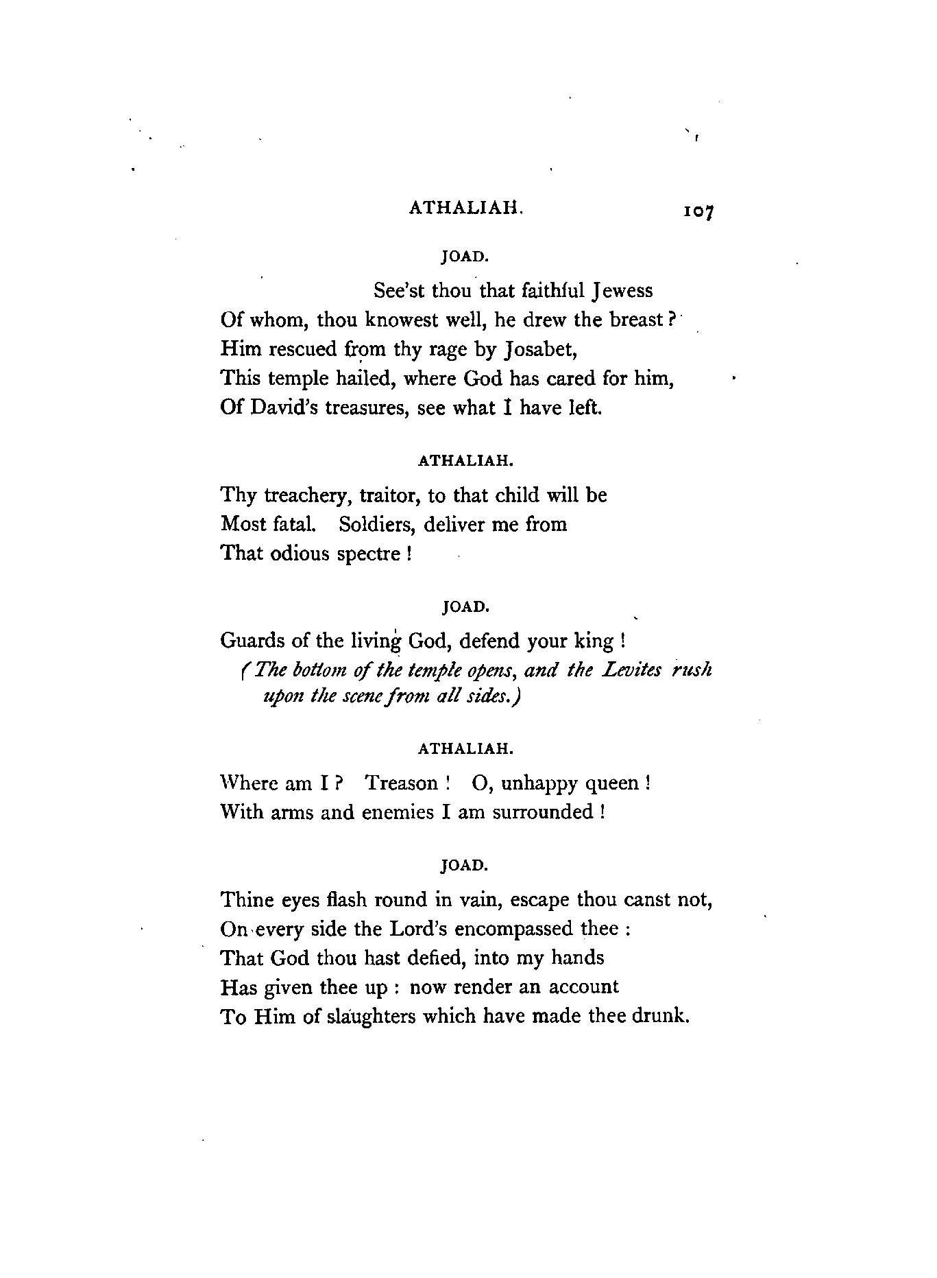 Racine, the author of Athalie (Athaliah), flourished in the latter half of the 17th century. At his appearance, Corneille, the great French Dramatist, was in the full splendour of his fame, whose rival he was afterwards recognised to be. Athalie is a Tragedy in rhyme, consisting of six Iambic feet, similar to the Alexandrine verse found occasionally in our English poets at the termination of a sentence or paragraph. Dryden, and a few others of less note, in the reign of Charles IL, introduced the rhyming drama to the English public; but the clank of its fetters was unpleasant to the British ear, which had become attuned to the freedom and majesty of blank verse. Blank verse, therefore, being our recognised vehicle of dramatic productions, has been employed in this translation. I did, however, intend in the first place to render the chorus into rhyme; but after maturer consideration it appeared to me that irregular blank verse would be more capable of tragic expression; and that it would also be more in harmony with the [4]Hebrew rhythm as represented by the scriptures, from which the plot was appropriated.