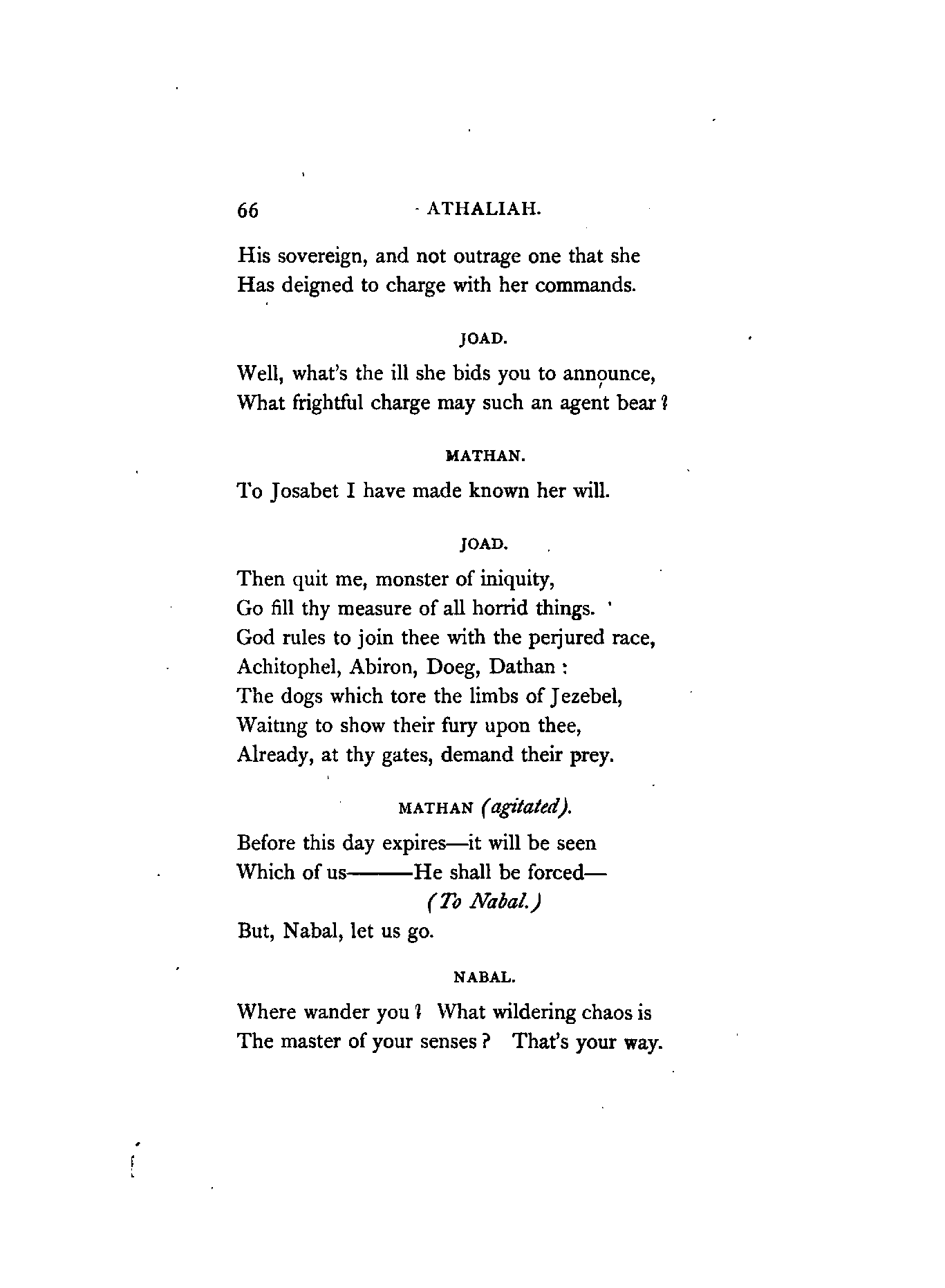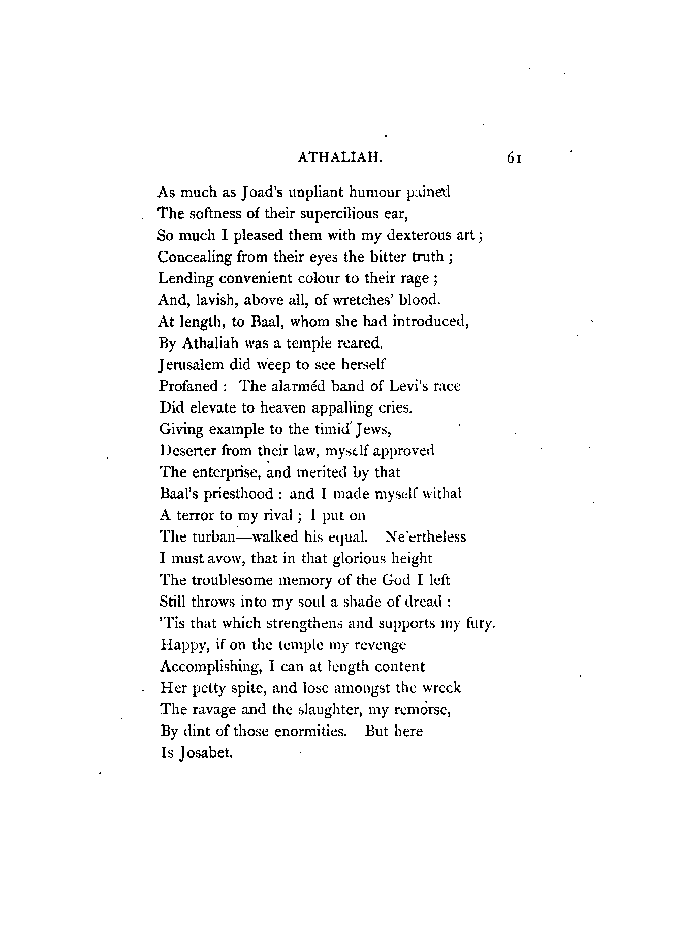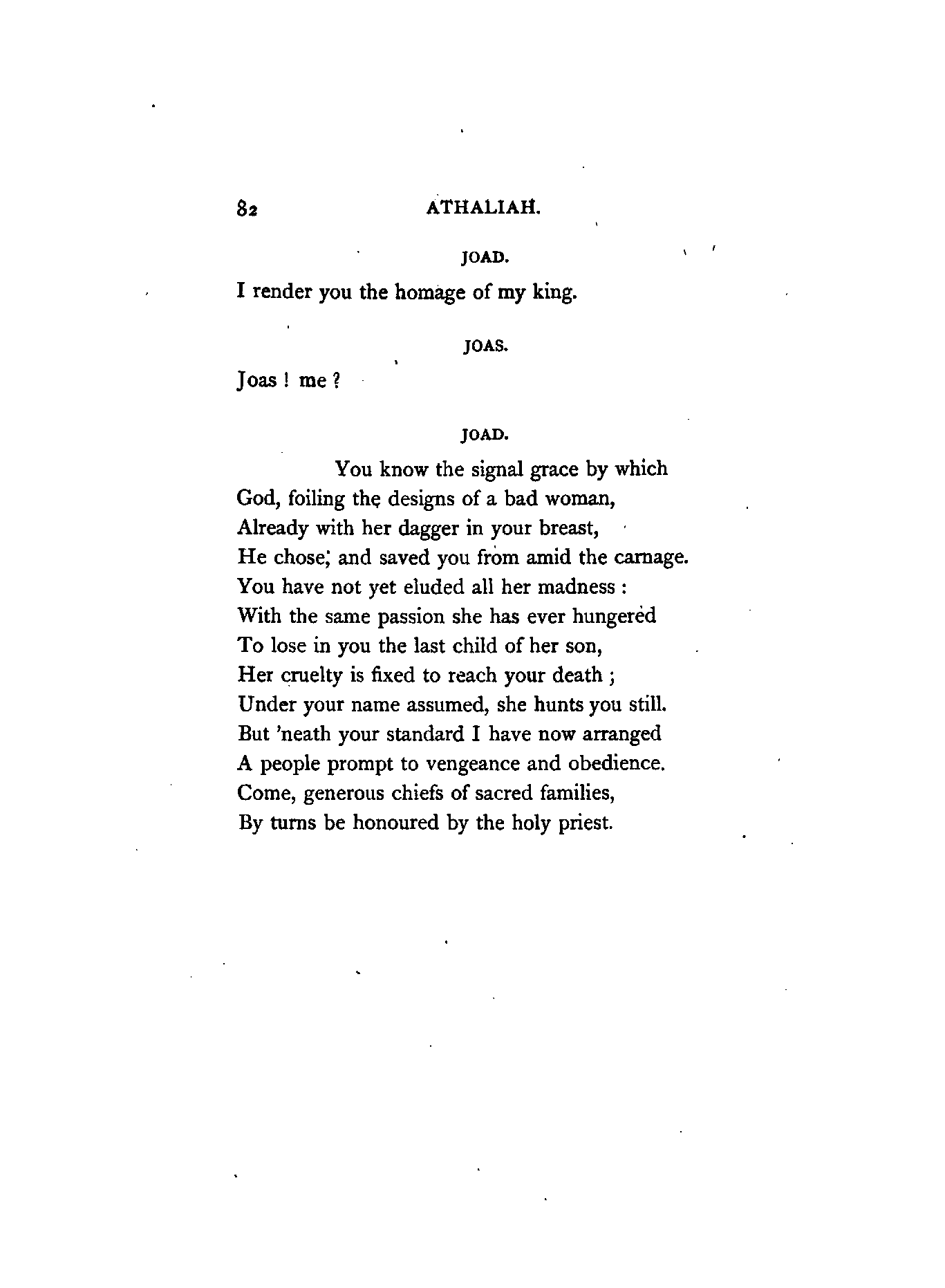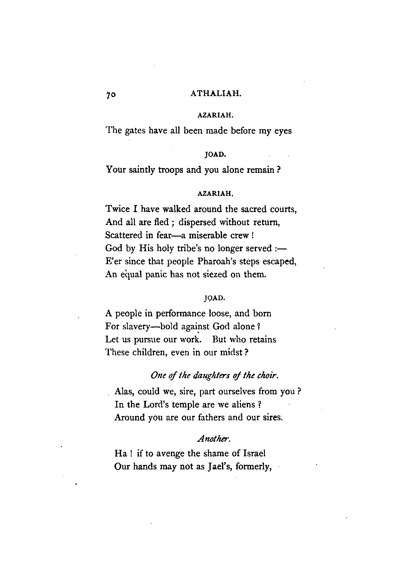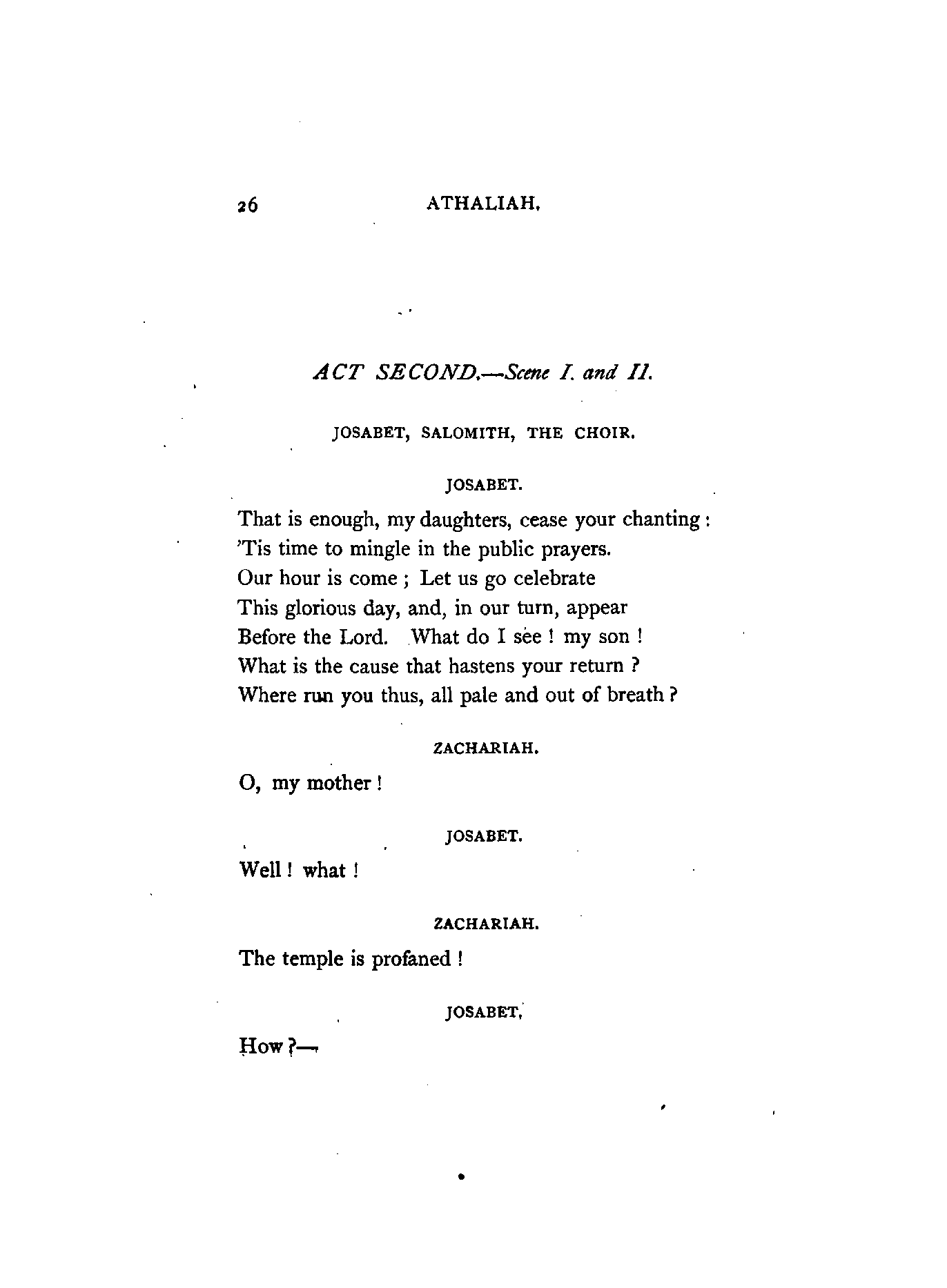 Racine, the author of Athalie (Athaliah), flourished in the latter half of the 17th century. At his appearance, Corneille, the great French Dramatist, was in the full splendour of his fame, whose rival he was afterwards recognised to be. Athalie is a Tragedy in rhyme, consisting of six Iambic feet, similar to the Alexandrine verse found occasionally in our English poets at the termination of a sentence or paragraph. Dryden, and a few others of less note, in the reign of Charles IL, introduced the rhyming drama to the English public; but the clank of its fetters was unpleasant to the British ear, which had become attuned to the freedom and majesty of blank verse. Blank verse, therefore, being our recognised vehicle of dramatic productions, has been employed in this translation. I did, however, intend in the first place to render the chorus into rhyme; but after maturer consideration it appeared to me that irregular blank verse would be more capable of tragic expression; and that it would also be more in harmony with the [4]Hebrew rhythm as represented by the scriptures, from which the plot was appropriated.