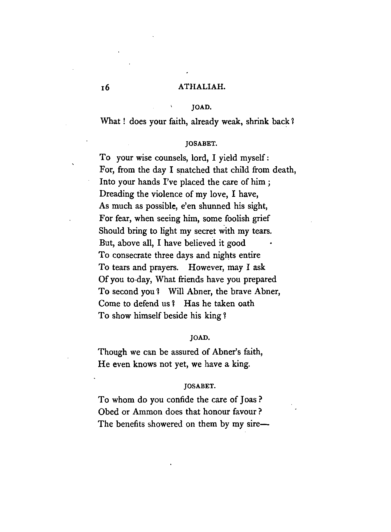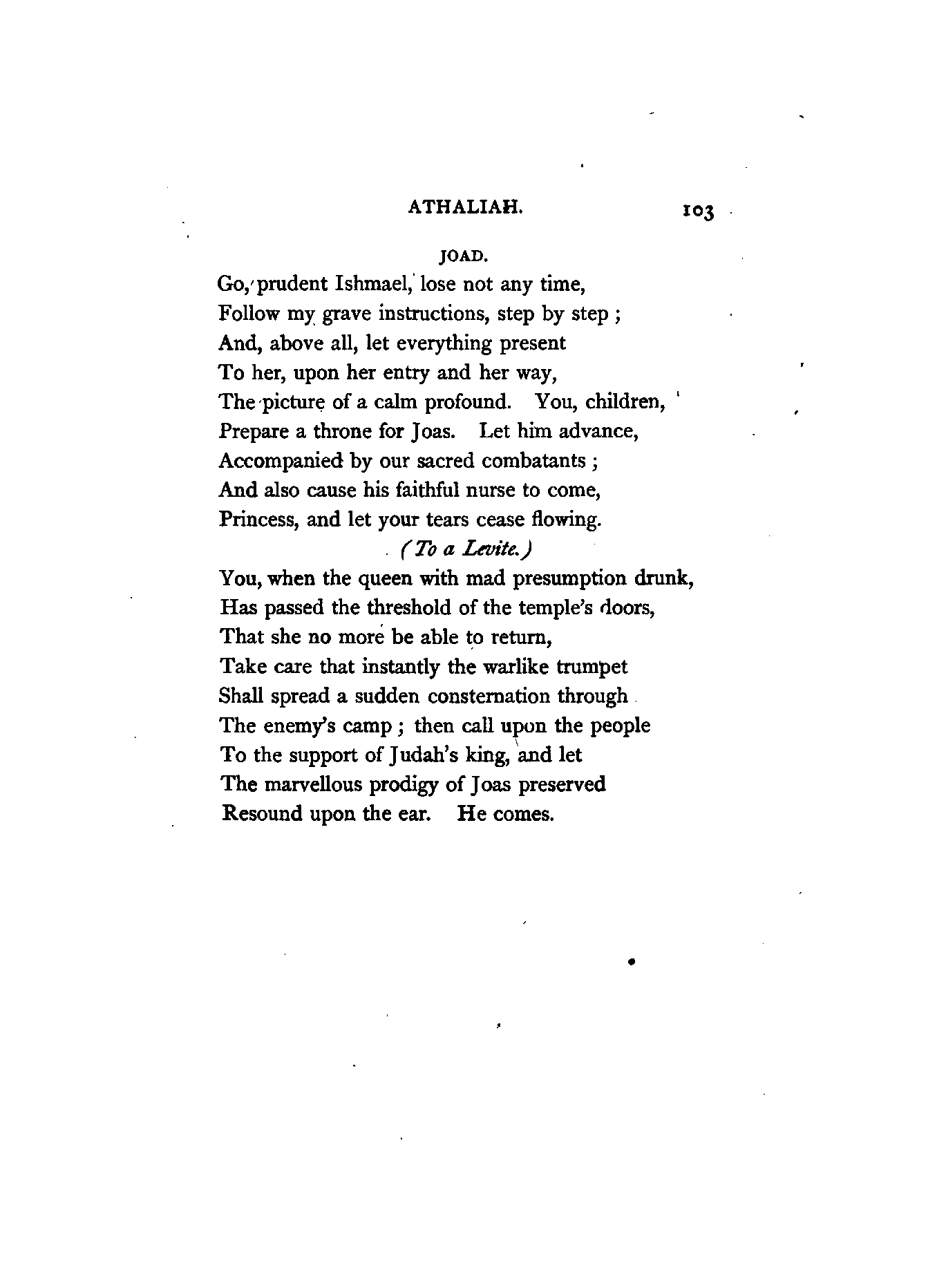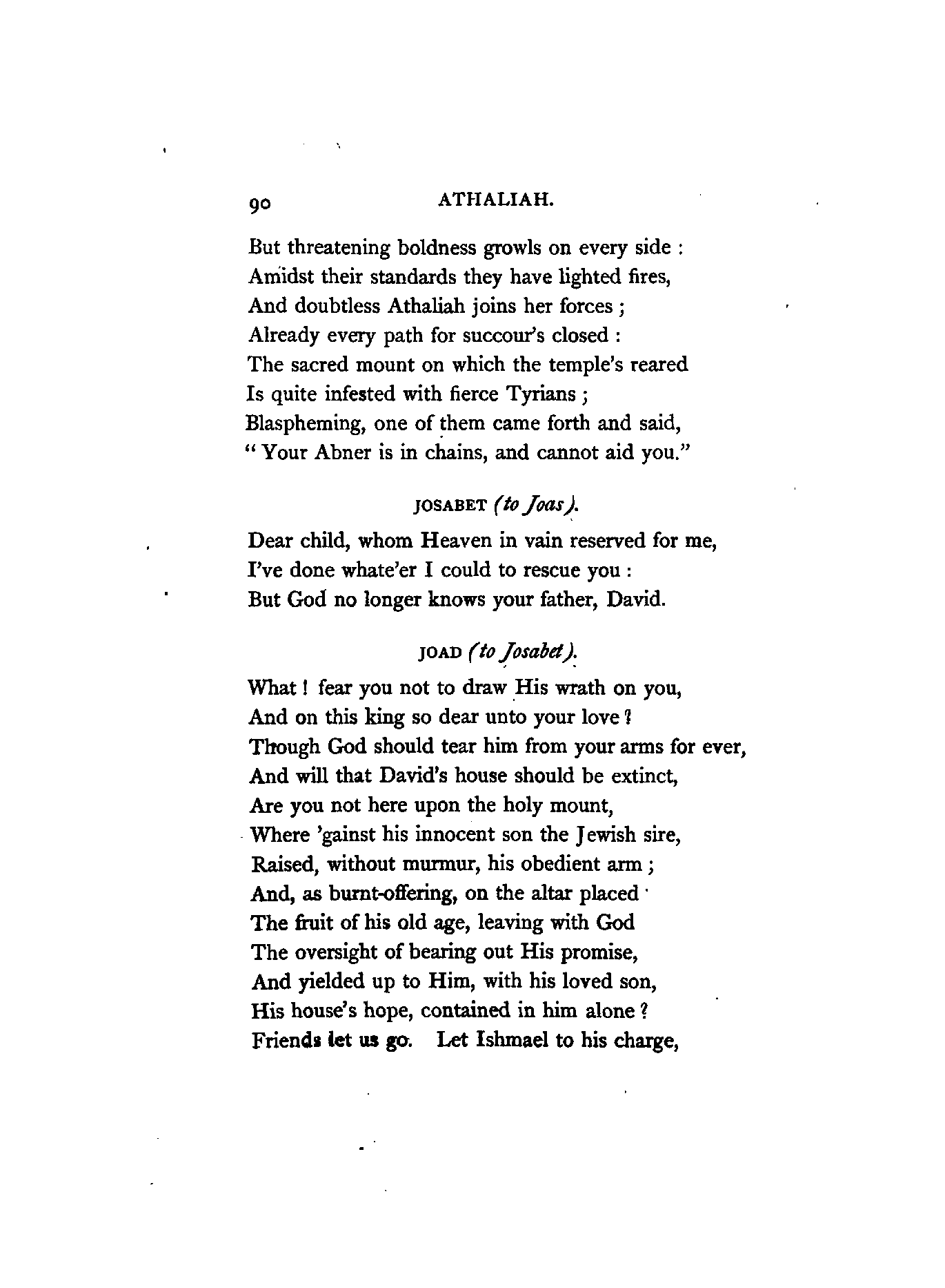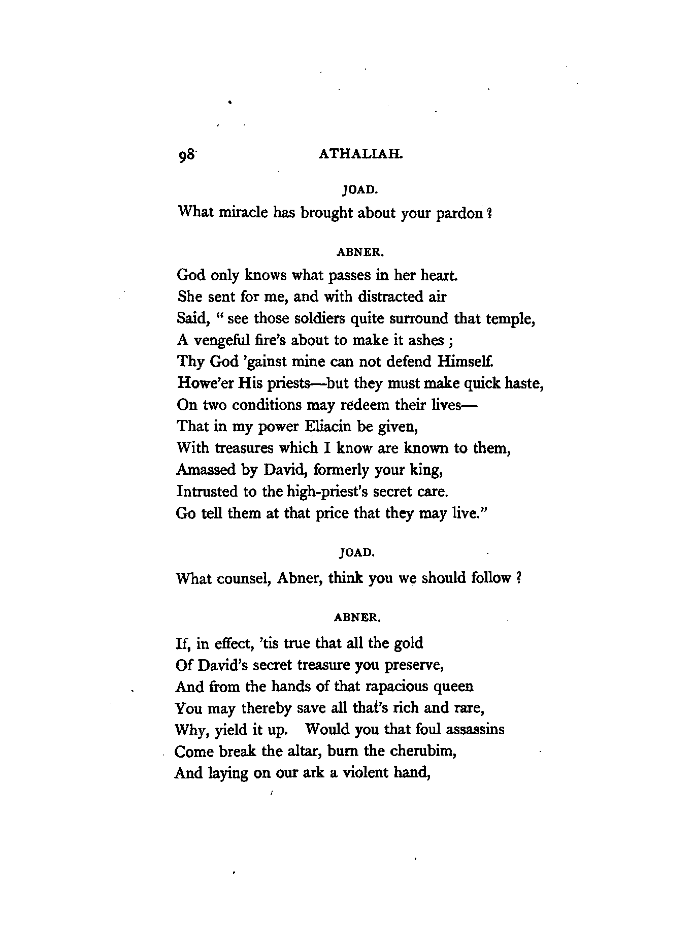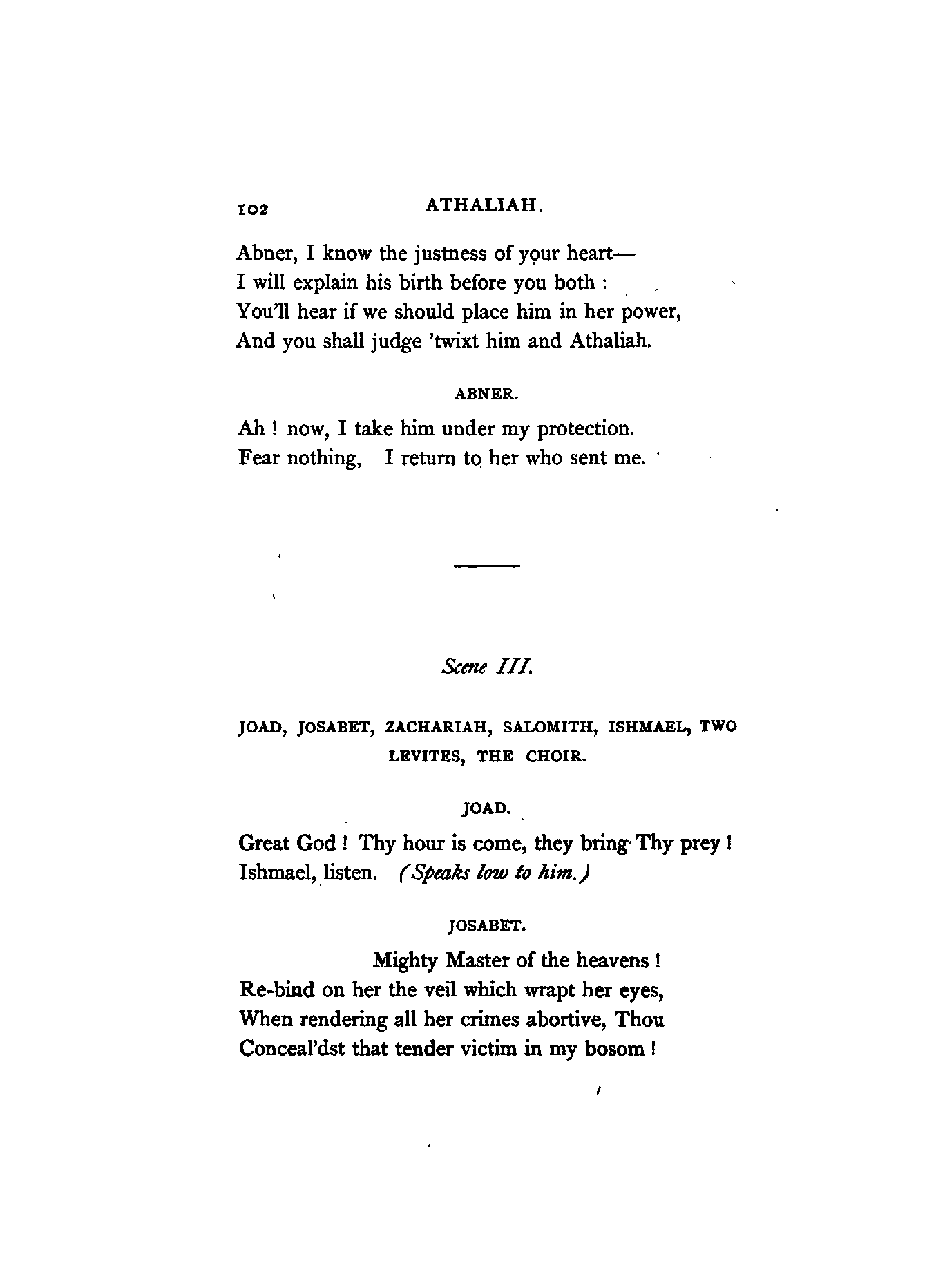 Racine, the author of Athalie (Athaliah), flourished in the latter half of the 17th century. At his appearance, Corneille, the great French Dramatist, was in the full splendour of his fame, whose rival he was afterwards recognised to be. Athalie is a Tragedy in rhyme, consisting of six Iambic feet, similar to the Alexandrine verse found occasionally in our English poets at the termination of a sentence or paragraph. Dryden, and a few others of less note, in the reign of Charles IL, introduced the rhyming drama to the English public; but the clank of its fetters was unpleasant to the British ear, which had become attuned to the freedom and majesty of blank verse. Blank verse, therefore, being our recognised vehicle of dramatic productions, has been employed in this translation. I did, however, intend in the first place to render the chorus into rhyme; but after maturer consideration it appeared to me that irregular blank verse would be more capable of tragic expression; and that it would also be more in harmony with the [4]Hebrew rhythm as represented by the scriptures, from which the plot was appropriated.