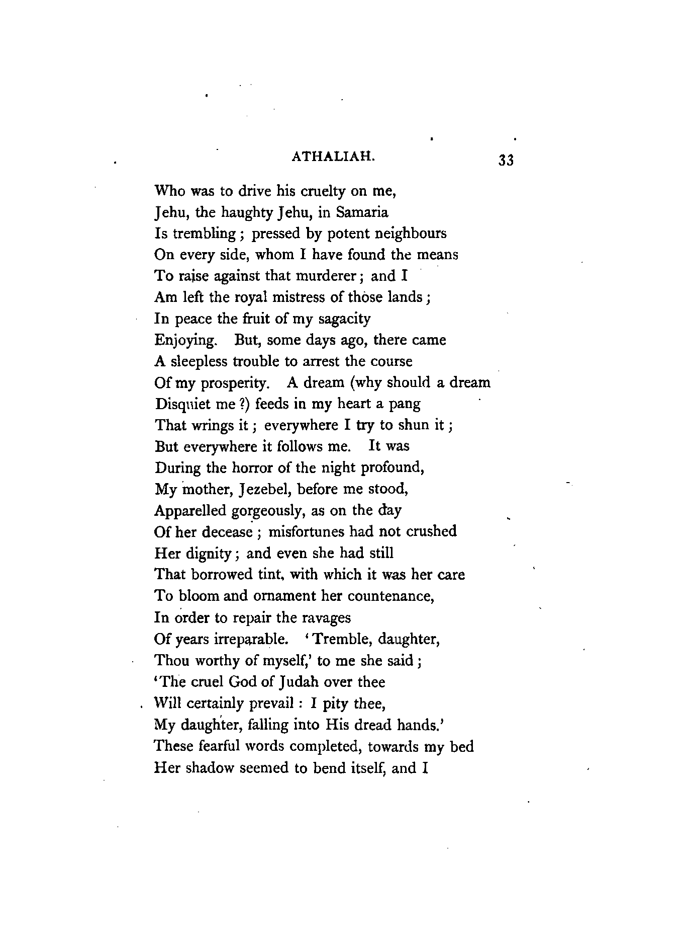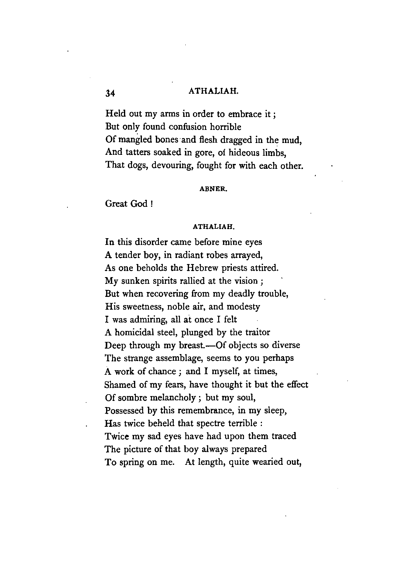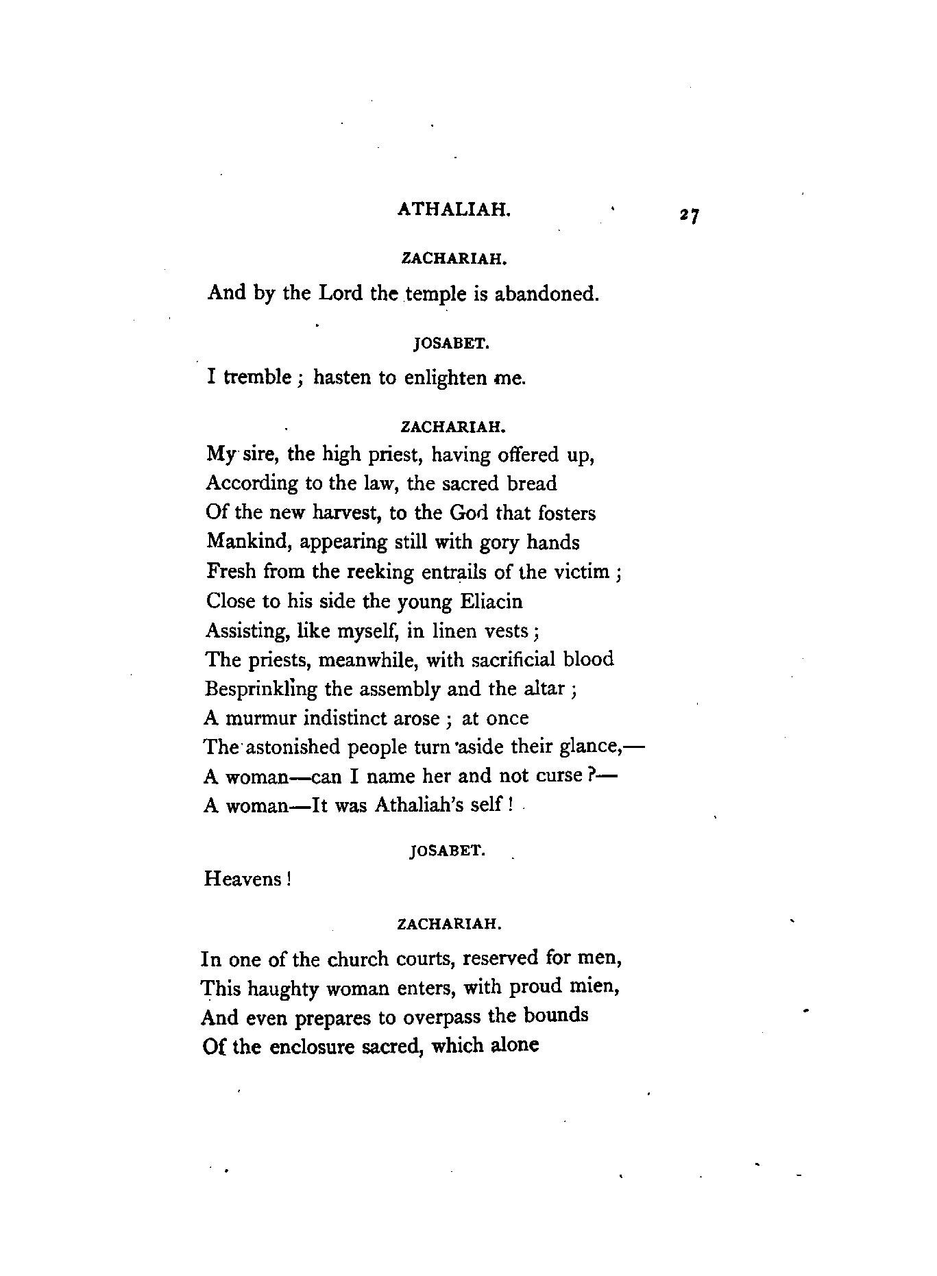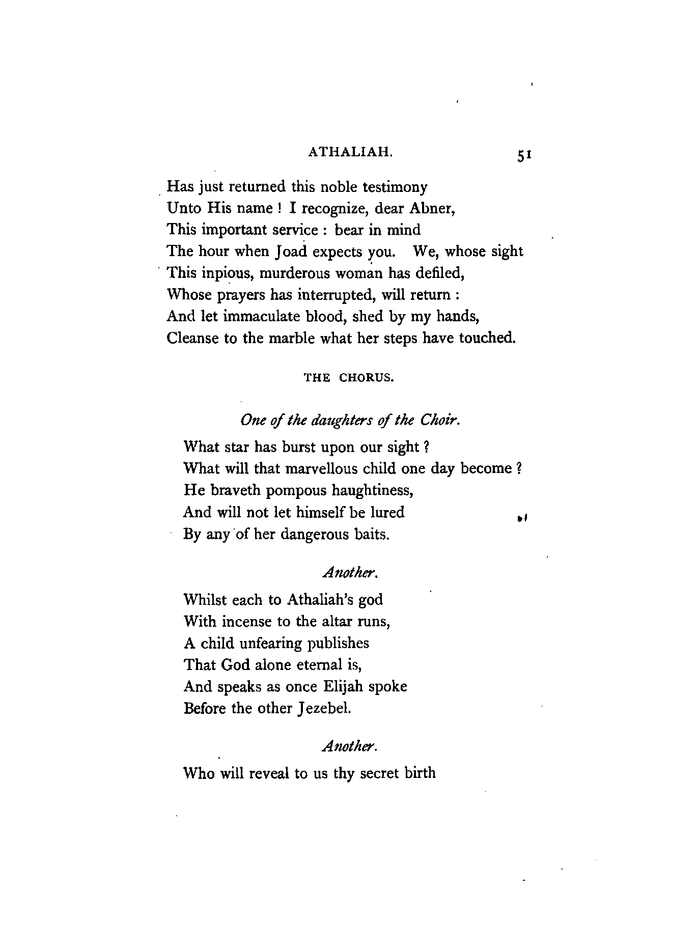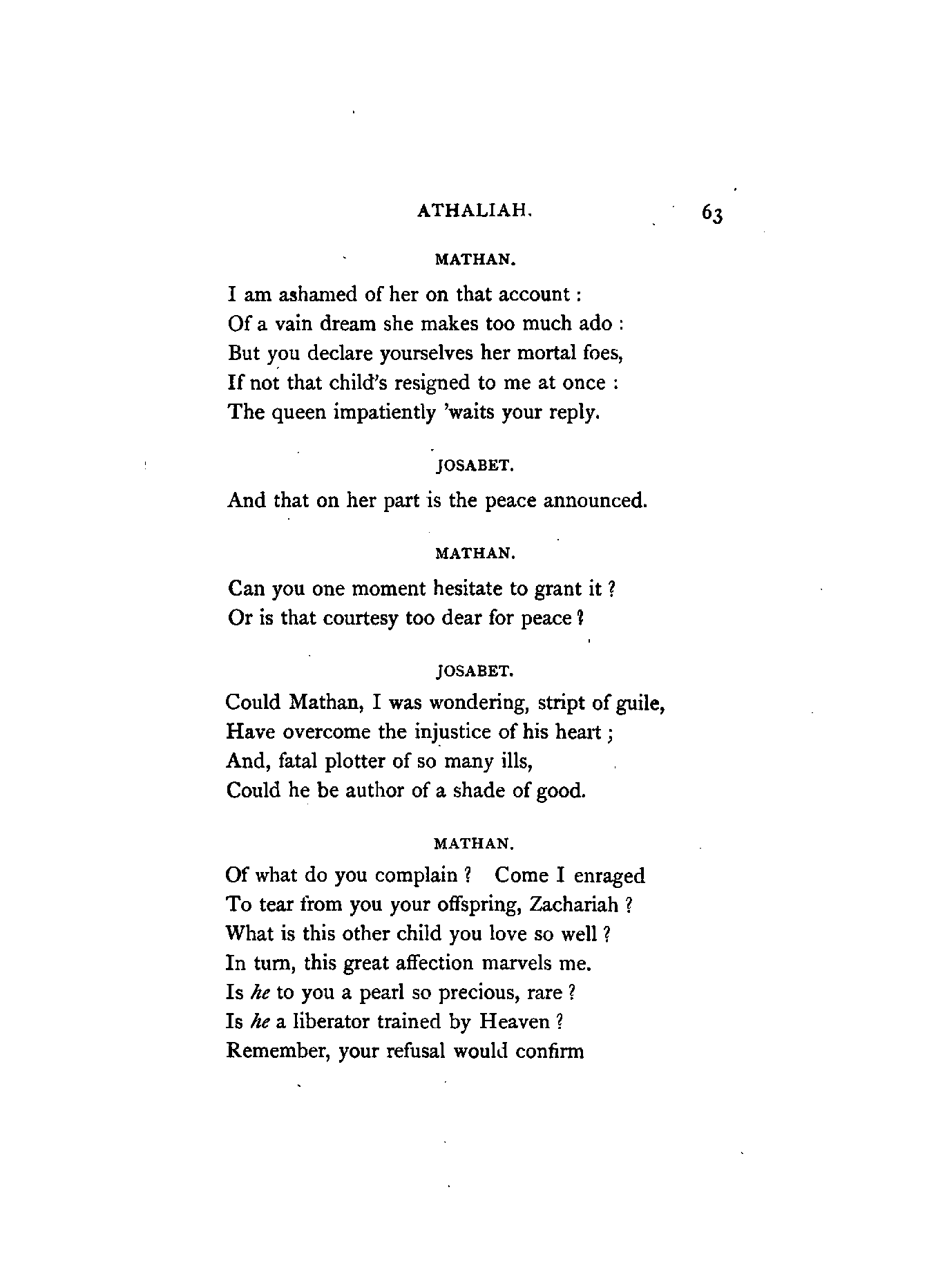 Racine, the author of Athalie (Athaliah), flourished in the latter half of the 17th century. At his appearance, Corneille, the great French Dramatist, was in the full splendour of his fame, whose rival he was afterwards recognised to be. Athalie is a Tragedy in rhyme, consisting of six Iambic feet, similar to the Alexandrine verse found occasionally in our English poets at the termination of a sentence or paragraph. Dryden, and a few others of less note, in the reign of Charles IL, introduced the rhyming drama to the English public; but the clank of its fetters was unpleasant to the British ear, which had become attuned to the freedom and majesty of blank verse. Blank verse, therefore, being our recognised vehicle of dramatic productions, has been employed in this translation. I did, however, intend in the first place to render the chorus into rhyme; but after maturer consideration it appeared to me that irregular blank verse would be more capable of tragic expression; and that it would also be more in harmony with the [4]Hebrew rhythm as represented by the scriptures, from which the plot was appropriated.