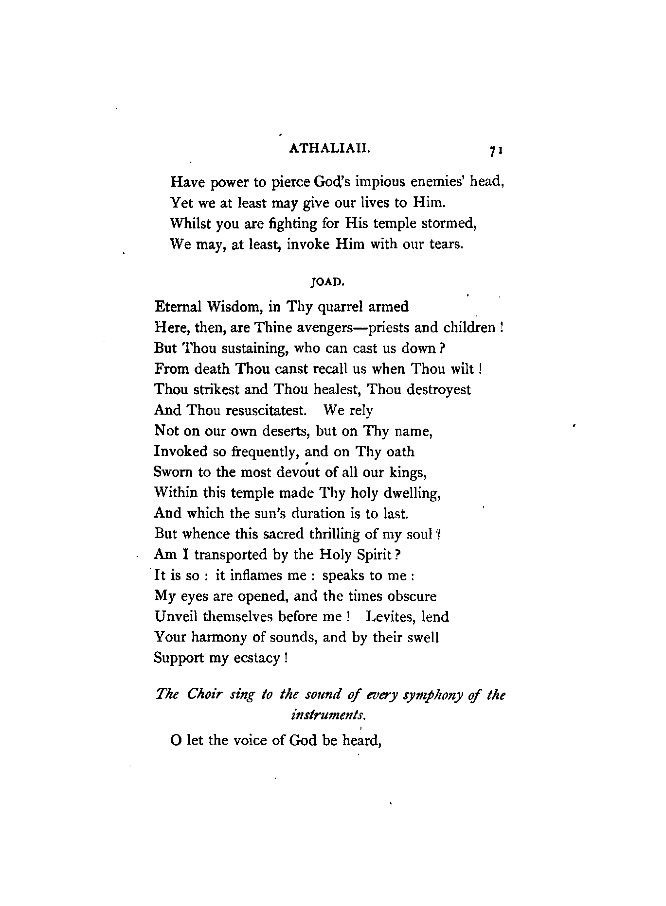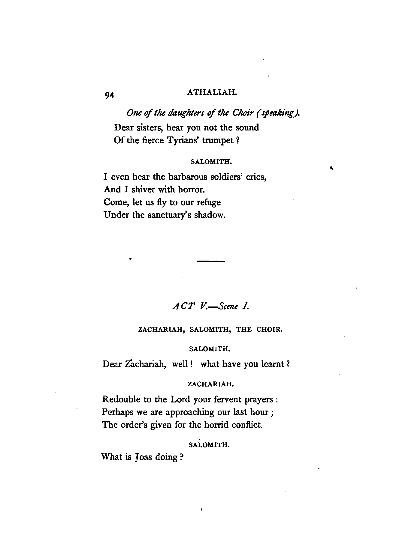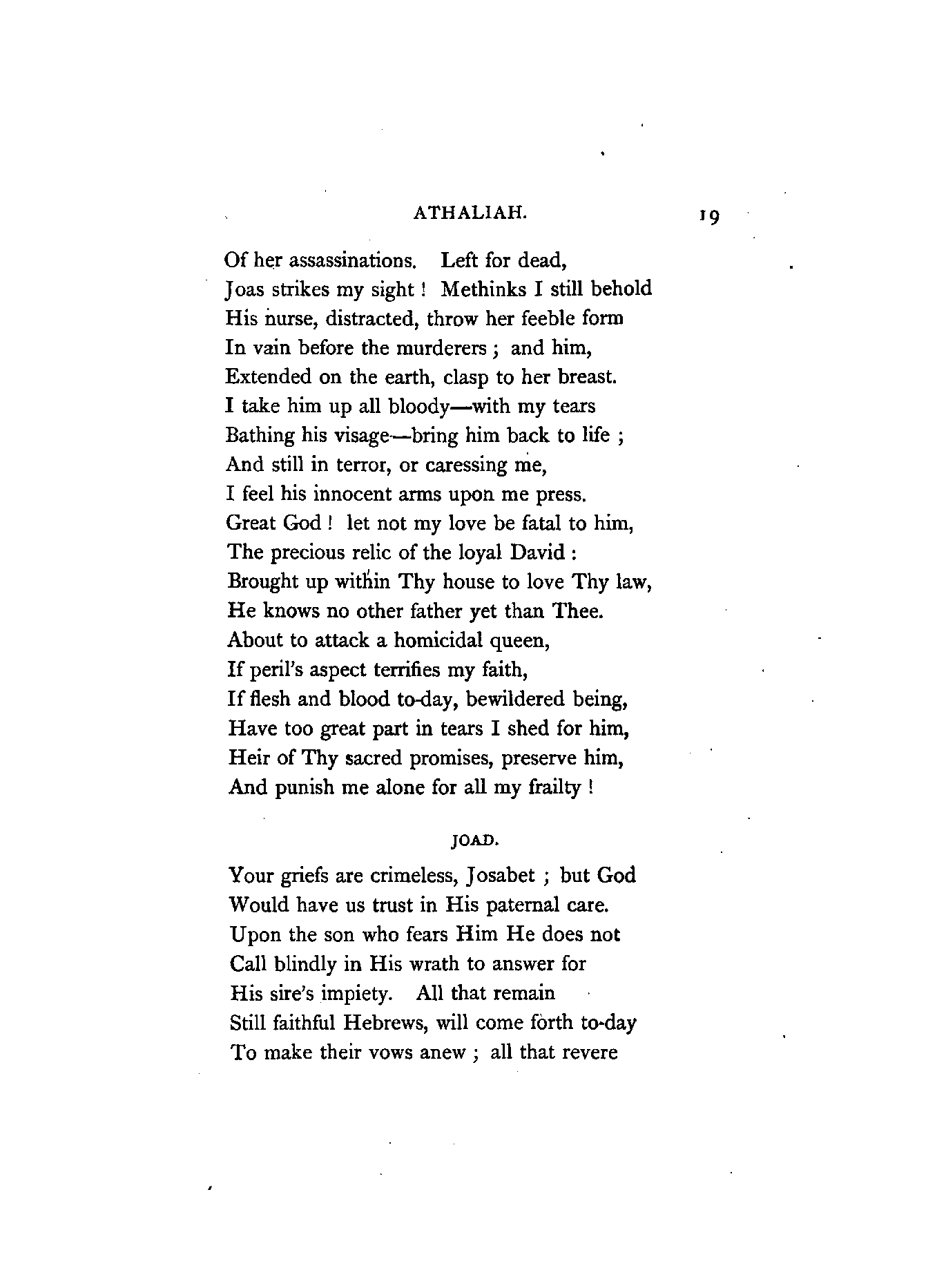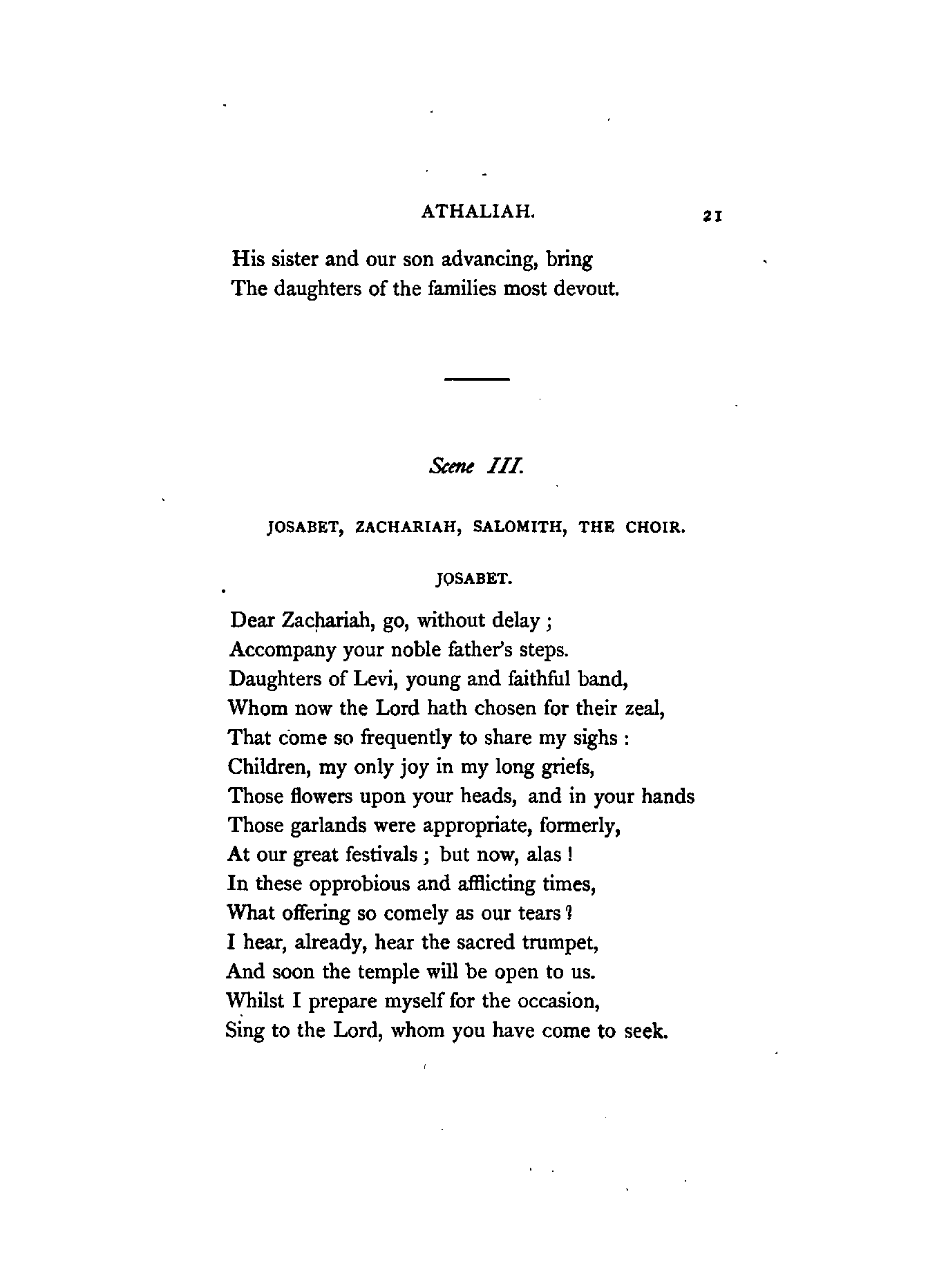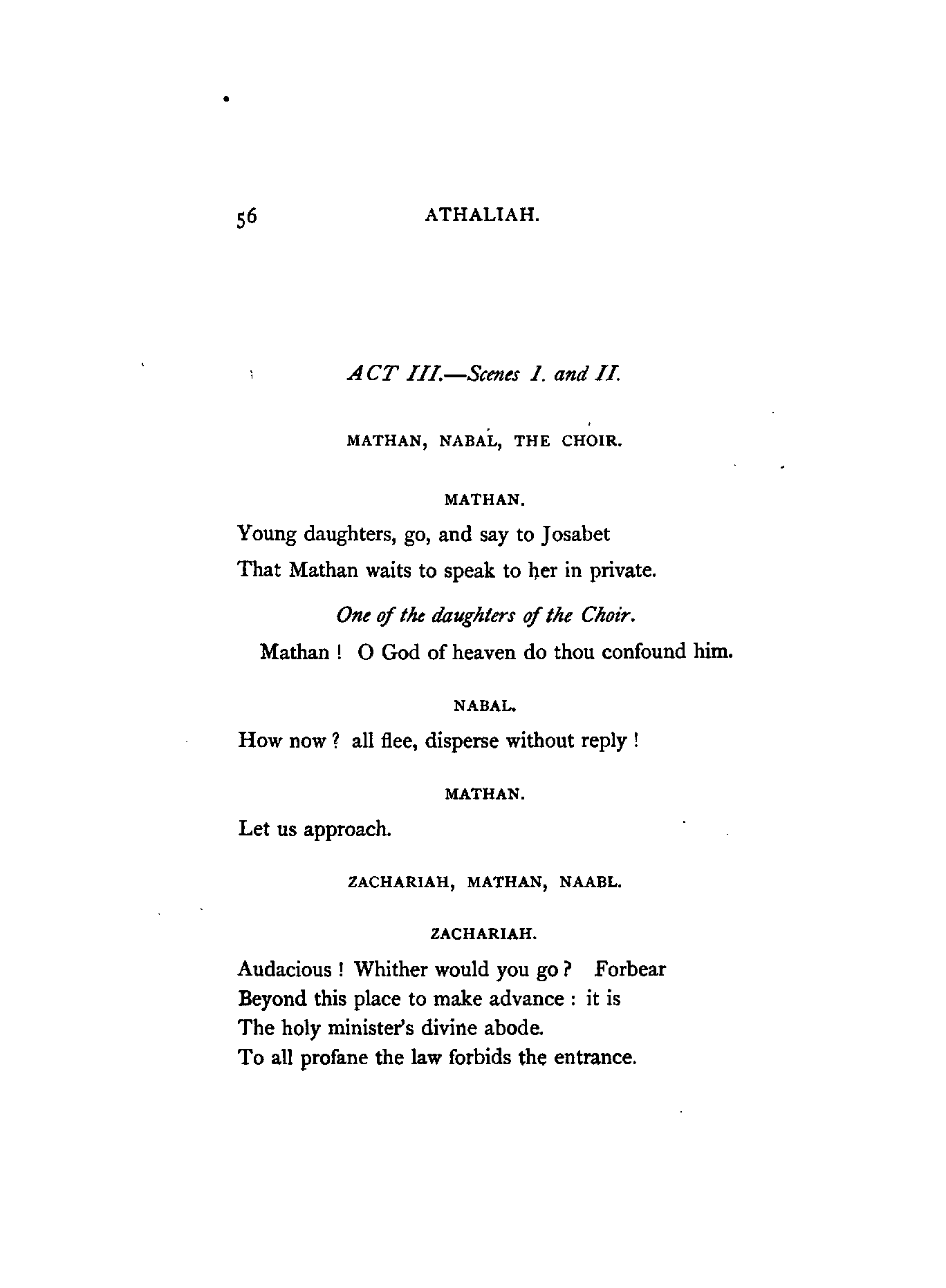 Racine, the author of Athalie (Athaliah), flourished in the latter half of the 17th century. At his appearance, Corneille, the great French Dramatist, was in the full splendour of his fame, whose rival he was afterwards recognised to be. Athalie is a Tragedy in rhyme, consisting of six Iambic feet, similar to the Alexandrine verse found occasionally in our English poets at the termination of a sentence or paragraph. Dryden, and a few others of less note, in the reign of Charles IL, introduced the rhyming drama to the English public; but the clank of its fetters was unpleasant to the British ear, which had become attuned to the freedom and majesty of blank verse. Blank verse, therefore, being our recognised vehicle of dramatic productions, has been employed in this translation. I did, however, intend in the first place to render the chorus into rhyme; but after maturer consideration it appeared to me that irregular blank verse would be more capable of tragic expression; and that it would also be more in harmony with the [4]Hebrew rhythm as represented by the scriptures, from which the plot was appropriated.