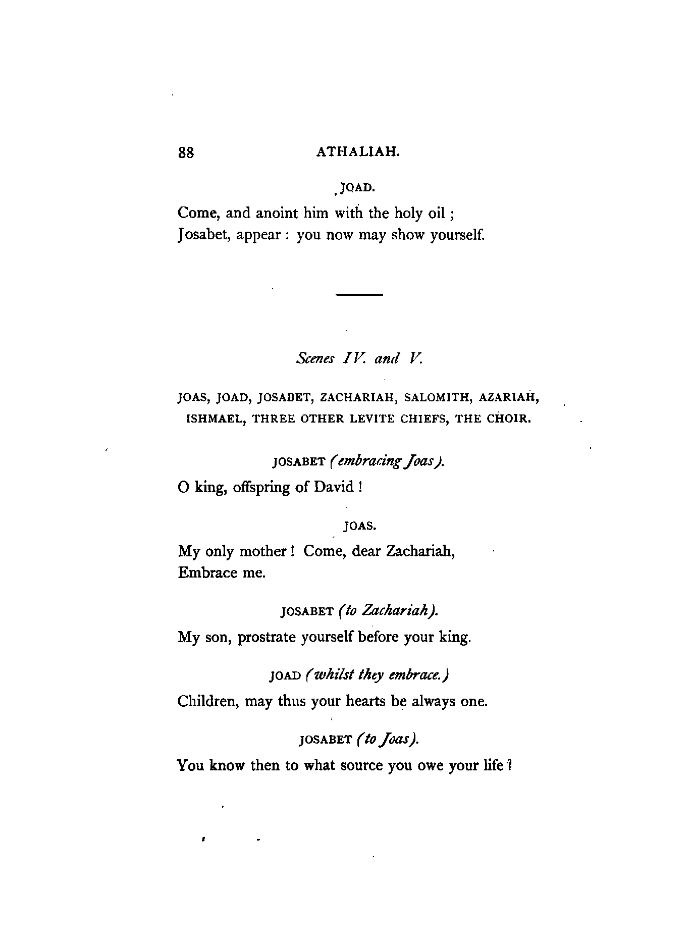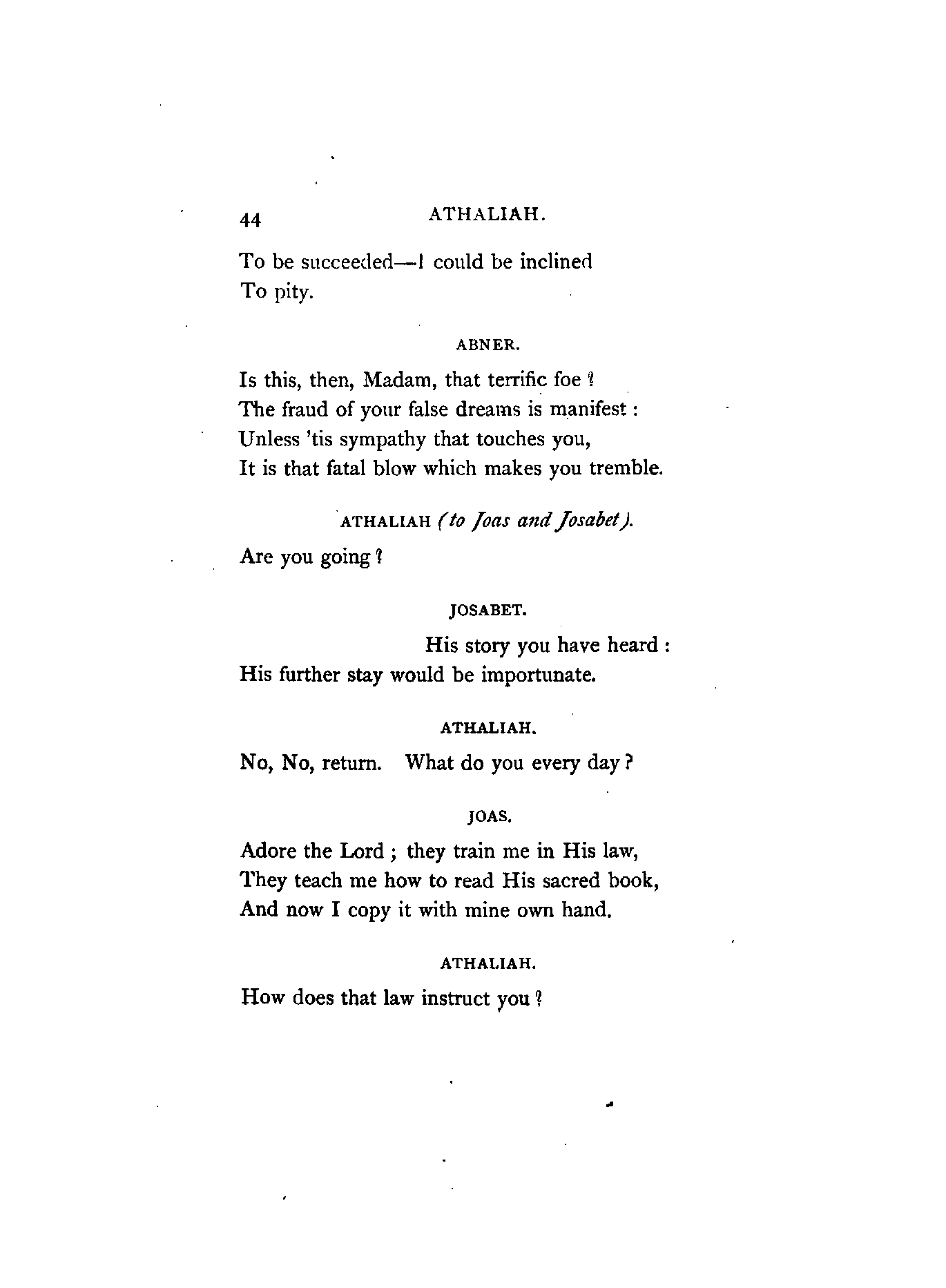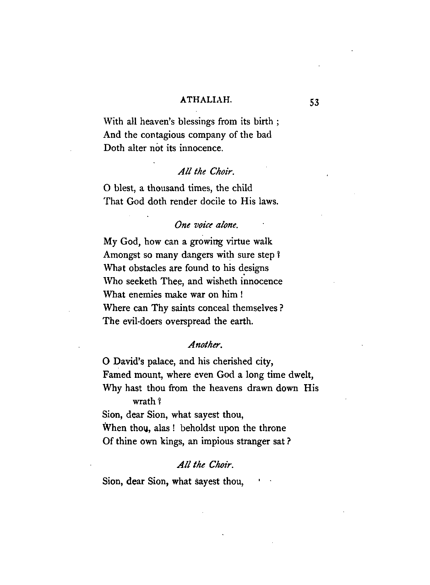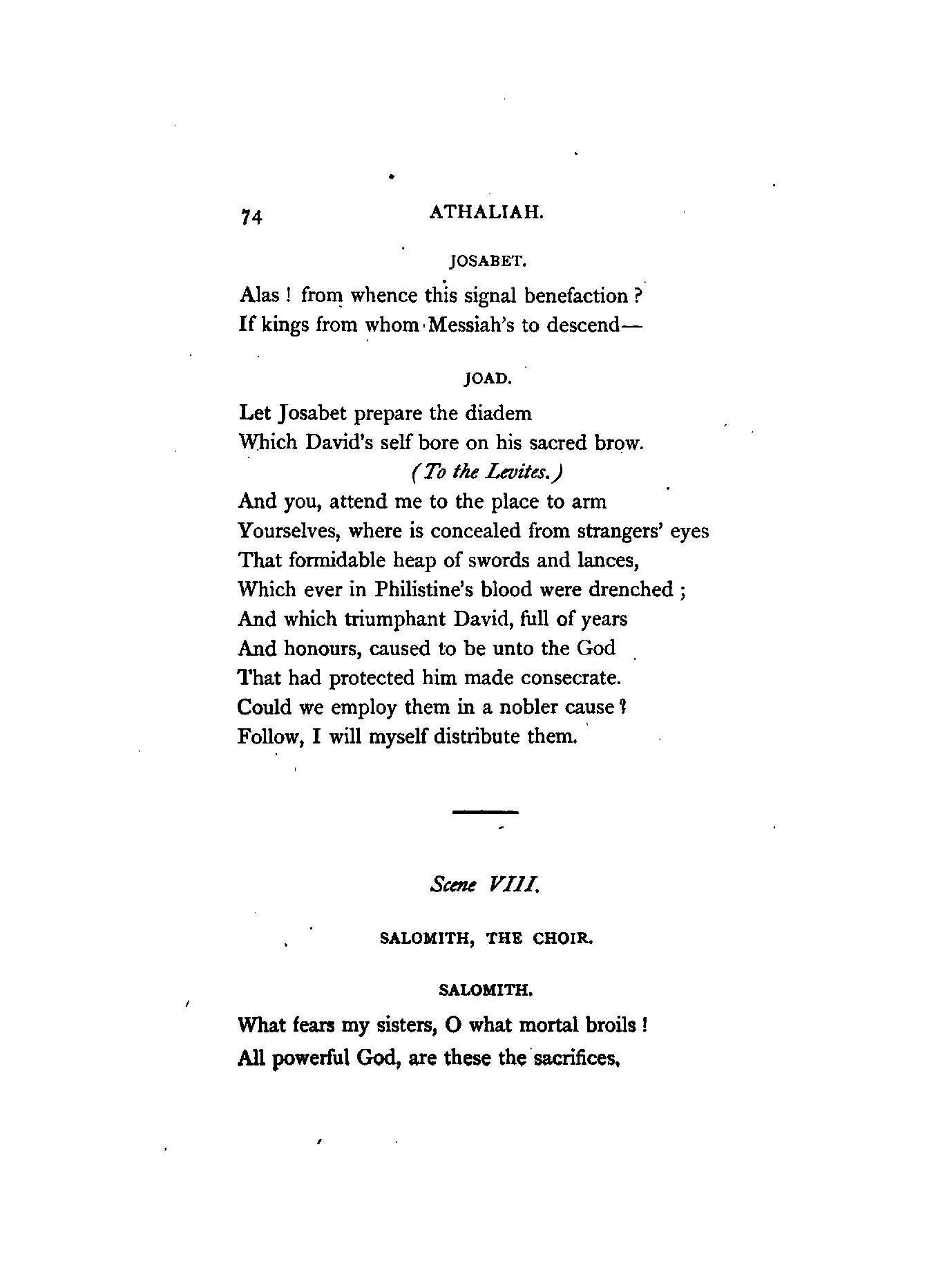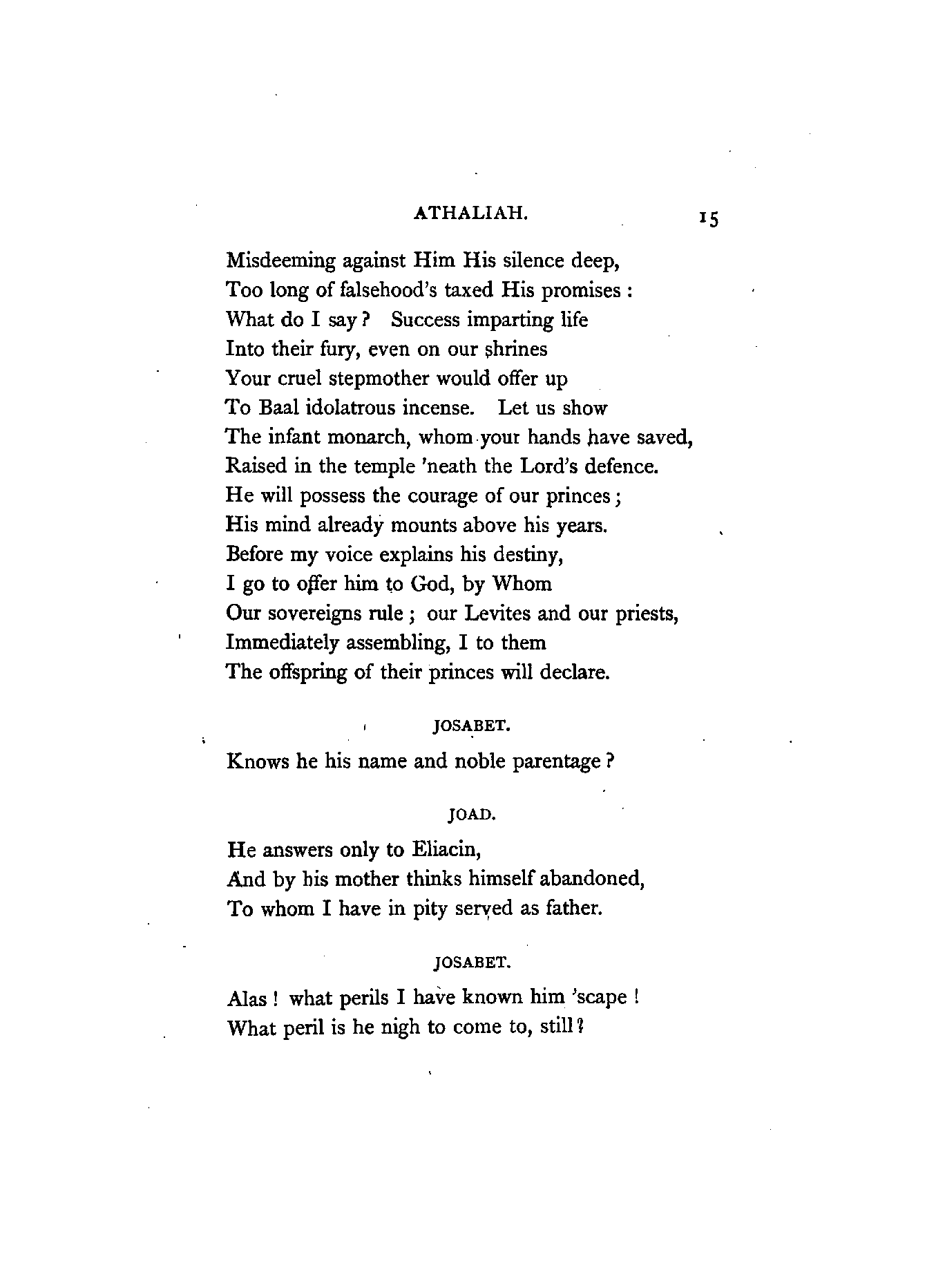 Racine, the author of Athalie (Athaliah), flourished in the latter half of the 17th century. At his appearance, Corneille, the great French Dramatist, was in the full splendour of his fame, whose rival he was afterwards recognised to be. Athalie is a Tragedy in rhyme, consisting of six Iambic feet, similar to the Alexandrine verse found occasionally in our English poets at the termination of a sentence or paragraph. Dryden, and a few others of less note, in the reign of Charles IL, introduced the rhyming drama to the English public; but the clank of its fetters was unpleasant to the British ear, which had become attuned to the freedom and majesty of blank verse. Blank verse, therefore, being our recognised vehicle of dramatic productions, has been employed in this translation. I did, however, intend in the first place to render the chorus into rhyme; but after maturer consideration it appeared to me that irregular blank verse would be more capable of tragic expression; and that it would also be more in harmony with the [4]Hebrew rhythm as represented by the scriptures, from which the plot was appropriated.