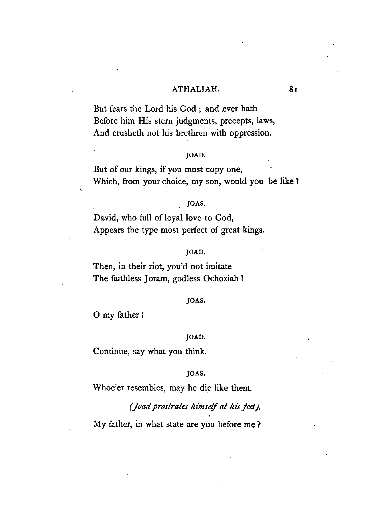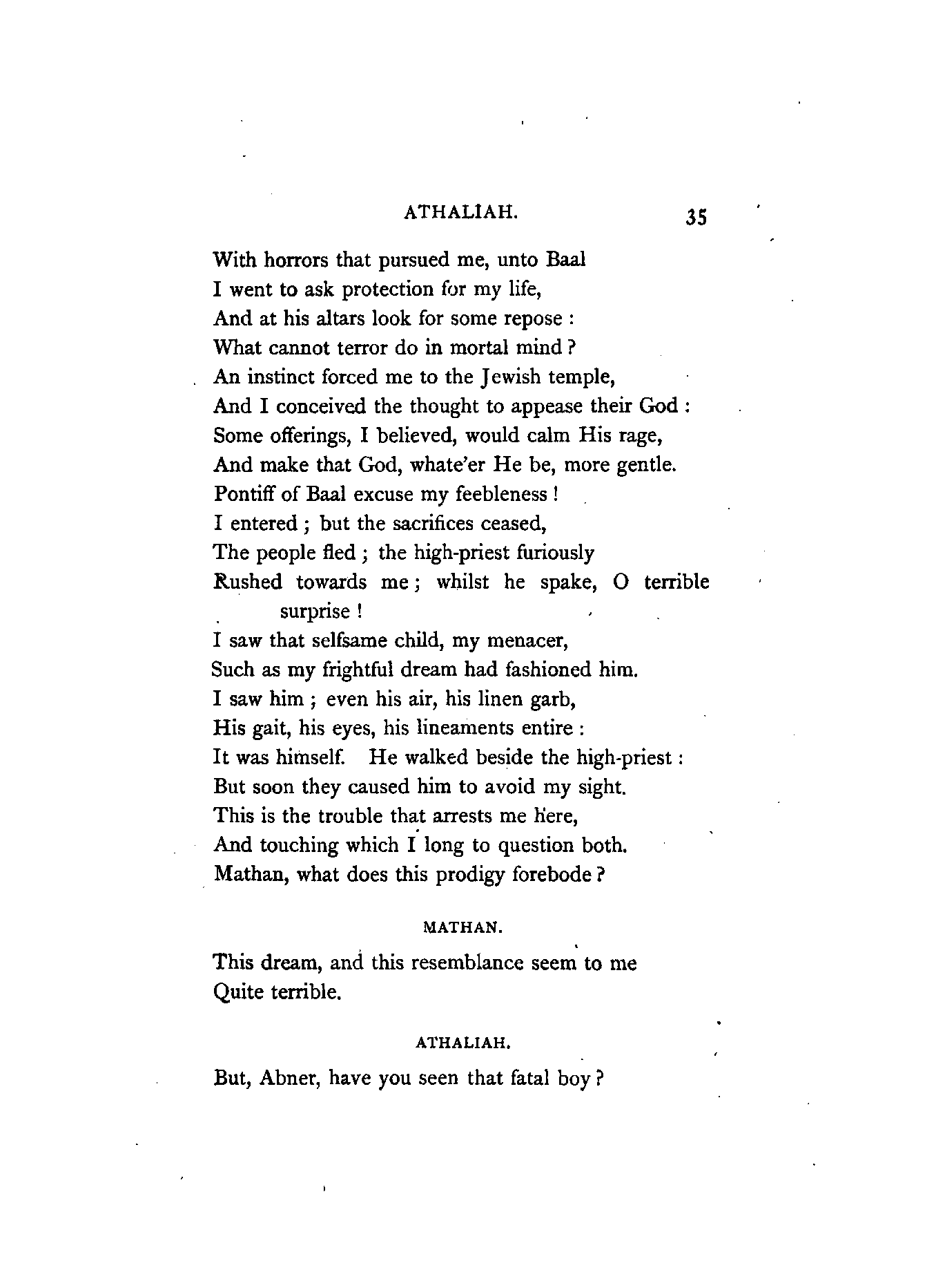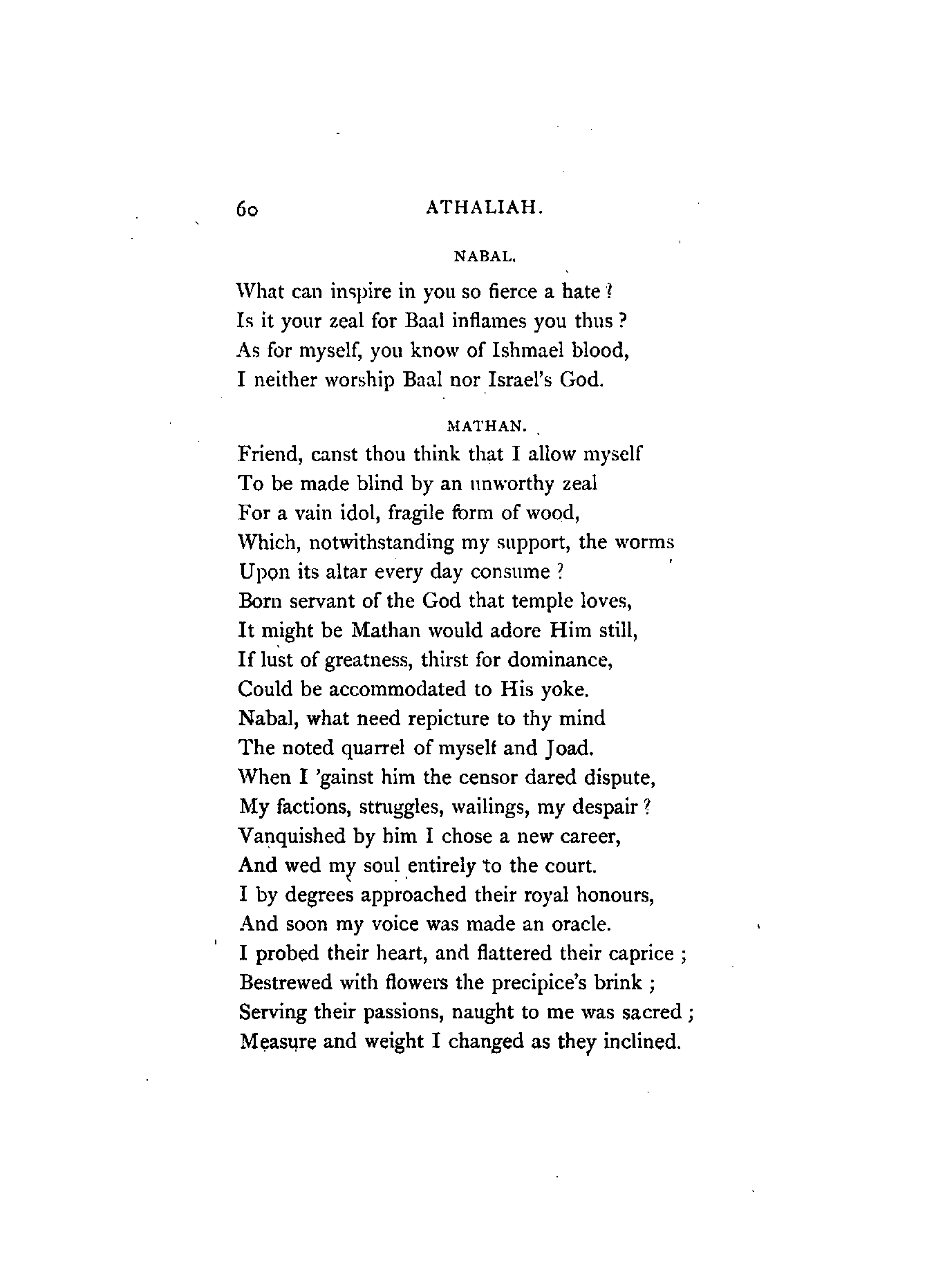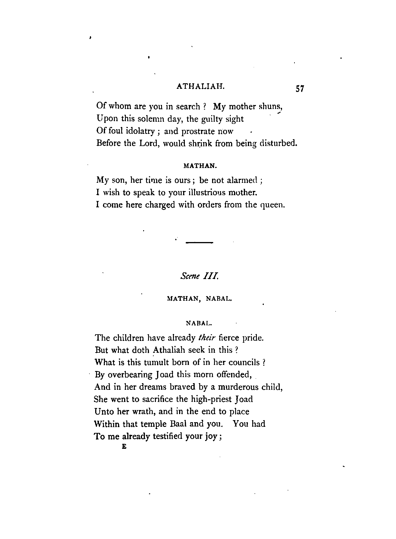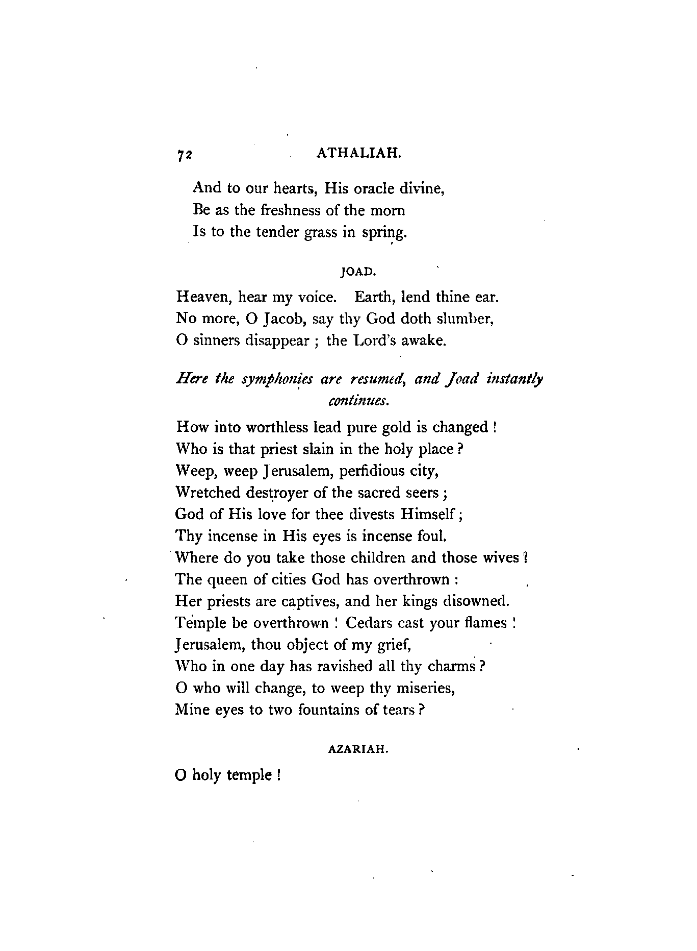 Racine, the author of Athalie (Athaliah), flourished in the latter half of the 17th century. At his appearance, Corneille, the great French Dramatist, was in the full splendour of his fame, whose rival he was afterwards recognised to be. Athalie is a Tragedy in rhyme, consisting of six Iambic feet, similar to the Alexandrine verse found occasionally in our English poets at the termination of a sentence or paragraph. Dryden, and a few others of less note, in the reign of Charles IL, introduced the rhyming drama to the English public; but the clank of its fetters was unpleasant to the British ear, which had become attuned to the freedom and majesty of blank verse. Blank verse, therefore, being our recognised vehicle of dramatic productions, has been employed in this translation. I did, however, intend in the first place to render the chorus into rhyme; but after maturer consideration it appeared to me that irregular blank verse would be more capable of tragic expression; and that it would also be more in harmony with the [4]Hebrew rhythm as represented by the scriptures, from which the plot was appropriated.