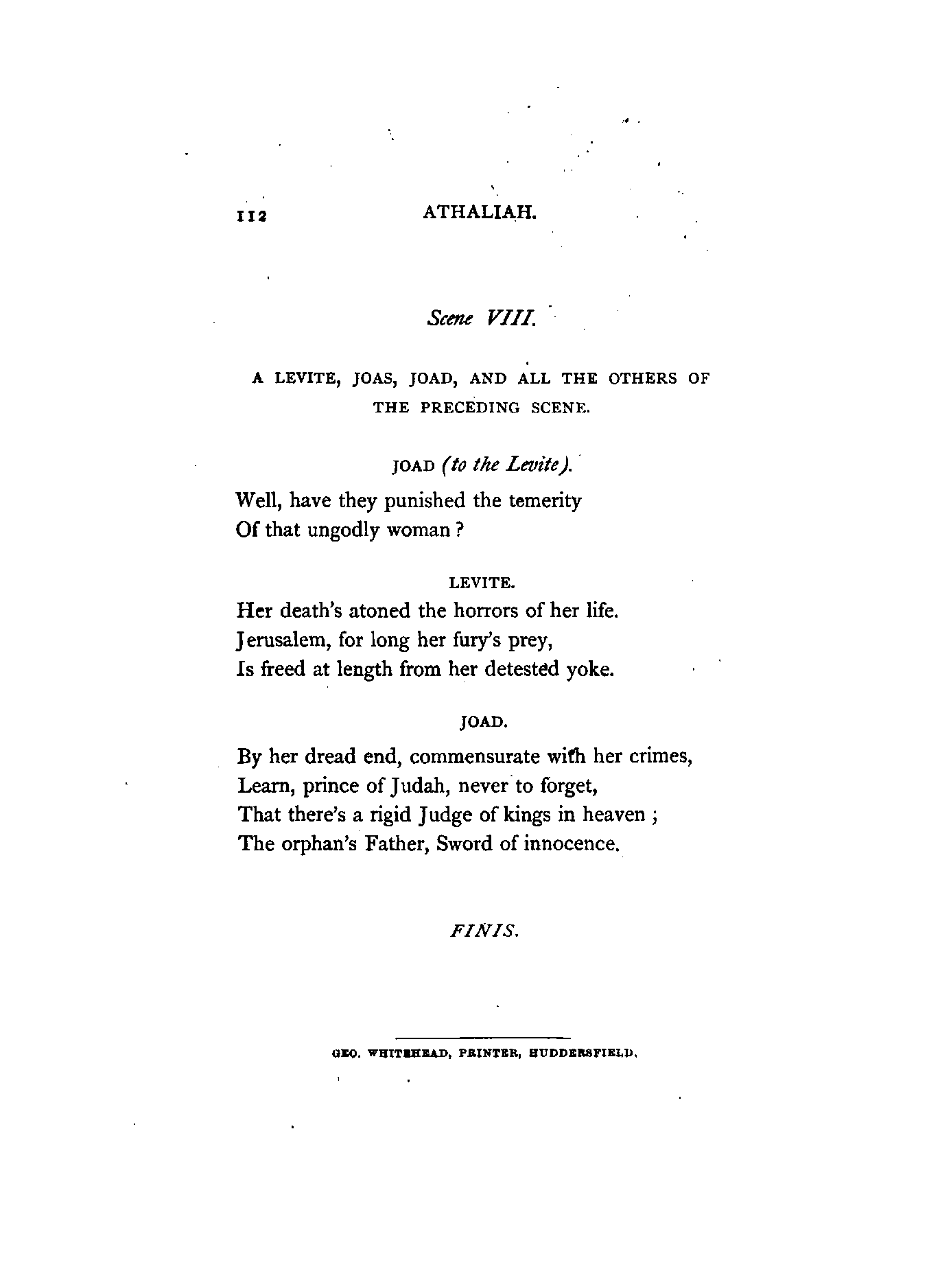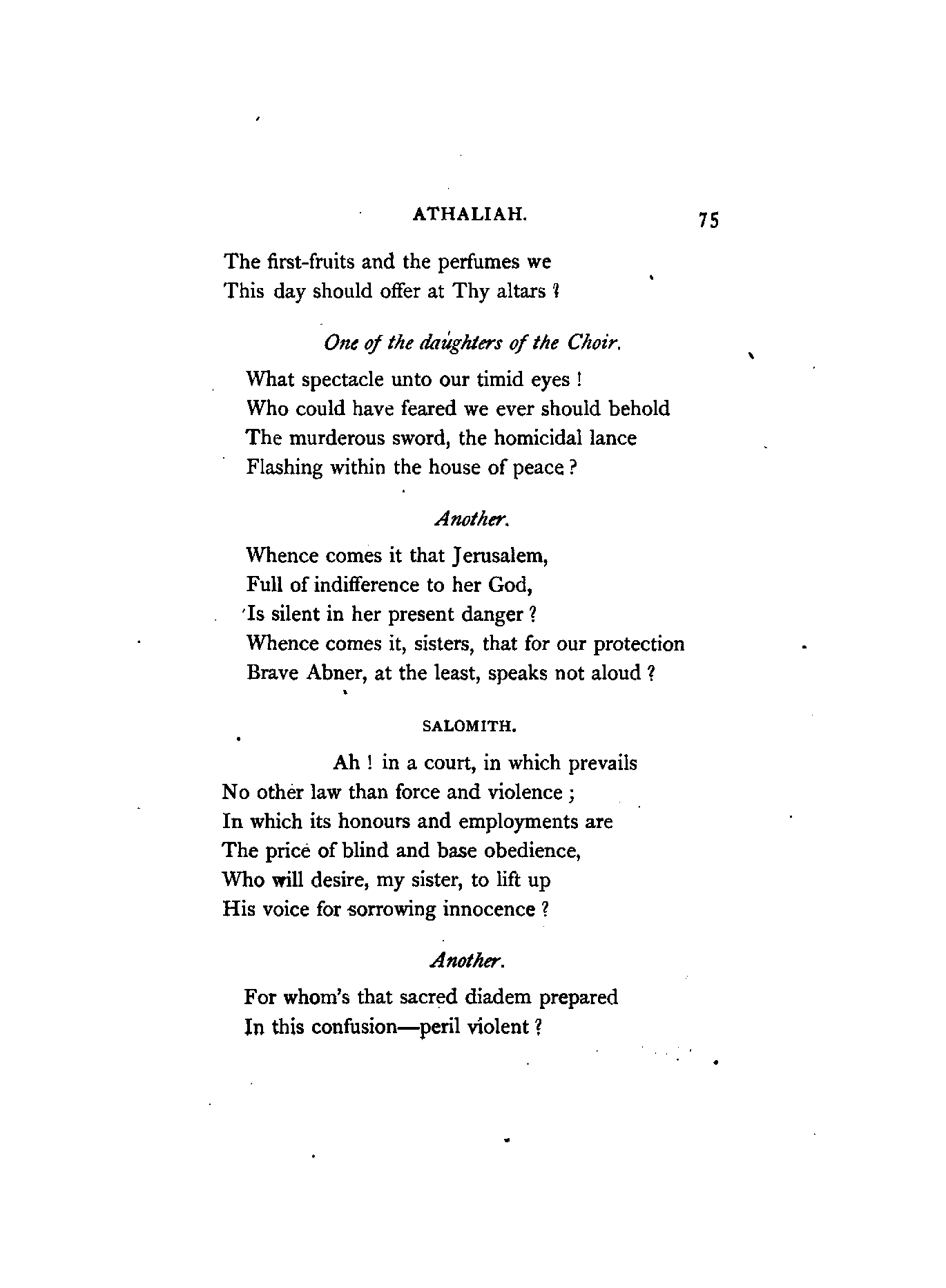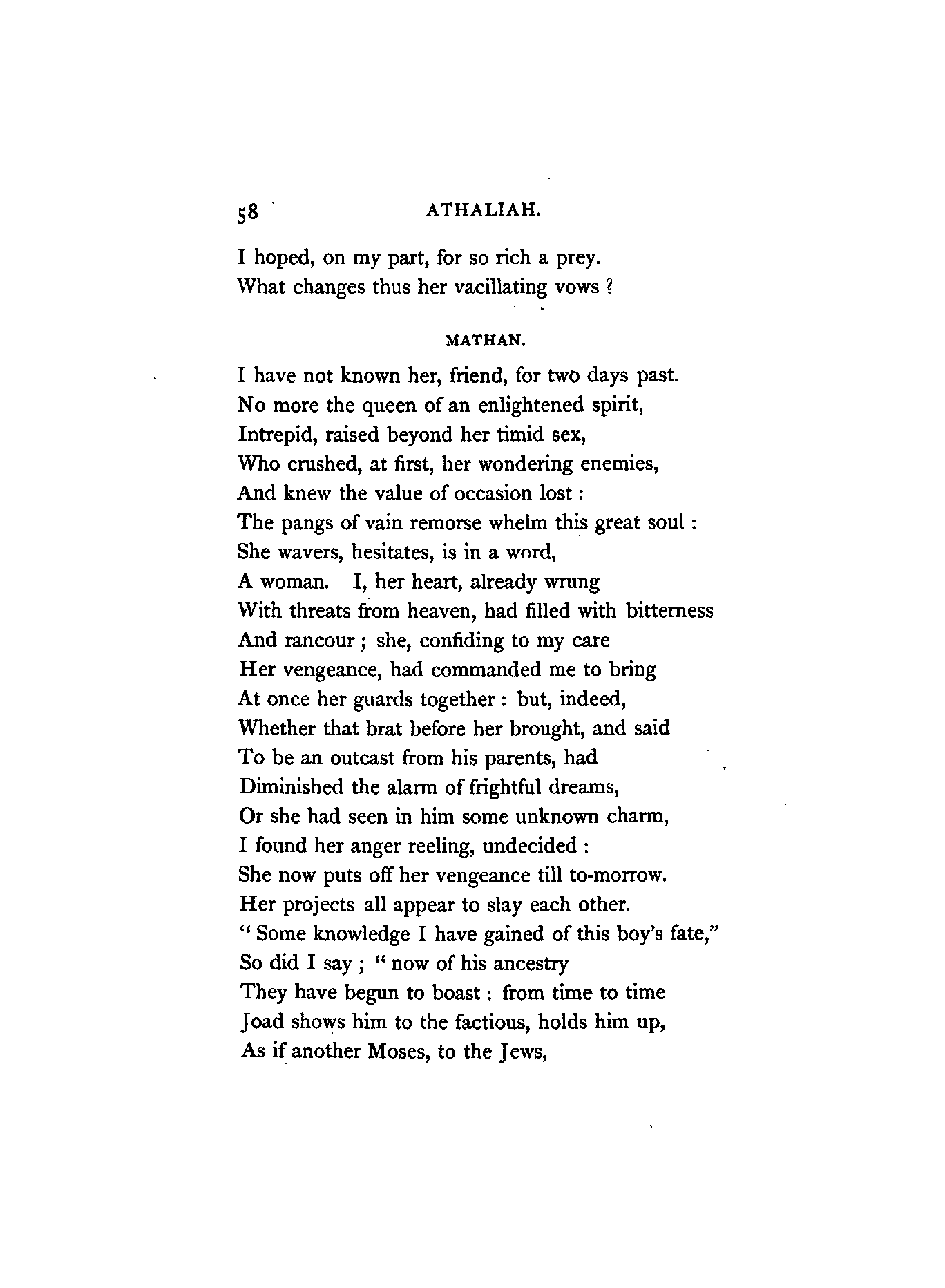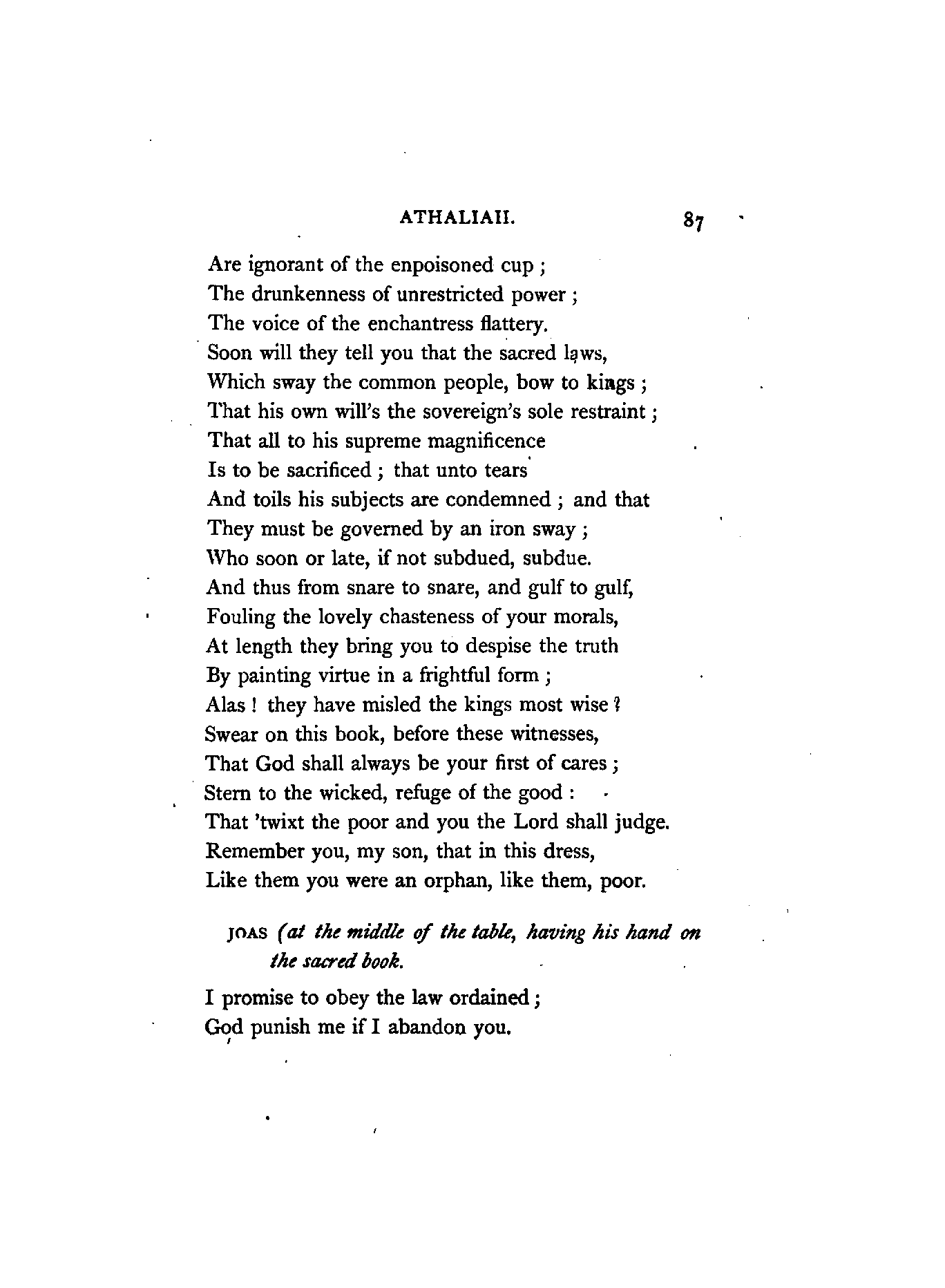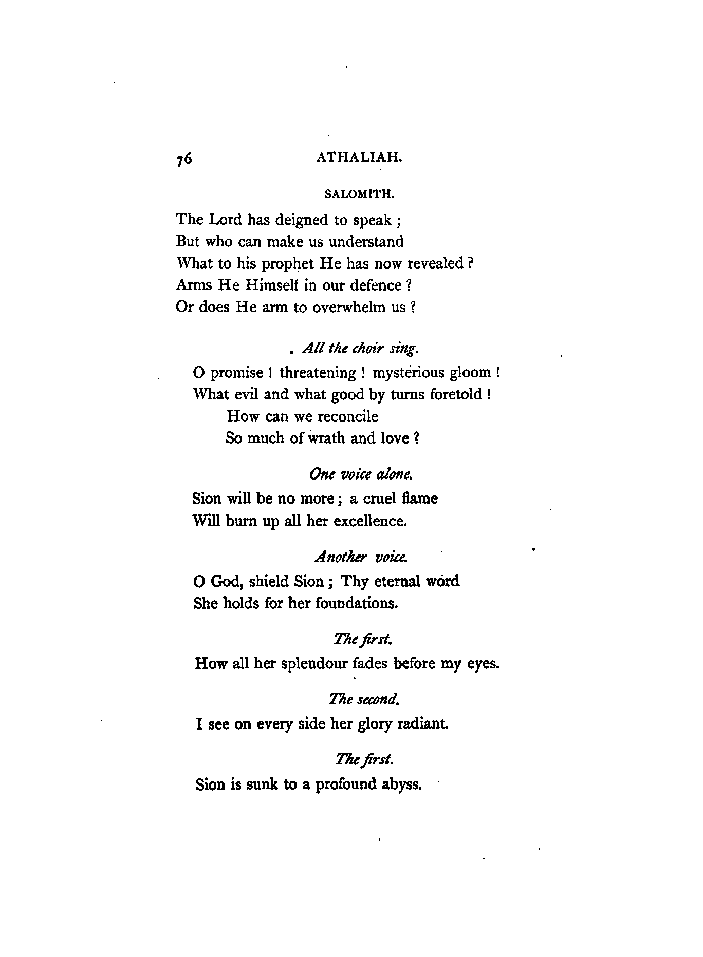Racine, the author of Athalie (Athaliah), flourished in the latter half of the 17th century. At his appearance, Corneille, the great French Dramatist, was in the full splendour of his fame, whose rival he was afterwards recognised to be. Athalie is a Tragedy in rhyme, consisting of six Iambic feet, similar to the Alexandrine verse found occasionally in our English poets at the termination of a sentence or paragraph. Dryden, and a few others of less note, in the reign of Charles IL, introduced the rhyming drama to the English public; but the clank of its fetters was unpleasant to the British ear, which had become attuned to the freedom and majesty of blank verse. Blank verse, therefore, being our recognised vehicle of dramatic productions, has been employed in this translation. I did, however, intend in the first place to render the chorus into rhyme; but after maturer consideration it appeared to me that irregular blank verse would be more capable of tragic expression; and that it would also be more in harmony with the [4]Hebrew rhythm as represented by the scriptures, from which the plot was appropriated.