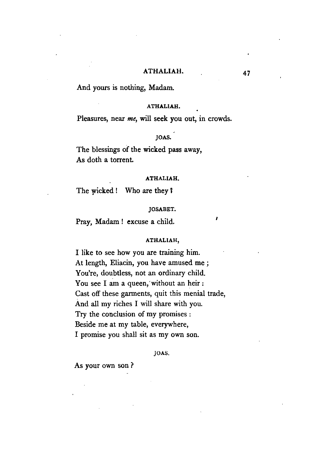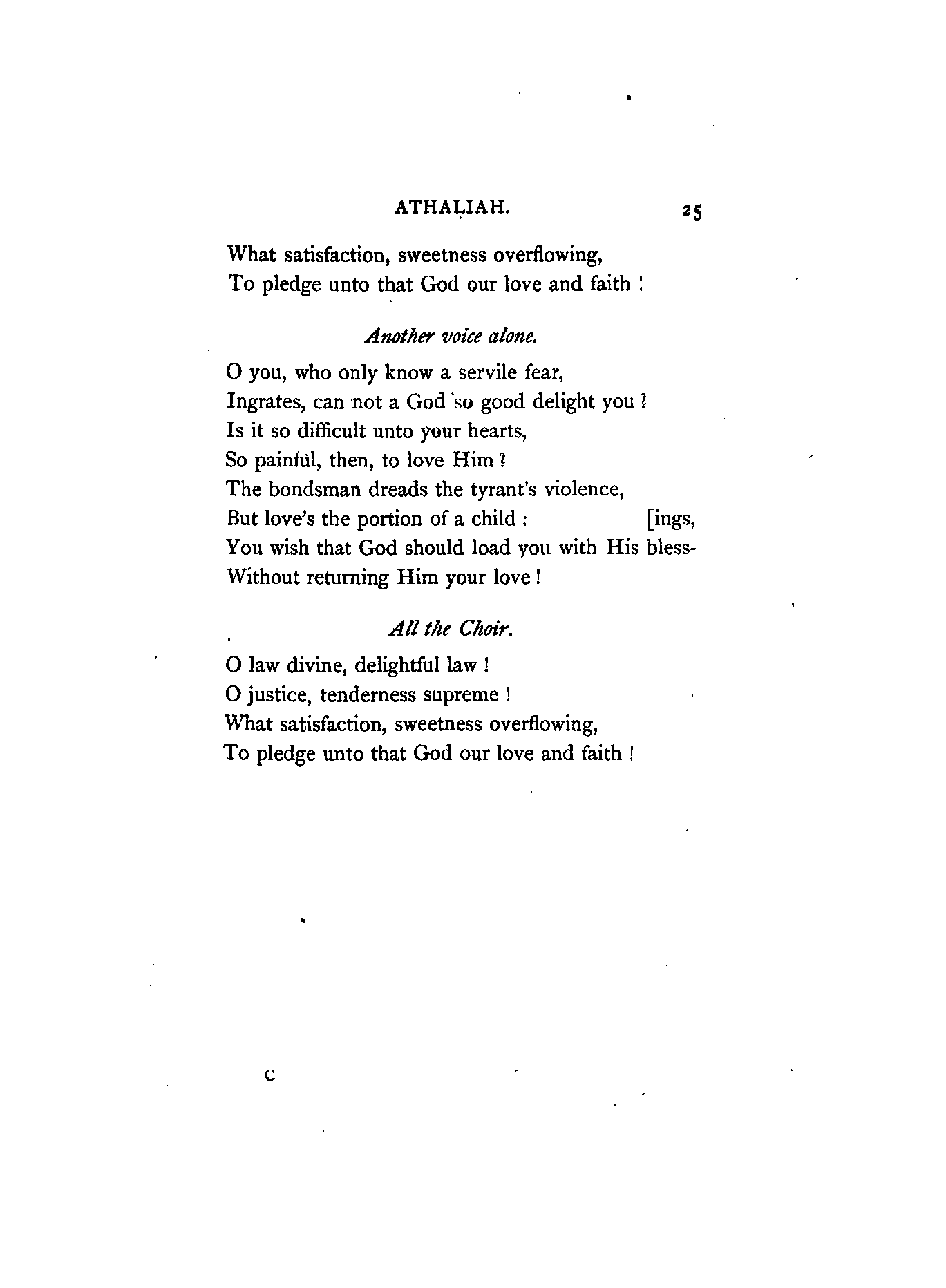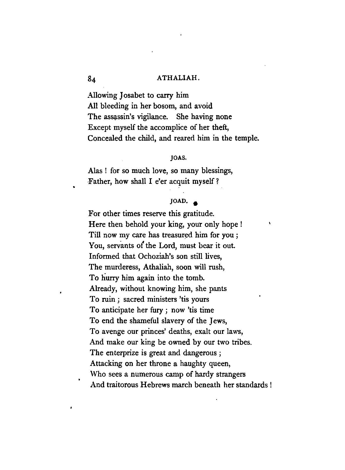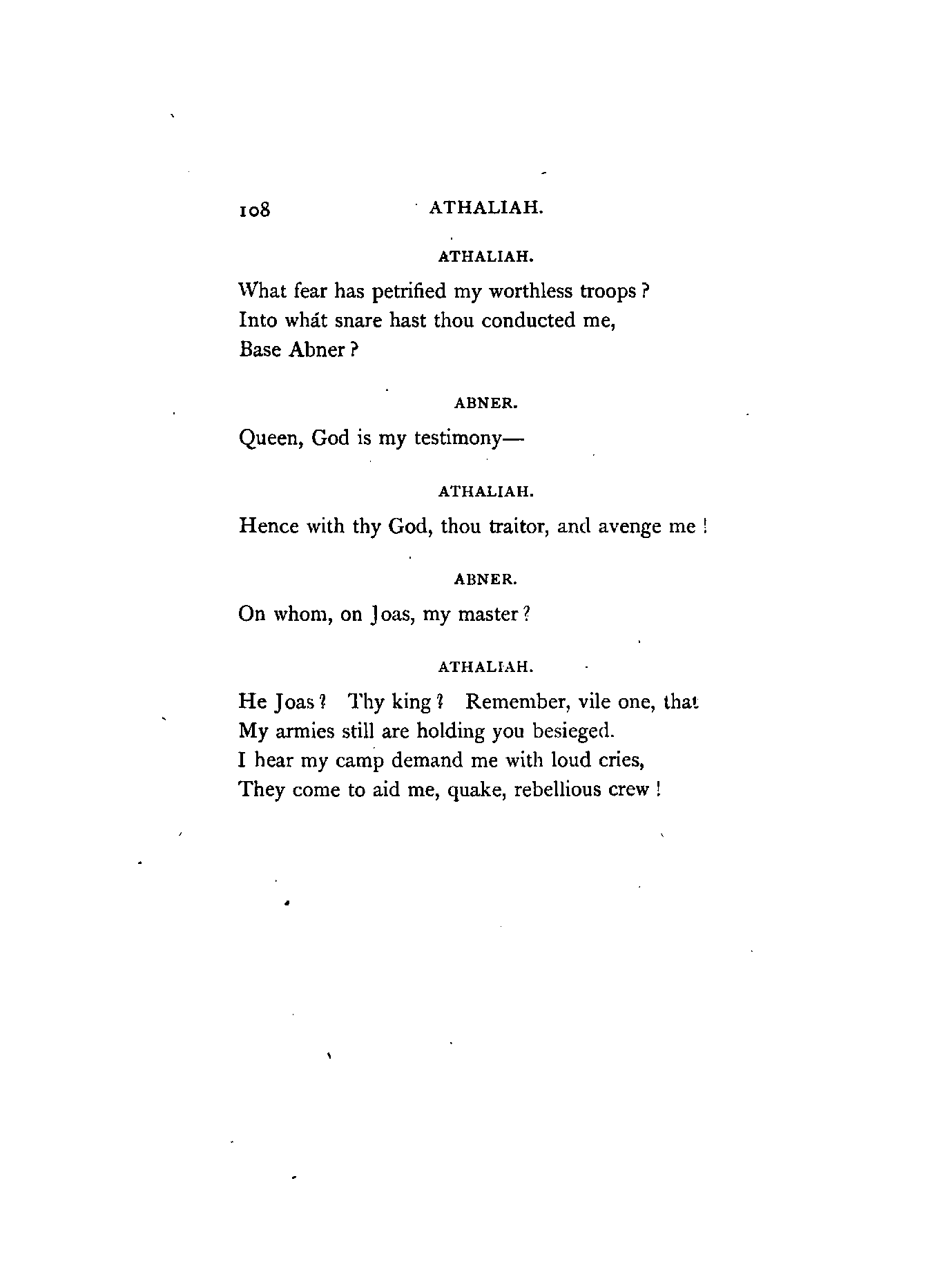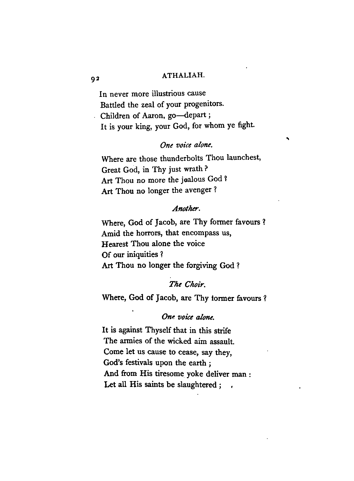 Racine, the author of Athalie (Athaliah), flourished in the latter half of the 17th century. At his appearance, Corneille, the great French Dramatist, was in the full splendour of his fame, whose rival he was afterwards recognised to be. Athalie is a Tragedy in rhyme, consisting of six Iambic feet, similar to the Alexandrine verse found occasionally in our English poets at the termination of a sentence or paragraph. Dryden, and a few others of less note, in the reign of Charles IL, introduced the rhyming drama to the English public; but the clank of its fetters was unpleasant to the British ear, which had become attuned to the freedom and majesty of blank verse. Blank verse, therefore, being our recognised vehicle of dramatic productions, has been employed in this translation. I did, however, intend in the first place to render the chorus into rhyme; but after maturer consideration it appeared to me that irregular blank verse would be more capable of tragic expression; and that it would also be more in harmony with the [4]Hebrew rhythm as represented by the scriptures, from which the plot was appropriated.