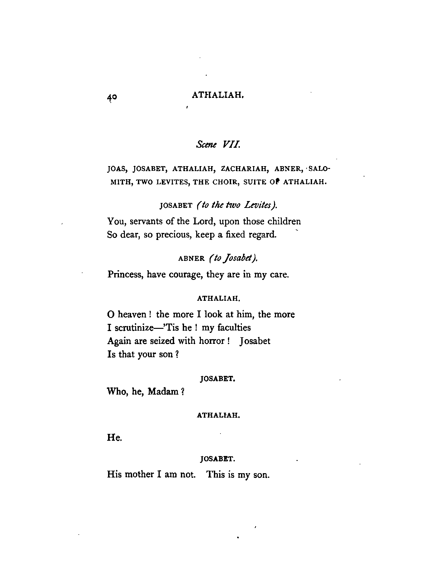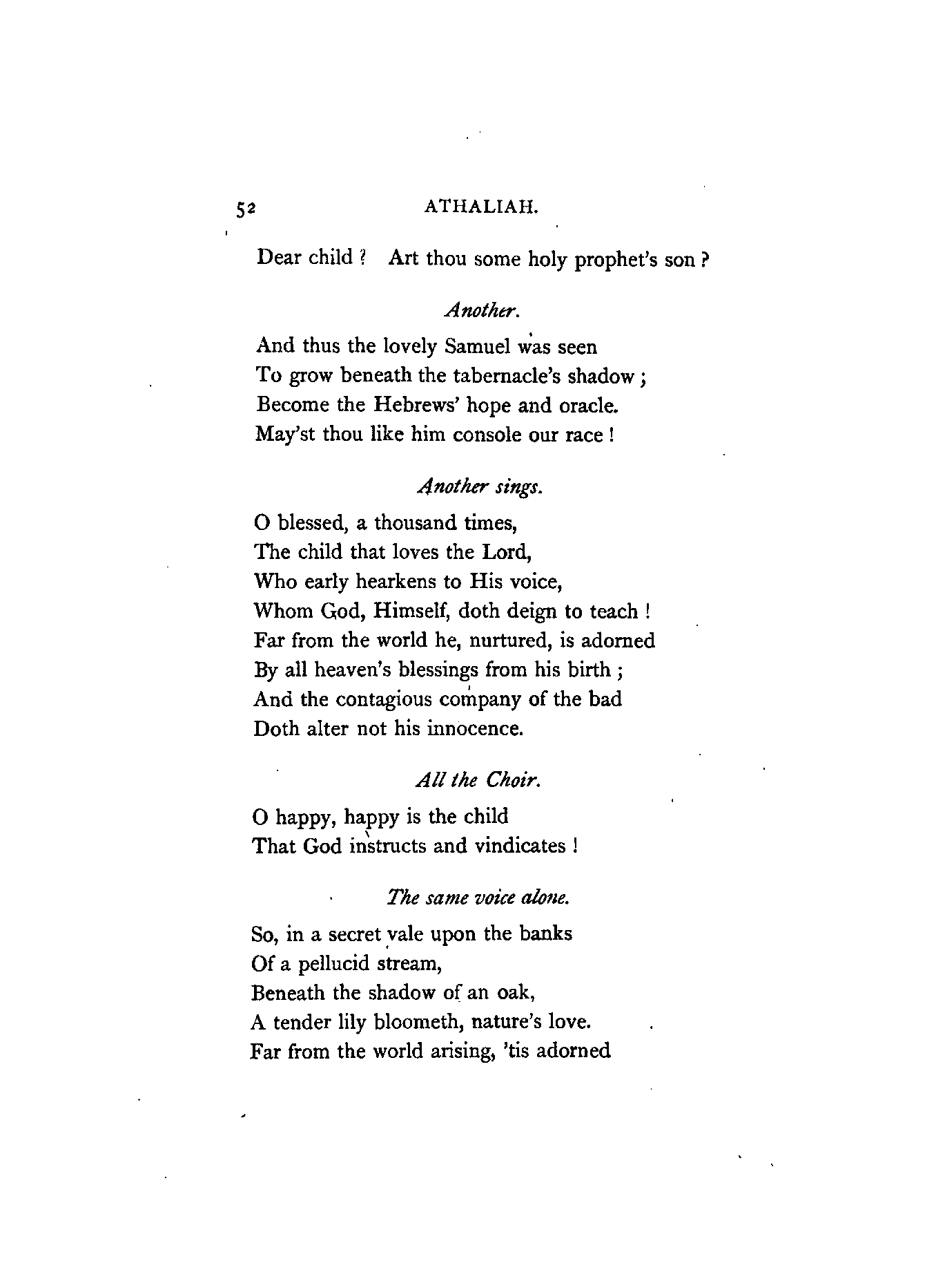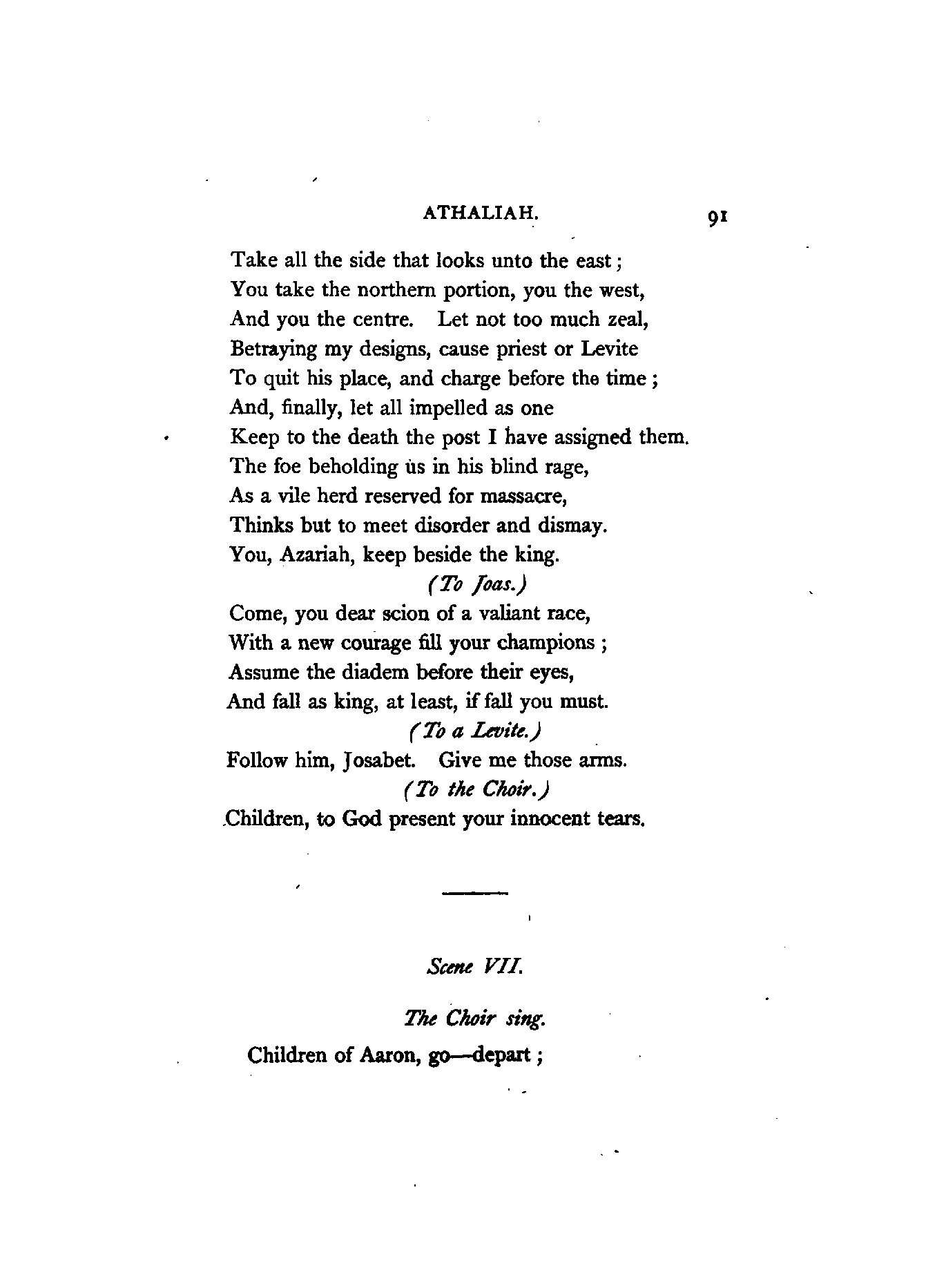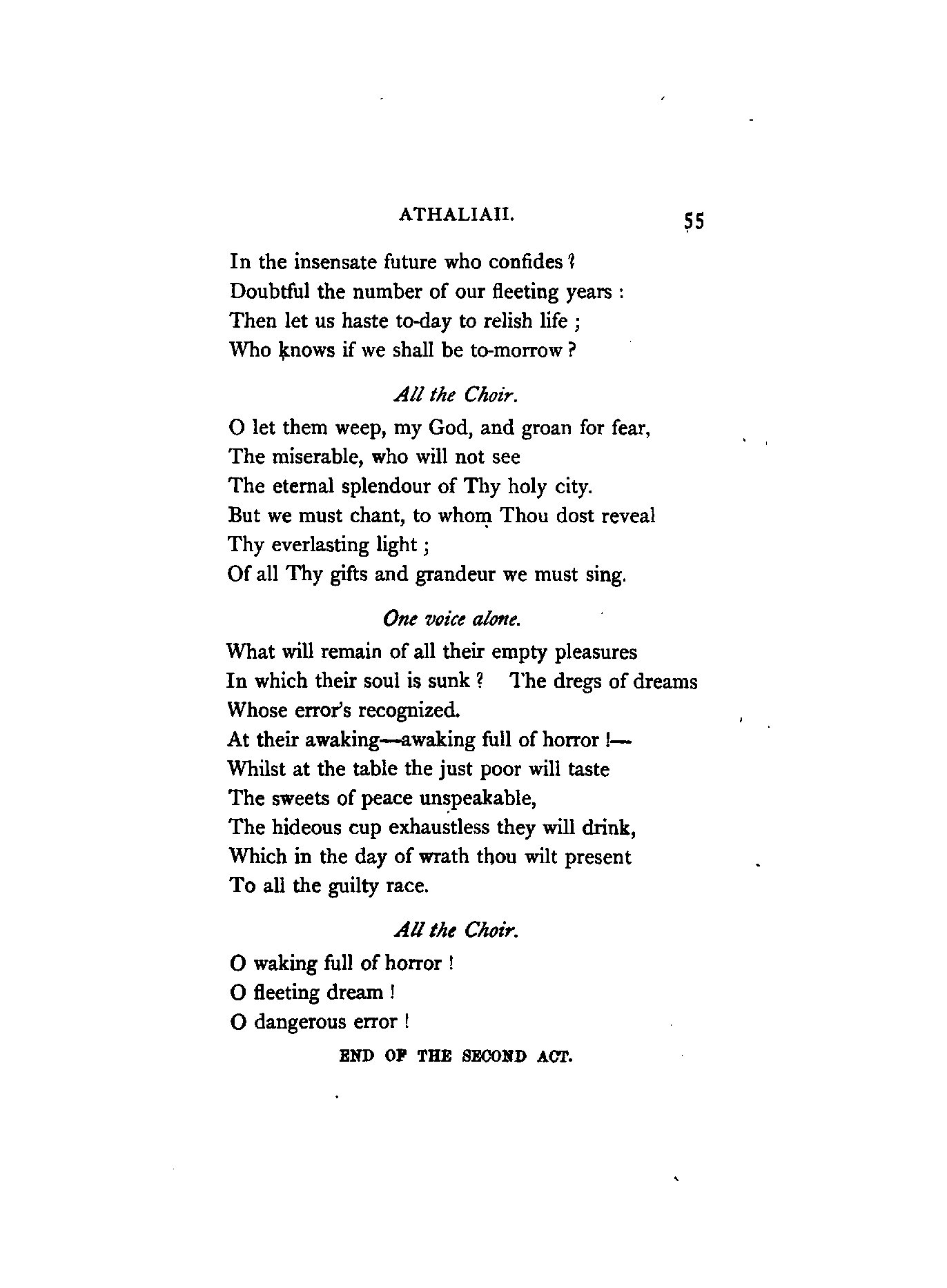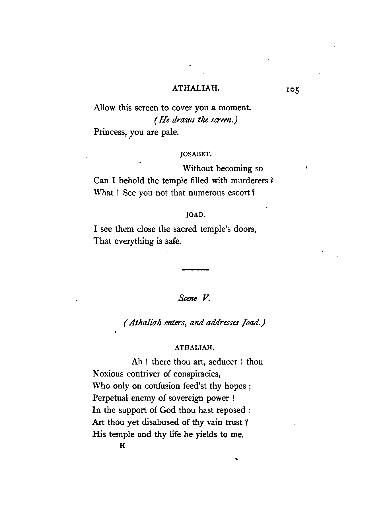 Racine, the author of Athalie (Athaliah), flourished in the latter half of the 17th century. At his appearance, Corneille, the great French Dramatist, was in the full splendour of his fame, whose rival he was afterwards recognised to be. Athalie is a Tragedy in rhyme, consisting of six Iambic feet, similar to the Alexandrine verse found occasionally in our English poets at the termination of a sentence or paragraph. Dryden, and a few others of less note, in the reign of Charles IL, introduced the rhyming drama to the English public; but the clank of its fetters was unpleasant to the British ear, which had become attuned to the freedom and majesty of blank verse. Blank verse, therefore, being our recognised vehicle of dramatic productions, has been employed in this translation. I did, however, intend in the first place to render the chorus into rhyme; but after maturer consideration it appeared to me that irregular blank verse would be more capable of tragic expression; and that it would also be more in harmony with the [4]Hebrew rhythm as represented by the scriptures, from which the plot was appropriated.