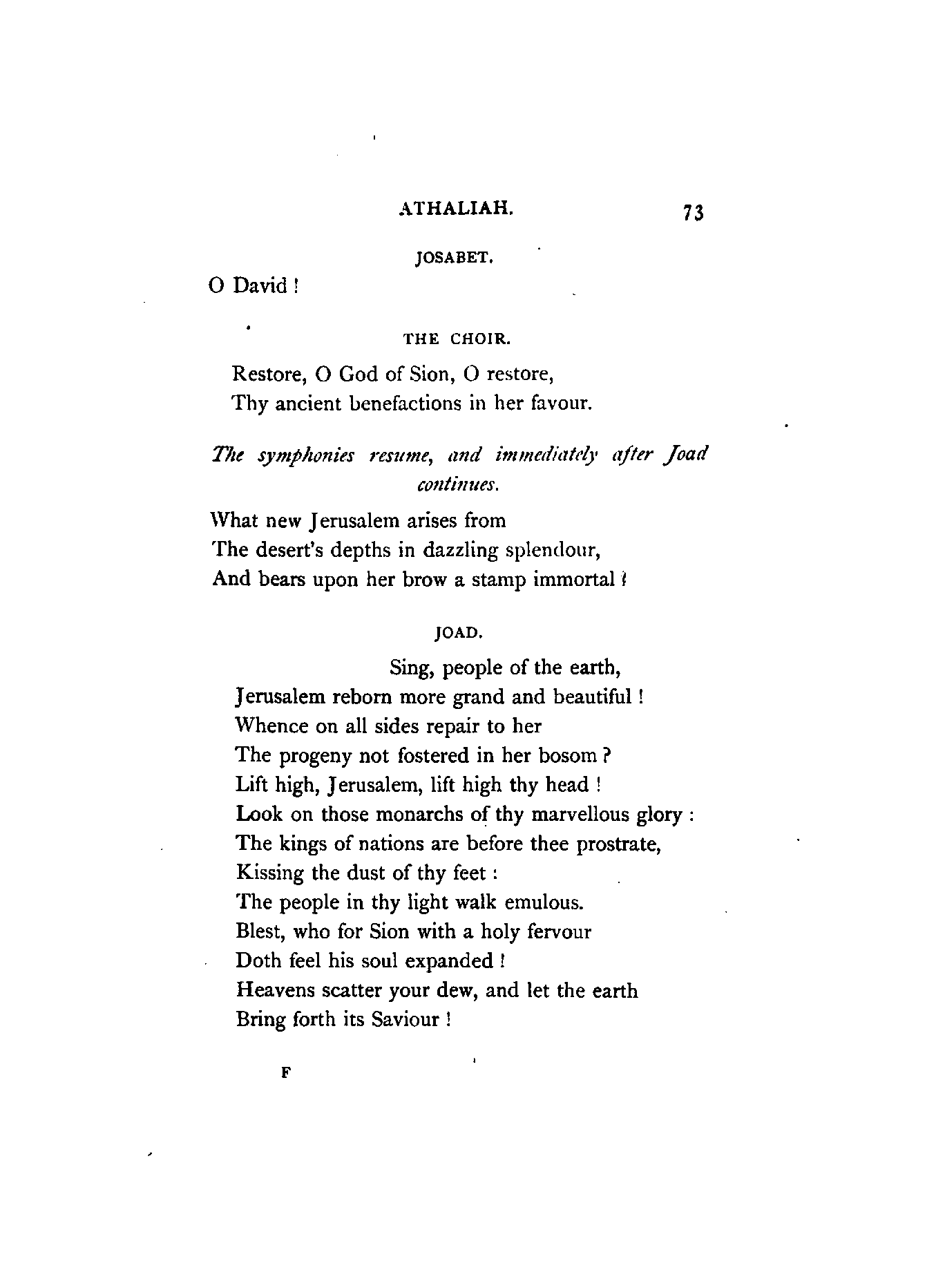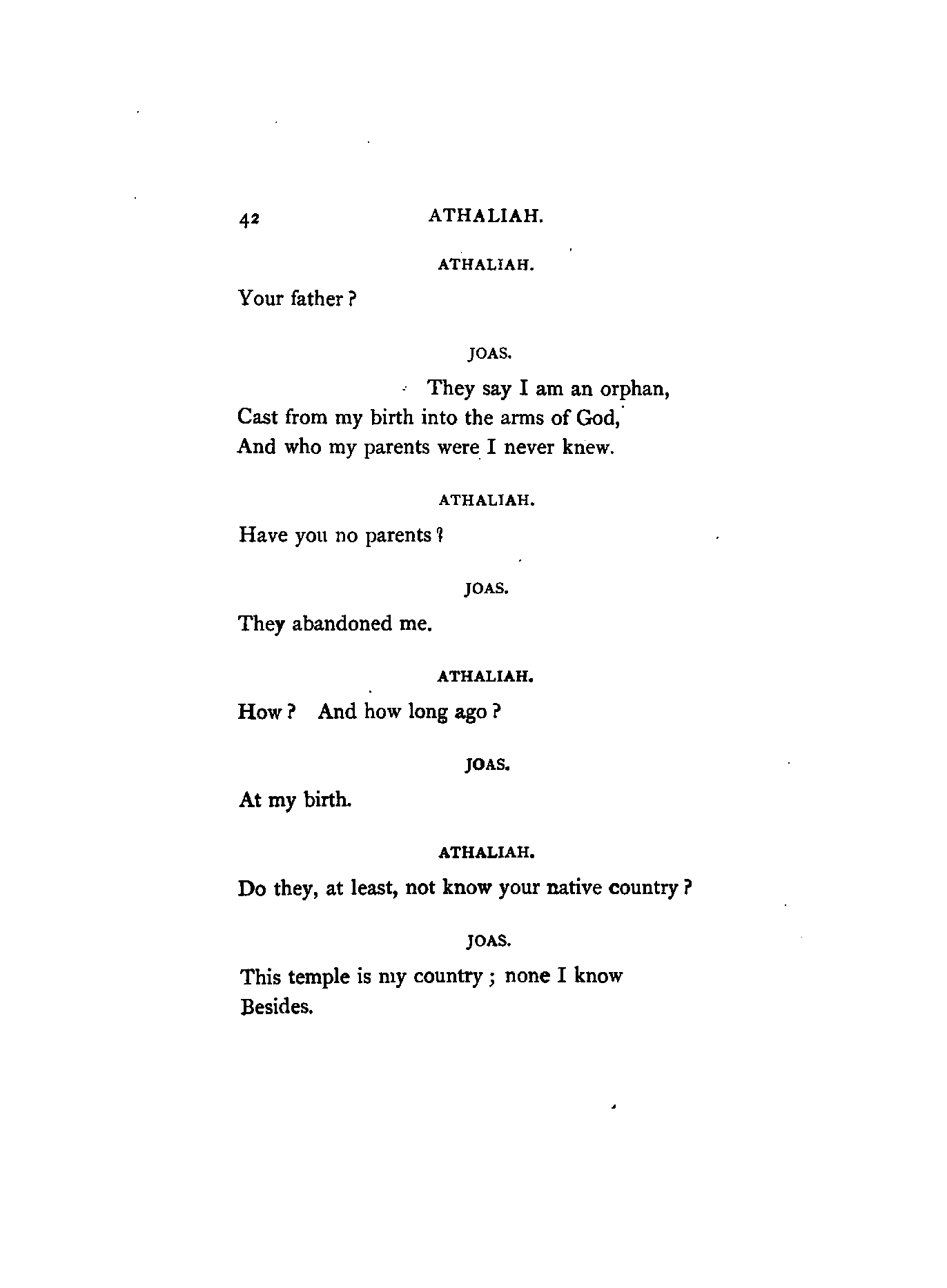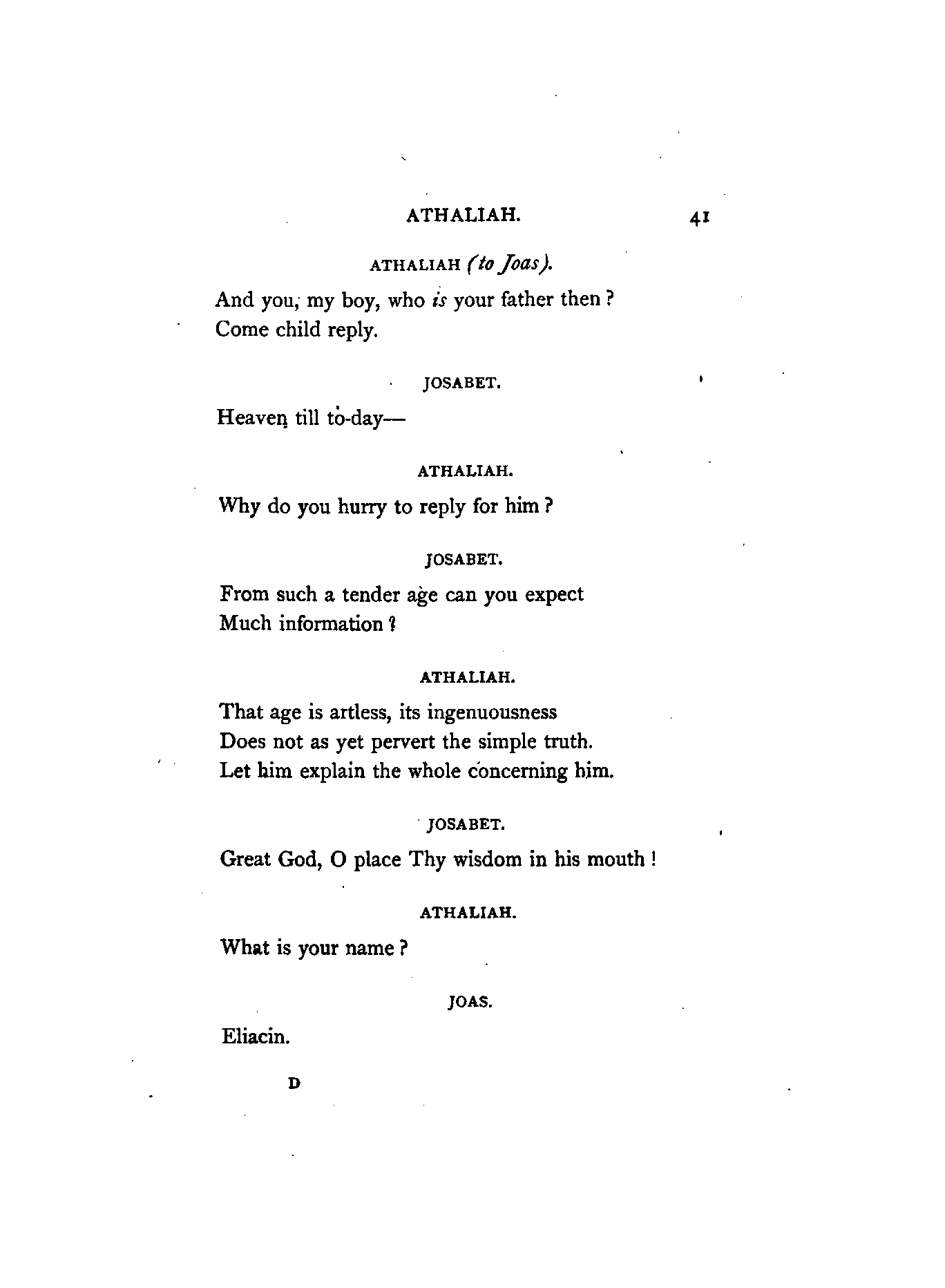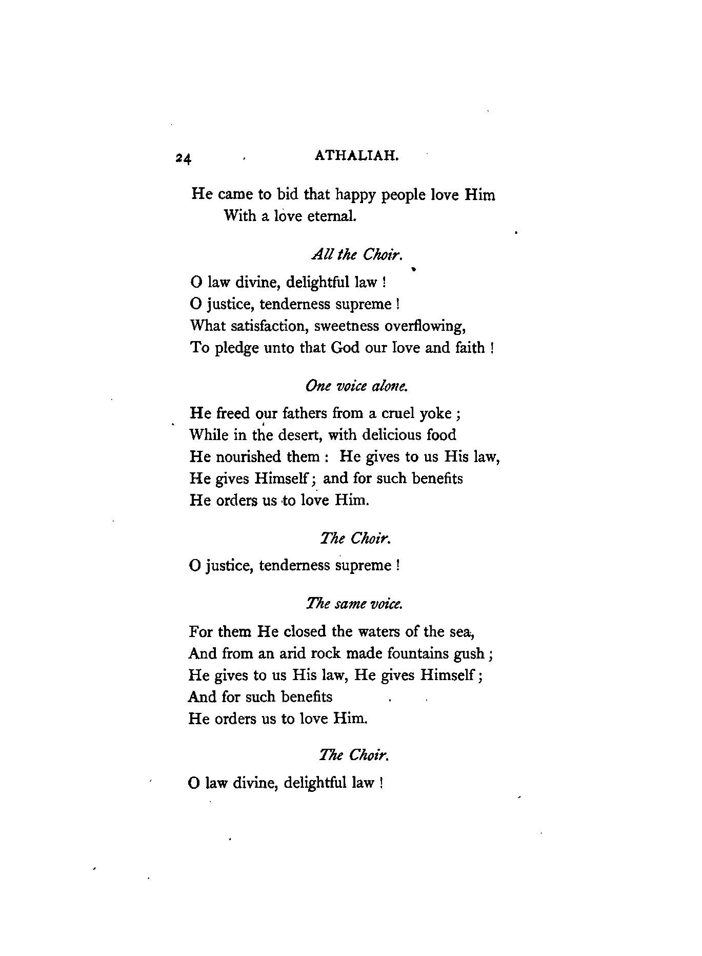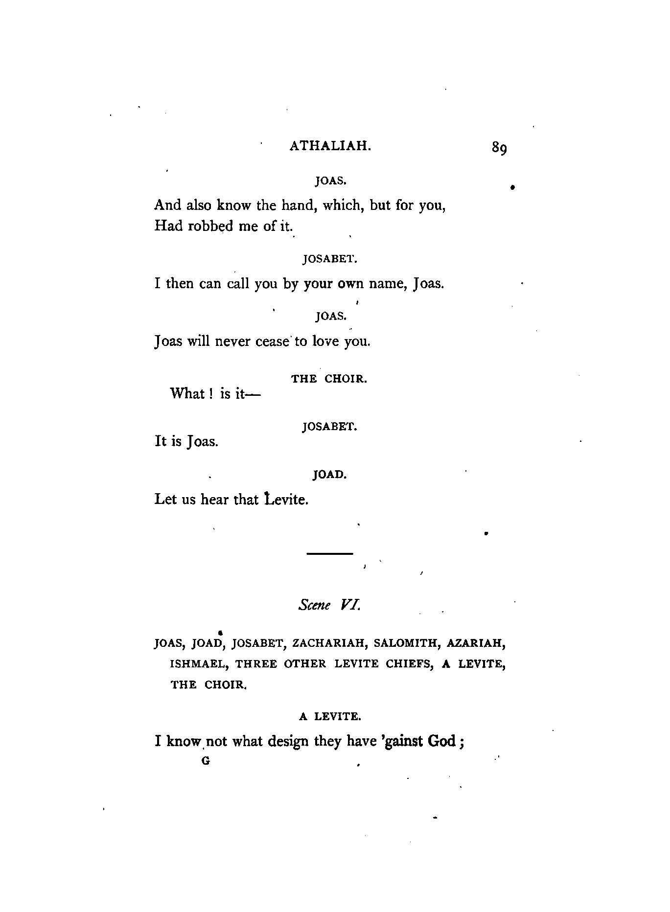 Racine, the author of Athalie (Athaliah), flourished in the latter half of the 17th century. At his appearance, Corneille, the great French Dramatist, was in the full splendour of his fame, whose rival he was afterwards recognised to be. Athalie is a Tragedy in rhyme, consisting of six Iambic feet, similar to the Alexandrine verse found occasionally in our English poets at the termination of a sentence or paragraph. Dryden, and a few others of less note, in the reign of Charles IL, introduced the rhyming drama to the English public; but the clank of its fetters was unpleasant to the British ear, which had become attuned to the freedom and majesty of blank verse. Blank verse, therefore, being our recognised vehicle of dramatic productions, has been employed in this translation. I did, however, intend in the first place to render the chorus into rhyme; but after maturer consideration it appeared to me that irregular blank verse would be more capable of tragic expression; and that it would also be more in harmony with the [4]Hebrew rhythm as represented by the scriptures, from which the plot was appropriated.