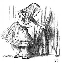 V'erano porte tutt'intorno alla sala, ma erano tutte serrate, e dopo che Alice andò su e giù provando tutti gli usci per vedere se fosse possibile d'aprirne qualcheduno ma sempre inutilmente, si mise a camminar mestamente nel mezzo della sala, pensando come mai avrebbe potuto riuscirne fuori.