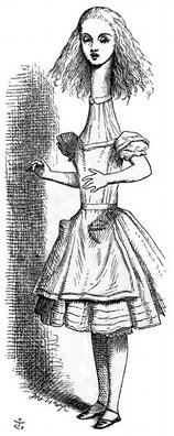 Ne mangiò un bocconcino, e mettendosi la mano sul capo, sclamò ansiosamente: "In qual modo? In qual modo?" per vedere in qual modo si mutava, ma restò molto sorpresa nel vedersi della stessa statura: certo, così accade a tutti coloro che mangiano pasticci, ma Alice s'era tanto[14] abituata a veder cose straordinarie, che le sembrava una cosa stupida e sciocca quella di crescere, come si cresce generalmente.