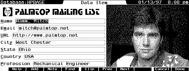 I could go on and on about the great applications and uses I've found for my 200LX, but you get the idea that it is an indispensable part of my life. Thanks, HP, for such a wonderful product and thanks to the palmtop community in general for being so friendly, informative and interesting.