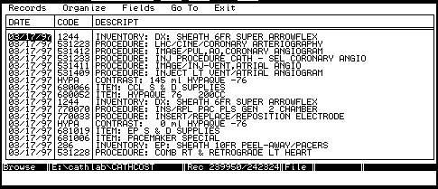 I store pcANYWHERE on the C: drive, leaving the slot available for the Megahertz modem (which I use interchangeably in my Toshiba notebook computer). With this configuration, Imp able to remotely access our dBase IV database applications. This has allowed me not only to open databases as large as 225,000 records and re-index them, but also navigate the menu-driven dBASE program we use to run the Cardiovascular Center (Screen 1).