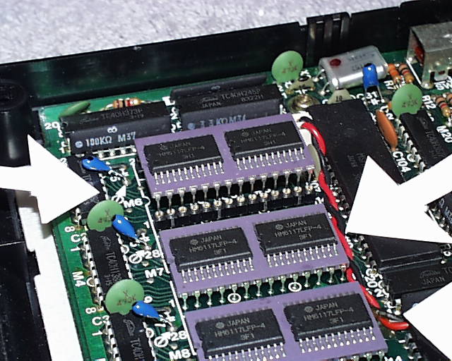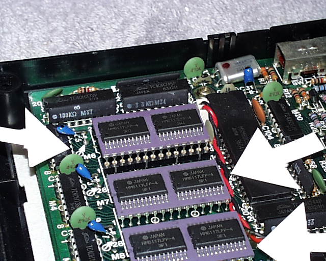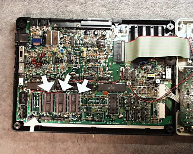With the case laid open on the famous Club 100 work bench (complete with towel), let's identify the RAM area. You will note three arrows pointing to RAM modules and one (albeit a bit hard to see) pointing to an empty socket. You are looking at a 24K Model 100. From right to left we have 8K, and them another 8K making it 16K, and them another 8K making it 24K. This particular motherboard was manufactured as a 24K unit but you will find 8K and 16K units in the field. And, believe it or not, there are some 32K units. These were the last Model 100's built. And then came the Model 102, but that's yet another story yet to be told.
