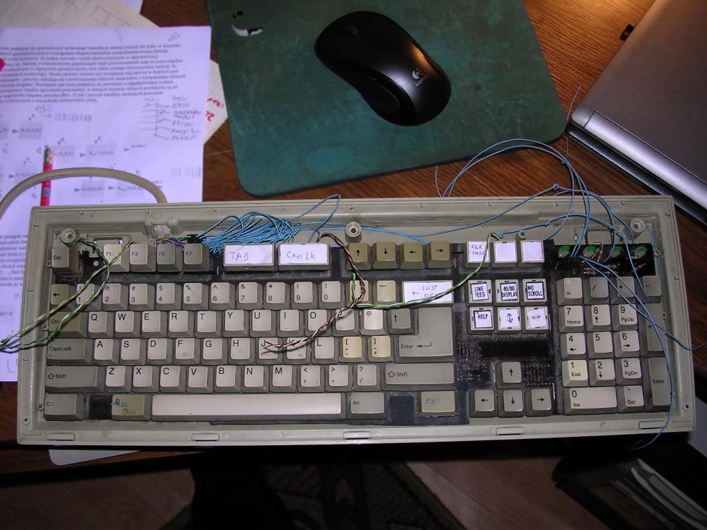 Finally after discovering that some switches are damaged, I decided to convert an old broken PC mechanical keyboard to C128 one. The keyboard had 4 damaged switches, so I replaced them with ones from my first attempt. Next, I've cut all tracks connecting keys and re-created matrix with wires. It was the most time-consuming process. I've tried to use logical switches and LEDs for 40/80, Caps and Shift Lock, but in my C128 5V supplied in pin 4 was so weak that it couldn't power all LEDs. So I've used a small bistable push buttons, as in Turbo switches in old PC cases, to switch 40/80, Caps and Shift Lock. I've installed these switches near main switches, used then to mechanically support key. It's working quite well. If you are looking for a good cable, look for printer cables. There are some parallel pinter cables with easily accessible inside of connectors. Most have pins 18-25 shorted to one wire, they won't be good, but some other cables have all 25 pins of DB25 connector conneced to 25 separate wires - these are good and can be used in keyboard.