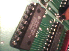 U7 is more complicated. 5V line goes on the component side from its pin 16, which must stay powered. So we flip the board back to the component side and look in pins 1 and 16 of U7. Unfortunately it's covered by the chip and this is the best photo I could do. The thing is to stick a knife just below pin 16 and try to cut this track coming down from pin 16. After some cutting check with ohmmeter is there a conductivity btween pin 16 and 2. If not - very good!,