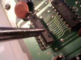 The first thing is to cut 5V blocking our address lines in multiplexers. They're pin 14 on U8 and pin 2 on U7. U8 is quite simple - just flip the board to solder side and you'll see 5V rail. Cut it as in picture (5V goes also to pin 16 and it must stay there to power the chip):