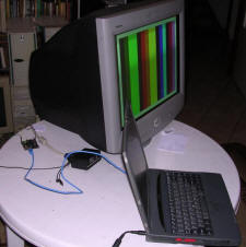 | Monitor, notebook and test picture generator, on the rear, the Arduino Uno board. | Rear of the display showing the drill and connection to Arduino module. |