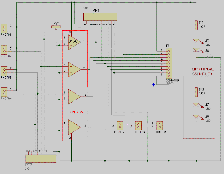 Our mouse must make square impulses as it's moved. Because our computer must know is it moved left or right, there must be two waves in phase, generated on two wires. To make these impulses we're using impulses generated by mouse's optomechanical part. And because we get only about 2.5V from it, we'll use a LM339 quad voltage comparator - which means it will put 5V on its output if the input voltage is greater than other voltage applied, and 0V if it's smaller. It will generate impulses from all optical detectors.