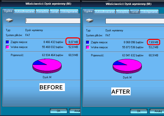 These pictures show space before and after re-formatting. Used space (marked with red rectangle) is smaller after re-formatting.