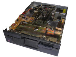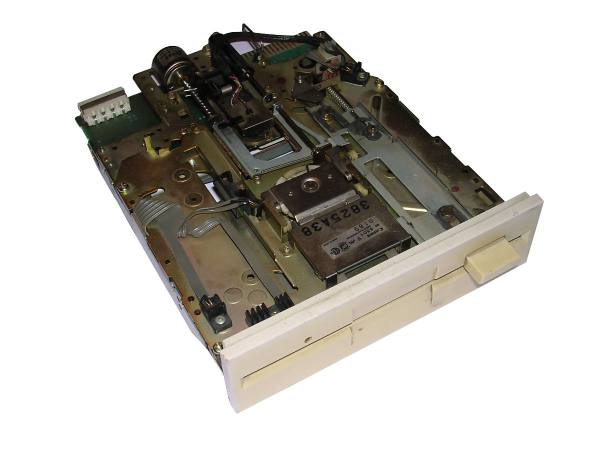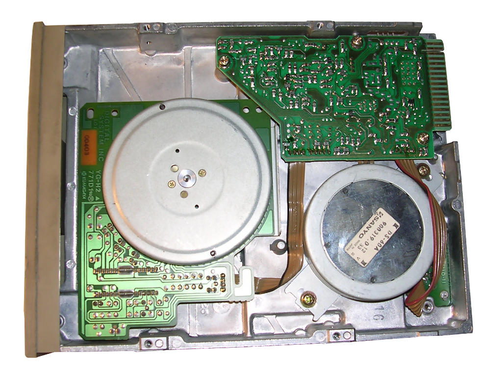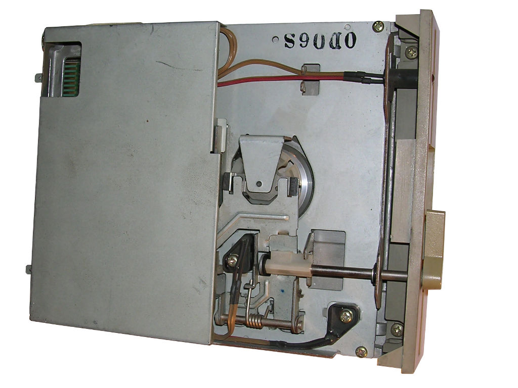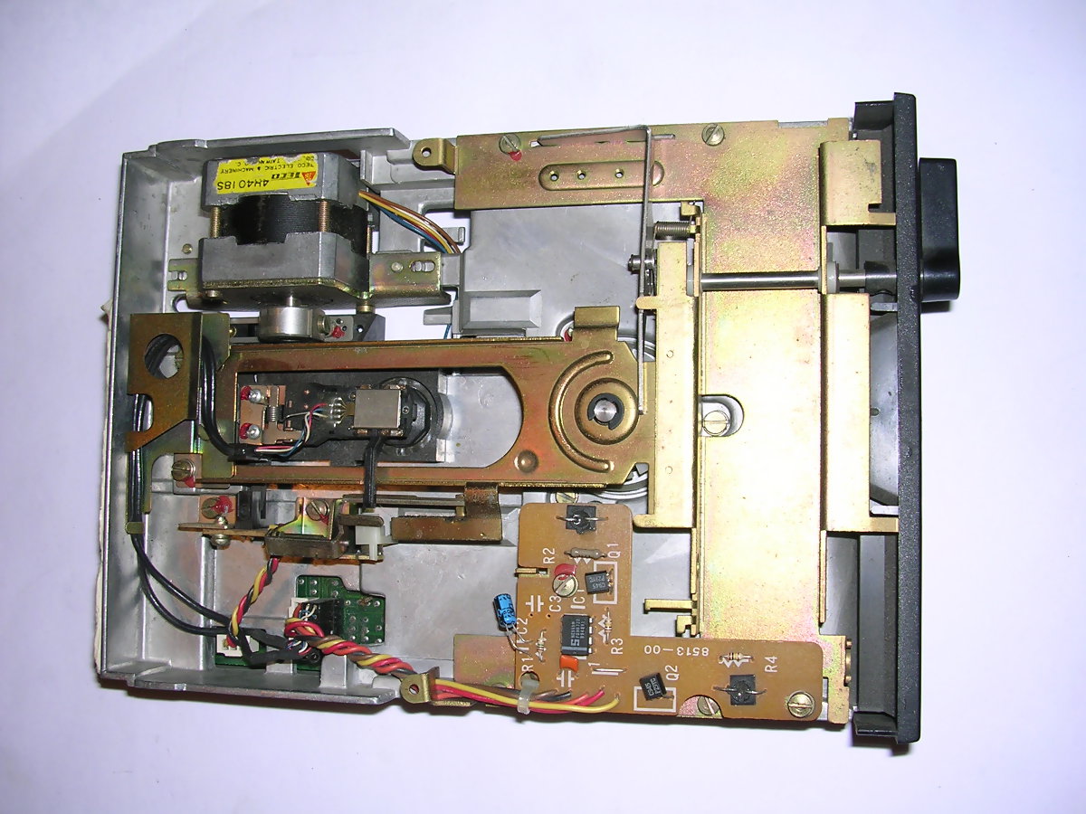 Here you'll see a few examples of 5.25" disks, drives and accessories. You can also look in PCs or 8-bit Micros, as they may have their own floppy disk drives. In these examples you can see what mechanisms are used in floppy drives to move head or disc itself.