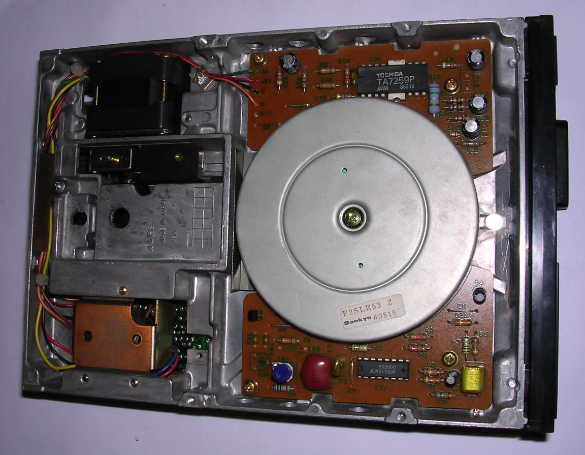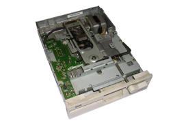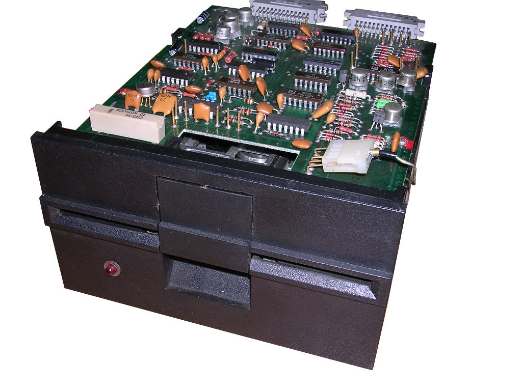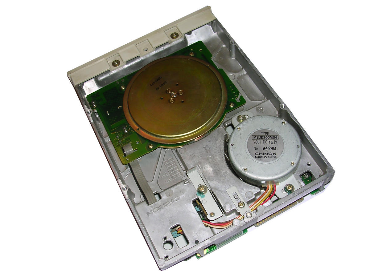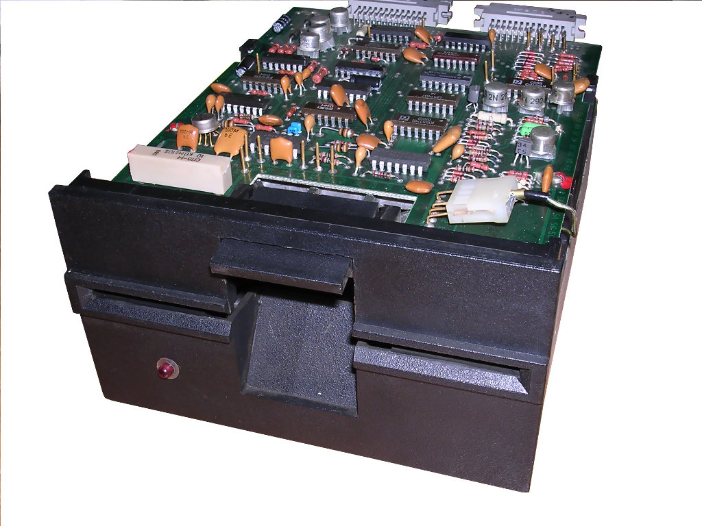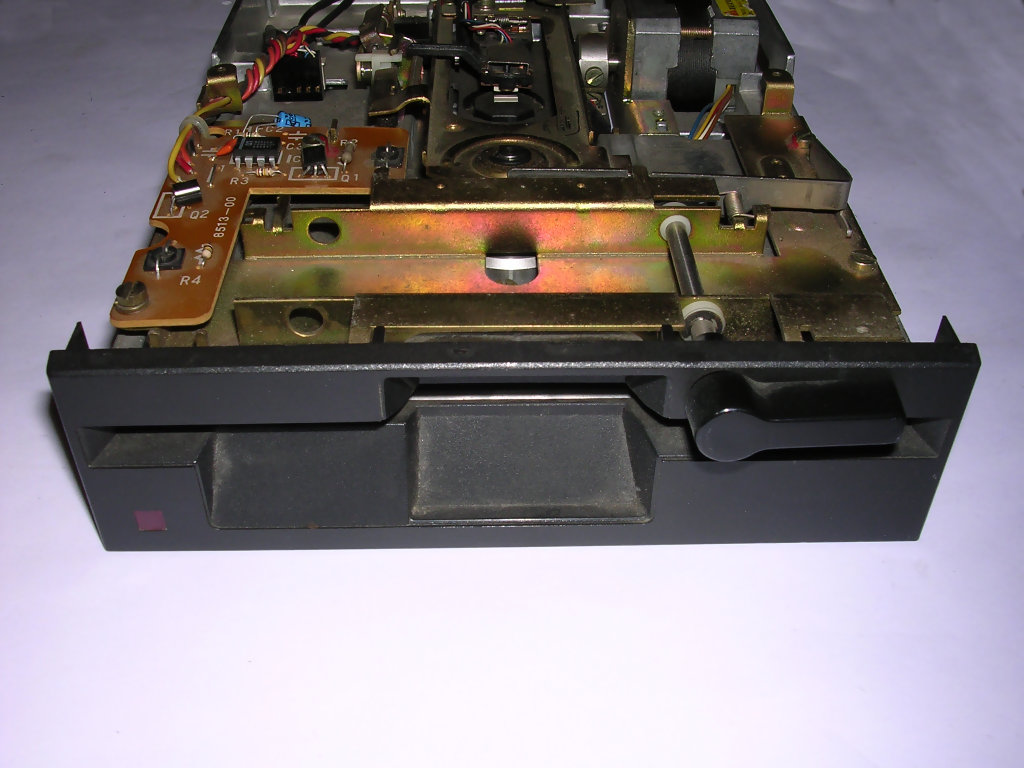 Here you'll see a few examples of 5.25" disks, drives and accessories. You can also look in PCs or 8-bit Micros, as they may have their own floppy disk drives. In these examples you can see what mechanisms are used in floppy drives to move head or disc itself.
