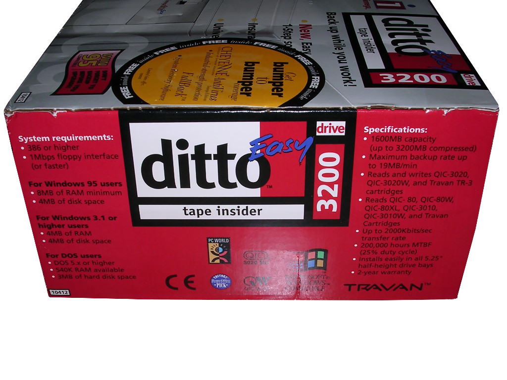 Ditto streamer was very similar to QIC-MC or Travan unit, and in fact it could read Travan tapes (could write only to Travan TR-3). It was another try to make a cheap streamer for an average home user. There was one problem: it was painfully slow. Streamers are slow, yes, but Ditto was much slower than others. 1MB/s, if you had luck: streamers like constant flow of data, and Ditto was prone to a "head polishing syndrome" in which the tape moves back and forth "polishing" the head because data transfer was too slow to write in constantly moving tape. As it was not much useful in standard consumer market (backup to one tape took too much time), it wasn't much popular. See here for compatibility chart.