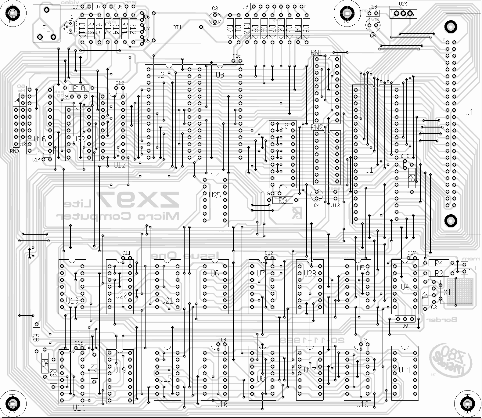 This placement sheet will help you to figure out what goes where. Remember to double-check for shorted tracks. During assembling IC sockets may require machining to fit over wires.