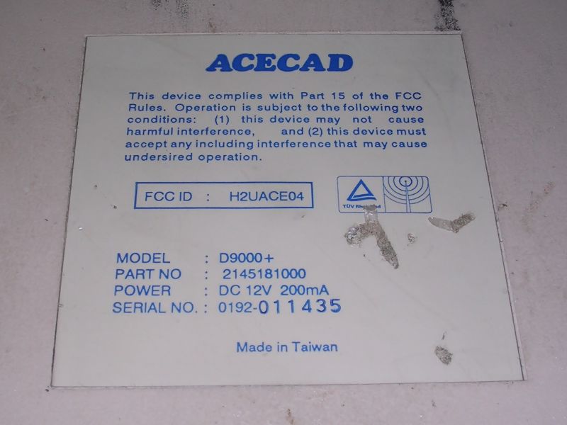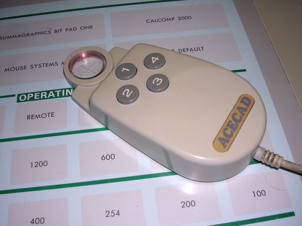 | Information: Tablet used with IBM PC to make interactions in CAD easier, allows to select objects and move them precisely. Two pointing devices can be connected. One is a 4-button mouse calibrated with RF, not ball, second one is probably a stylus. It can emulate a standard mouse or typical graphics tablets of early 1990s. Power supply: |