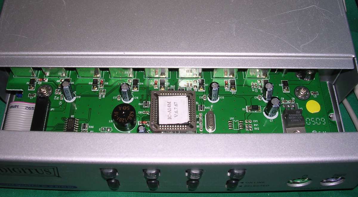 | Information: Another popular KVM, this time for 4 computers. The original one is probably Aten and Digitus is its Chinese clone. Although they look similar from outside, look that Digitus has different processor used, single one while Aten uses two proprietary chips. Keyboard and mouse console can be connected to the front panel and, if powering from keyboard connector is not sufficient, it may be powered from external power supply. Inputs can se switched with front panel buttons or by double-tapping ctrl key (or ScrlLock key in some configurations) |
