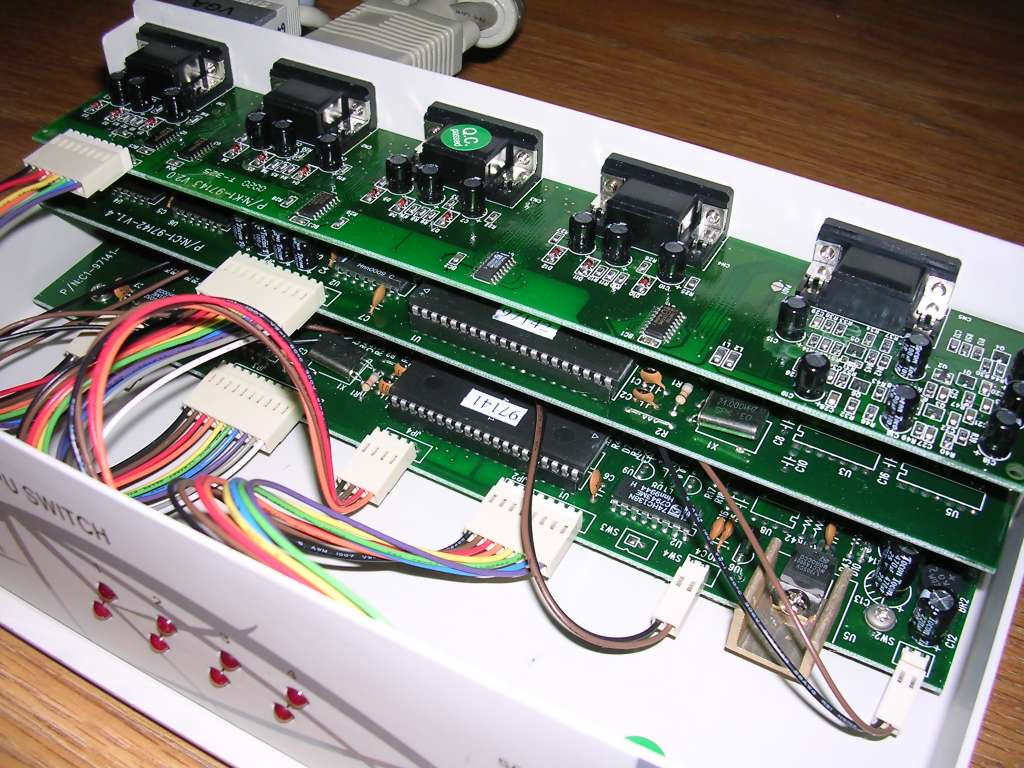 | Information: Mechanical KVM switches were made with the same technology as mechanical printer switches. They were around since 1980s and had all problems of mechanical switches plus one more - they had problems with high frequency VGA signals, making high-resolution picture's quality significantly worse. There are different versions, with DIN or PS/2 for keyboard, with mouse support or without. Inside, as always, a bunch of wires and mechanical switch. |