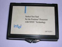 | Information: In second half of 1990s Pentium processors became more and more popular. Contrary to 486 boards, Pentium ones were made using a variety of chipsets utilizing totally different technologies. It was not easy to predict what processors are supported by what mainboard and manufacturers information was scarce after releasing board. For computer manufacturers needs, Intel released some testing tools to test will the mainboard run the specific Pentium processor. This one is for Pentium MMX - checks whether core voltage is proper, are the settings configured for 200MHz and is clock amplitude proper. It is inserted in socket and mainboard is started. The result can be read with green or red LEDs. This tool is professionally made mostly with SMD technology, but one interesting thing can be spotted on its bottom. |