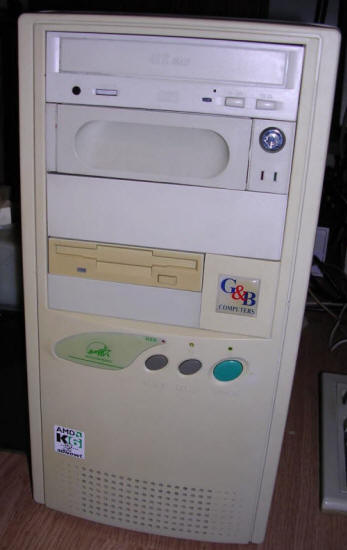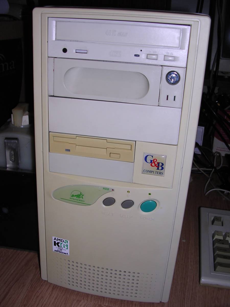 AMD K6-2 was a processor released mid-1998 as AMD's response for Intel's Pentium Pro and Pentium II architectures. These CPUs had 3DNow instruction set making it more powerful in some applications. This is a ca. 1998 machine with K6-2 processor and Tseng ET6000 video card - a PCI board which had better performance than typical S3 ViRGE these times, and in text mode display was just unbeatable. Additionally it has a hard drive drawer for backups. Unknown "G&B" sticker is present on casing.