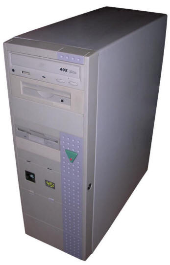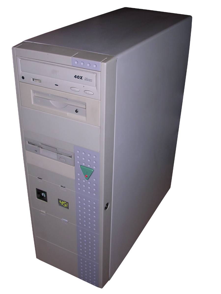 This is a highly multimedia-capable and graphics-capable PC from late 1990s, based on AMD K6-III processor. Although it has AT case and its mainboard is in AT form factor, it is capable of ATX and has AGP slot to connect fast graphics board. In times of late PEntium processors, AMD K6-III was a very expensive processor used then in computer graphics and multimedia. This computer has also an ATAPI ZIP drive. Its case is a bit large for AT one, and it requires quite long cables between mainboard and drives. However it looks very interesting, more like later ATX cases. It was made by TASK, a manufacturer which supplide many similar housings.
