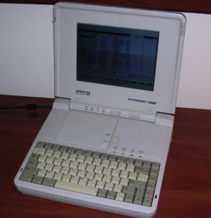 Zenith was a well-known computer brand (in late 1970s they acquired Heath known from theit Heathkit), in 1980s they made simple computers and CP/M machines, in 1985 they made their first portable PC (Z171). This laptop has 286 processor and 2.5" hard disk. It has true monochrome LCD with nice contrast and VGA-compatible graphics. Later Zenith SupersPort was released, which was bigger, but had bigger hard disk and modular battery expansion. Because battery packs in SupersPort could be stacked and expanded, it was used in US Army.