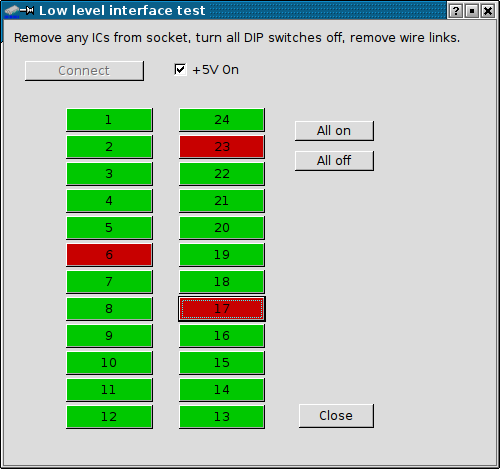 This tab is very important. As you've seen by looking at IC tester hardware, Tester's board has 4 DIP switches connected to power or ground, but it can support more with user settings. For example if you check many chips in 24-pin casings, and they need power connected to pin 24, you can use 5th DIP to connect power to pin 24. This window allows to define these additional switches and they're taken to account when suggesting you power configuration before test. Double-click on a selected DIP switch function to change what is connected to it: Power (Vcc) or ground (GND). There may be "empty" DIP switch too, it's just disconnected so it's only drawn as present, but not used. Then you have to specify socket's pin which is connected with this DIP switch. You can always revert to default setting by pressing Set defaults button.