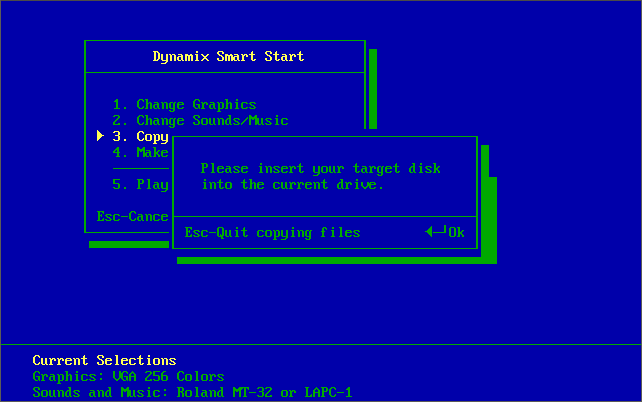 To configure the game's graphics and audio settings, use INSTALL.EXE. This is also used to install to hard disk or create backup copies of your original floppies: