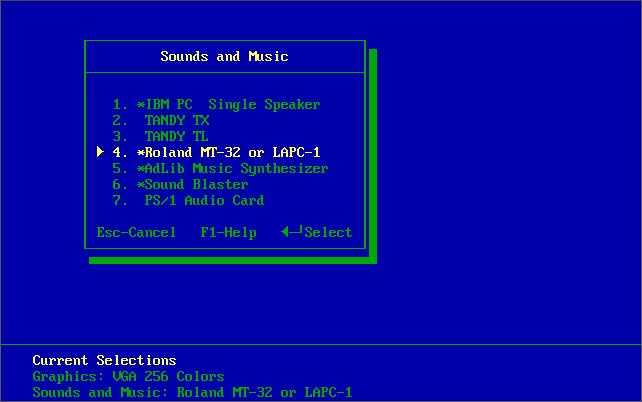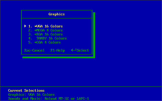 | System Requirements | Intel 8088/8086 CPU, 640 KB of RAM. 16-colour version: graphics support for Tandy/PCjr, CGA, EGA, and 4-colour MCGA. 256-colour version: graphics support for VGA only. Audio support for PC speaker, Tandy/PCjr, Tandy DAC, Thunderboard, PS/1 Audio Card, Ad Lib, Sound Blaster, Pro Audio Spectrum and Roland MT-32/LAPC-I. Keyboard, joystick and mouse supported. |