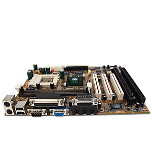 The three memory slots support up to 256 MB DIMMs, up to PC100 speed. They support both synchronous and asynchronous DRAMs.