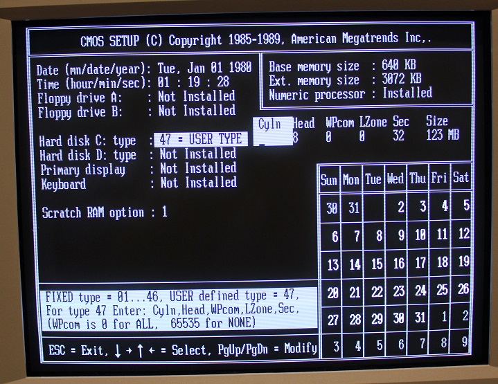 Once again, I started the process by putting the card into a modern PC via a CF card USB reader - it successfully detected the drive, which is formatted with the FAT file system and is 128 MB in size, just like the Lexar. I then moved it to my main Pentium retro PC and told its WinBIOS to auto-detect the drive, just like I'd done with the Lexar. This one is a tad smaller, with 980 cylinders, 8 heads and 32 sectors per track.