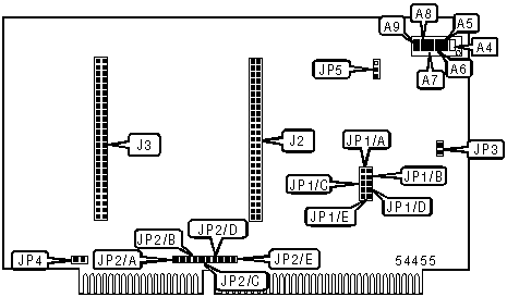 Note: A total of 64 base address settings are available. The switches are a binary representation of the decimal memory addresses. A9 is the Most Significant Bit and switch A4 is the Least Significant Bit. The switches have the following decimal values: A4=16, A5=32, A6=64, A7=128, A8=256, A9=512. Turn off the switches and add the values of the switches to obtain the correct memory address. (Off=1, On=0) | ||||||
