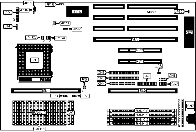 32-bit PCI slots (2), floppy drive interface, green PC connector, IDE interfaces (2), parallel port, PS/2 mouse port, serial ports (2), cache slot, VGA slot, PISA slot