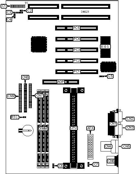 32-bit PCI slots (5), floppy drive interface, green PC connector, IDE interfaces (2), parallel port, PS/2 mouse port, serial ports (2), IR connector, USB connectors (2), ATX power connector, AGP slot |