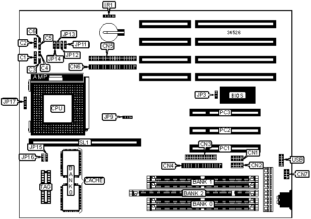 32-bit PCI slots (3), floppy drive interface, green PC connector, IDE interfaces (2), parallel port, PS/2 mouse interface, serial ports (2), cache slot, IR connector, USB connector