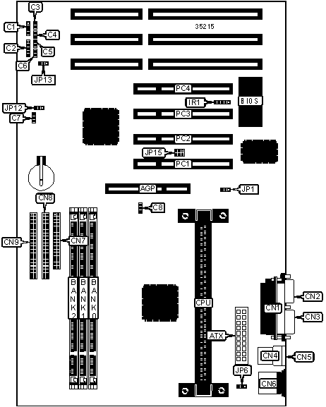 32-bit PCI slots (4), floppy drive interface, IDE interfaces (2), parallel port, PS/2 mouse port, serial ports (2), IR connector, USB connectors (2), ATX power connector, AGP slot |