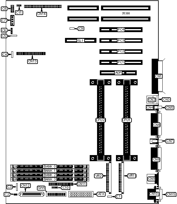 32-bit PCI slots (4), floppy drive interface, game/MIDI port, IDE interface, Ultra SCSI interface, Wide Ultra Wide SCSI interface, parallel port, PS/2 mouse port, serial ports (2), VRM connectors (2), USB connectors (2), ATX power connector, AGP slot, line in, line out, microphone in, audio in – CD-ROM, RAID slot |