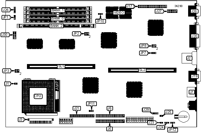 Note: Board accepts EDO memory. Board also accepts x 32 SIMMs. Banks are interchangeable. | ||