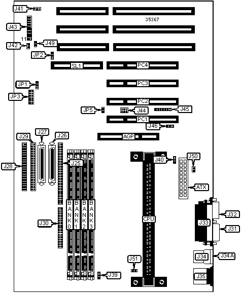 32-bit PCI slots (4), floppy drive interface, IDE interfaces (2), SCSI interface, Wide Ultra SCSI interfaces (2), parallel port, PS/2 mouse port, serial ports (2), IR connector, USB connectors (2), ATX power connector, AGP slot, RAID slot